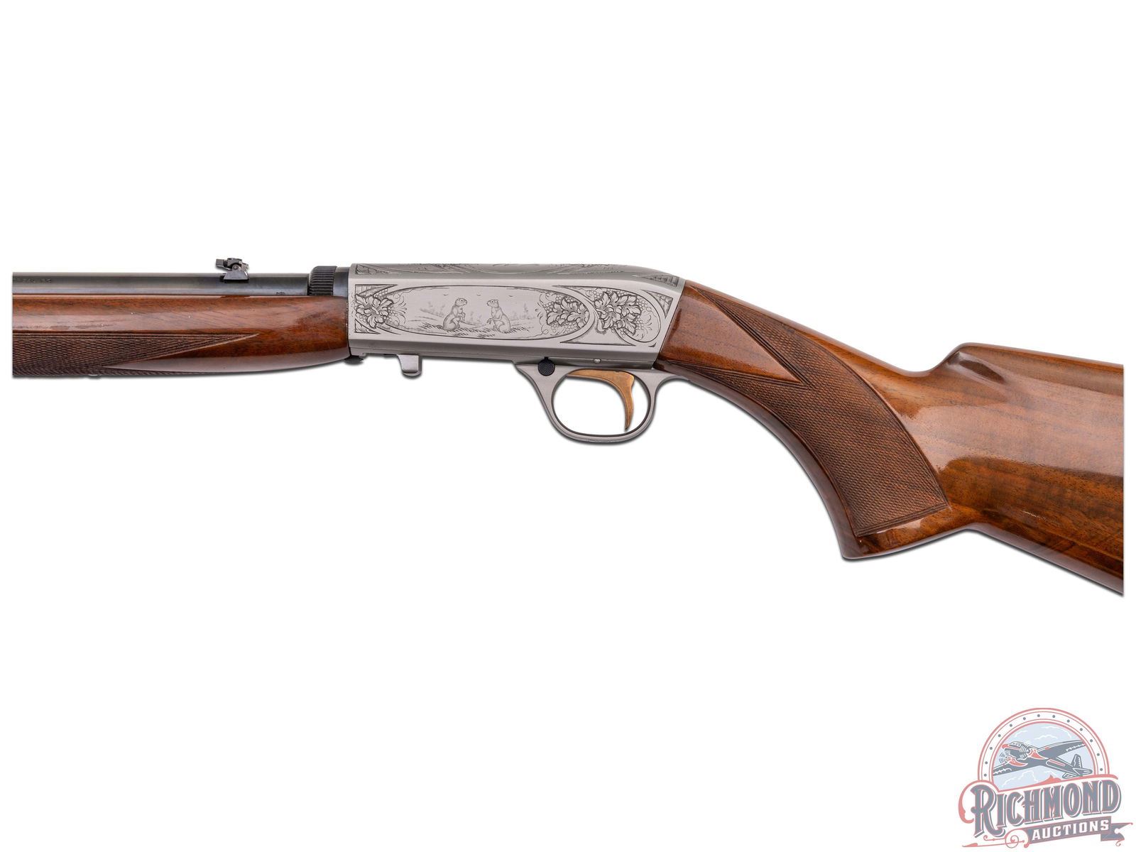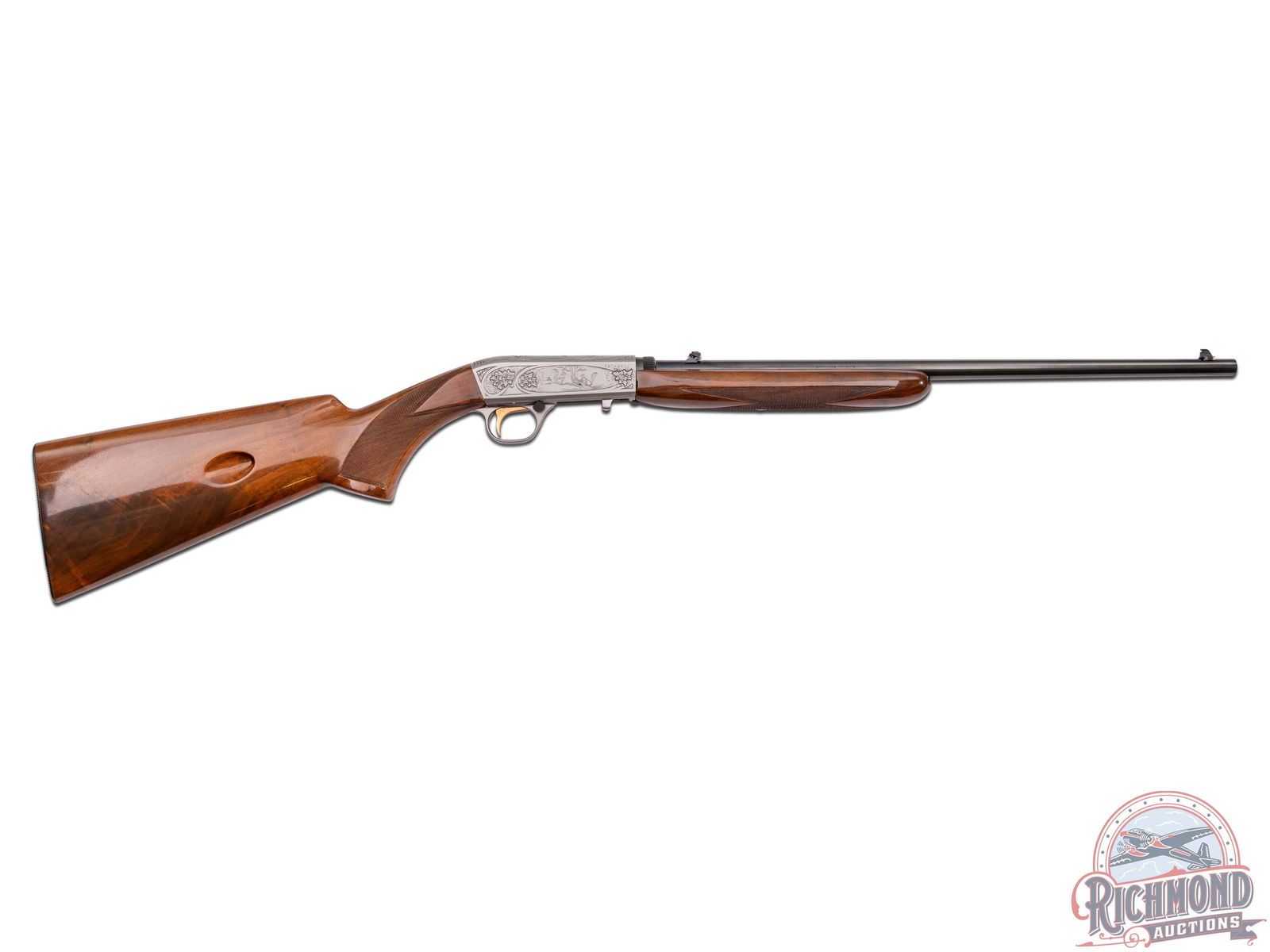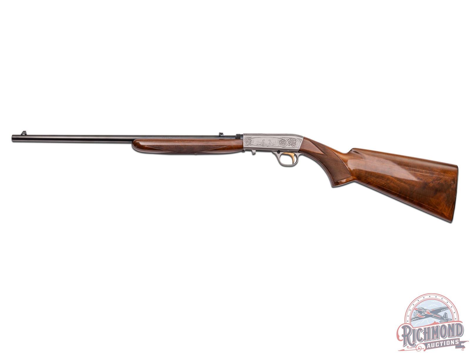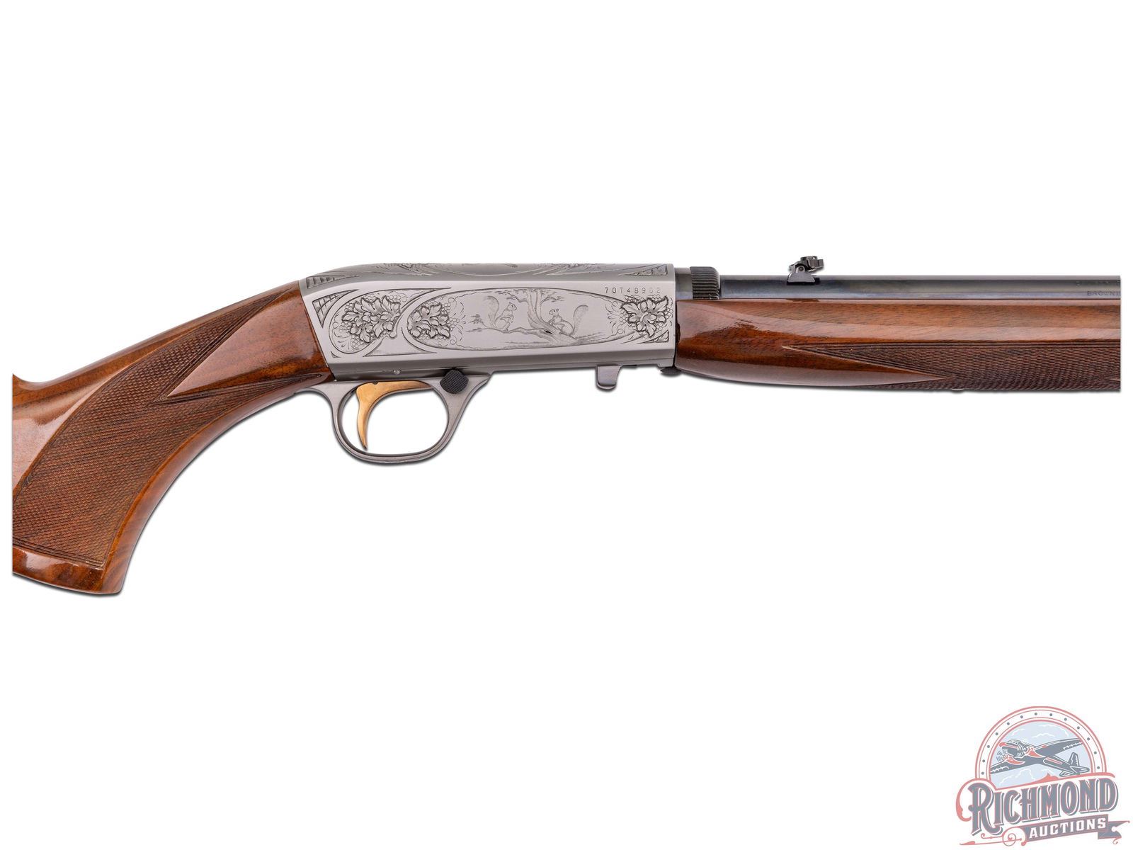 Made in Herstal, Belgium by Browning in 1970. 19-1/4" blued round fluid steel barrel with bead pedestal front sight, rear flip sight, Browning Utah and Montreal Addresses and Factory drilled and plugged scope holes. Satin finished takedown action with Grade II squirrel and prairie dog panel scenes with top engraved with floral and flying duck scene marked with engraver's initials "J.L.". Action has gold washed trigger and blued push button safety. Figured walnut checkered pistol grip stock with blued steel serrated butt plate, sideloader port, and tubular magazine in butt. Matching walnut checkered swelled forearm. LOP: 13-3/4". DAC: 1-3/16". DAH: 2-5/8". CALIBER: 22 LR. S/N: 70T48902. FFL STATUS: Curio & Relic.