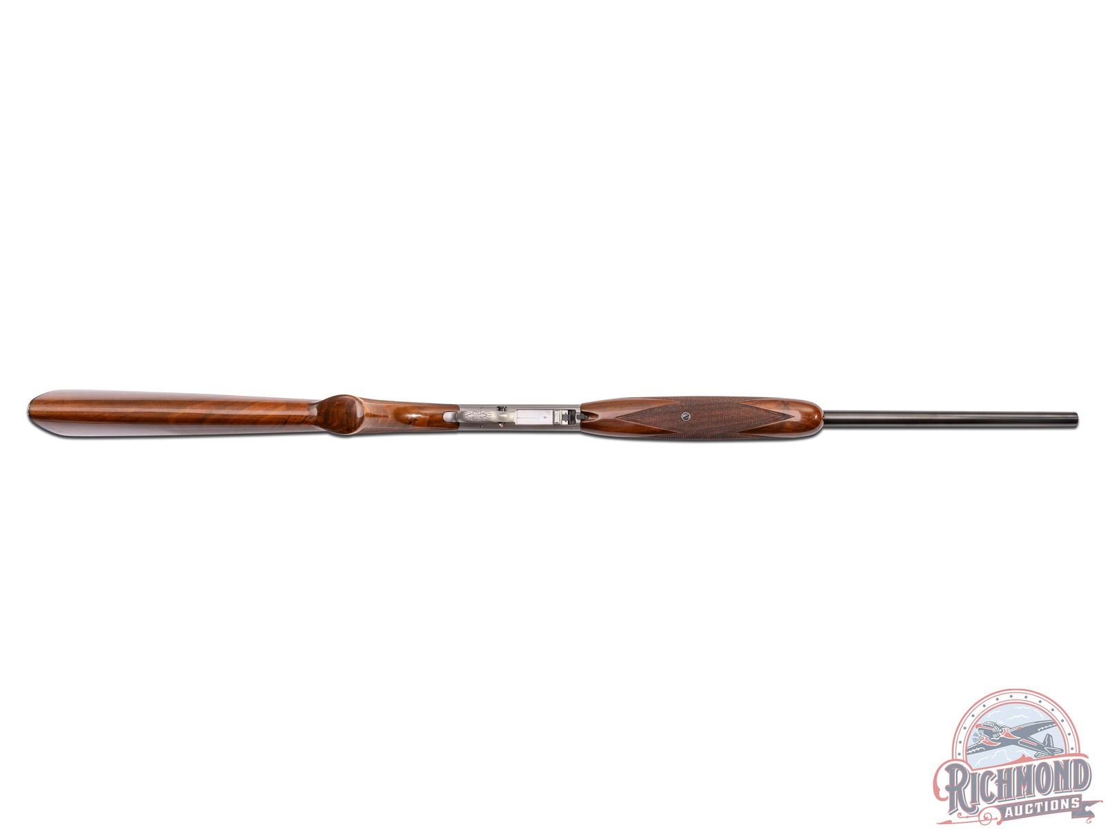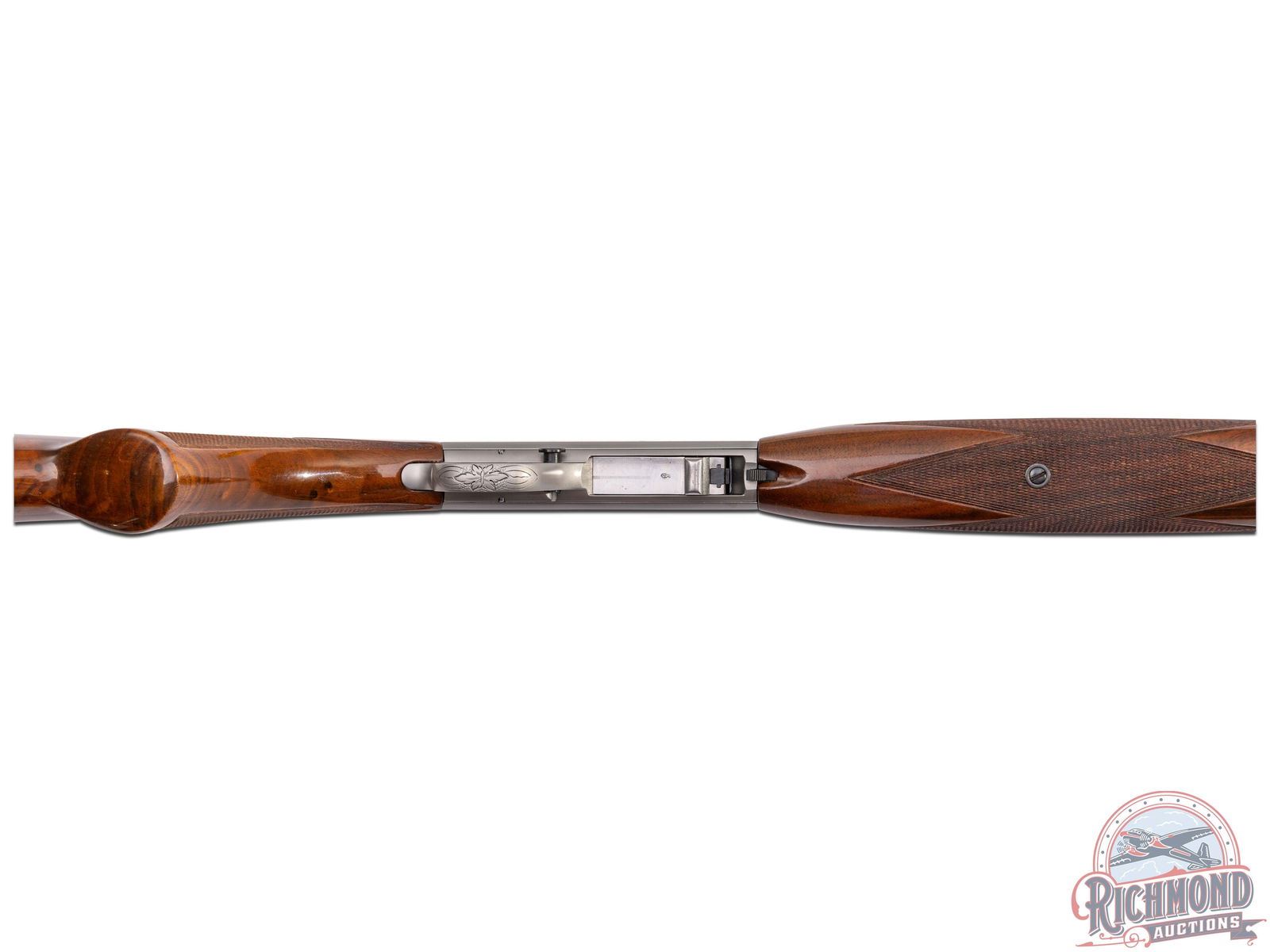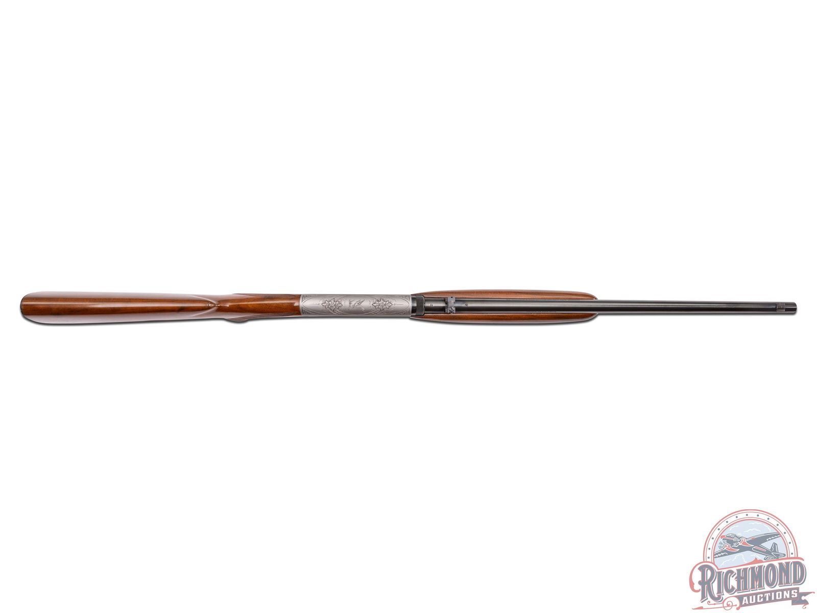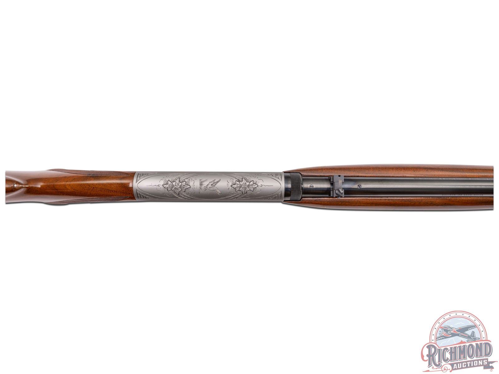 Made in Herstal, Belgium by Browning in 1970. 19-1/4" blued round fluid steel barrel with bead pedestal front sight, rear flip sight, Browning Utah and Montreal Addresses and Factory drilled and plugged scope holes. Satin finished takedown action with Grade II squirrel and prairie dog panel scenes with top engraved with floral and flying duck scene marked with engraver's initials "J.L.". Action has gold washed trigger and blued push button safety. Figured walnut checkered pistol grip stock with blued steel serrated butt plate, sideloader port, and tubular magazine in butt. Matching walnut checkered swelled forearm. LOP: 13-3/4". DAC: 1-3/16". DAH: 2-5/8". CALIBER: 22 LR. S/N: 70T48902. FFL STATUS: Curio & Relic.