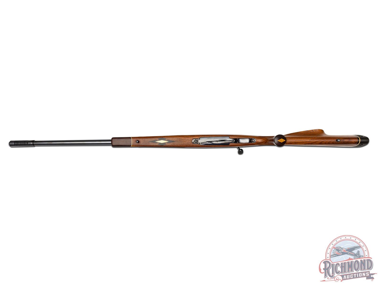 Receiver manufactured circa 1952 with an unmarked 23" barrel that was added at a later date. Slotted muzzle break is attached to the muzzle. Professionally redone, blued finish with jeweled bolt. Custom walnut stock with fine cut checkering on the wrist and forearm. Right hand shooter check piece with inlays on each side of the action, bottom of the wrist and right side of the butt. Capped pistol grip and forearm with metal sling swivels. Black rubber butt pad. Weatherby Imperial 2-3/4x90 scope sitting on Buehler mounts. This is a possible Roy Weatherby custom build. LOP: 13-1/2". CALIBER: 416 Rigby. S/N: 217576. FFL STATUS: Curio & Relic.