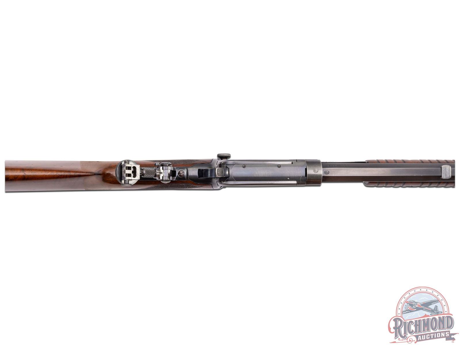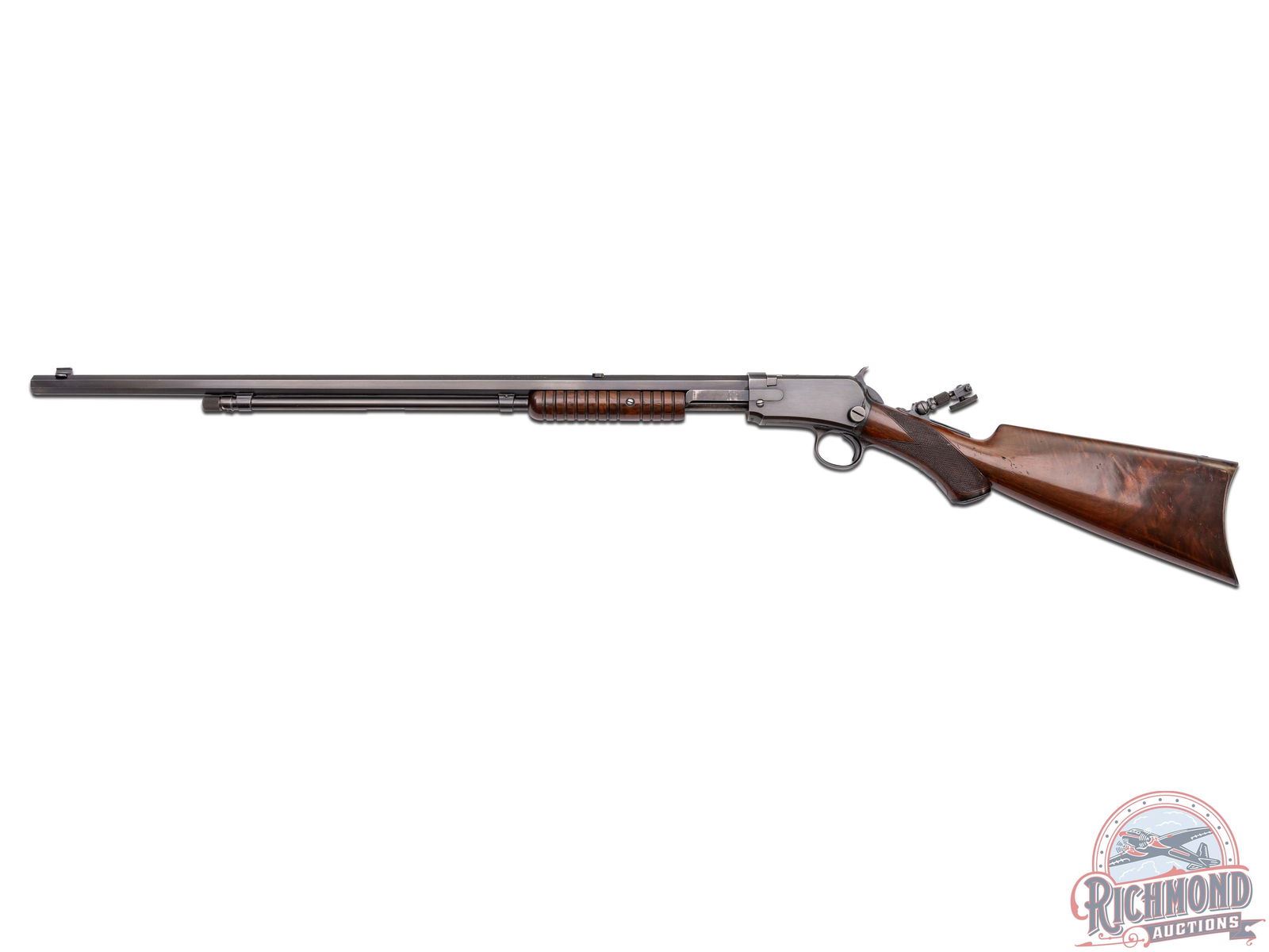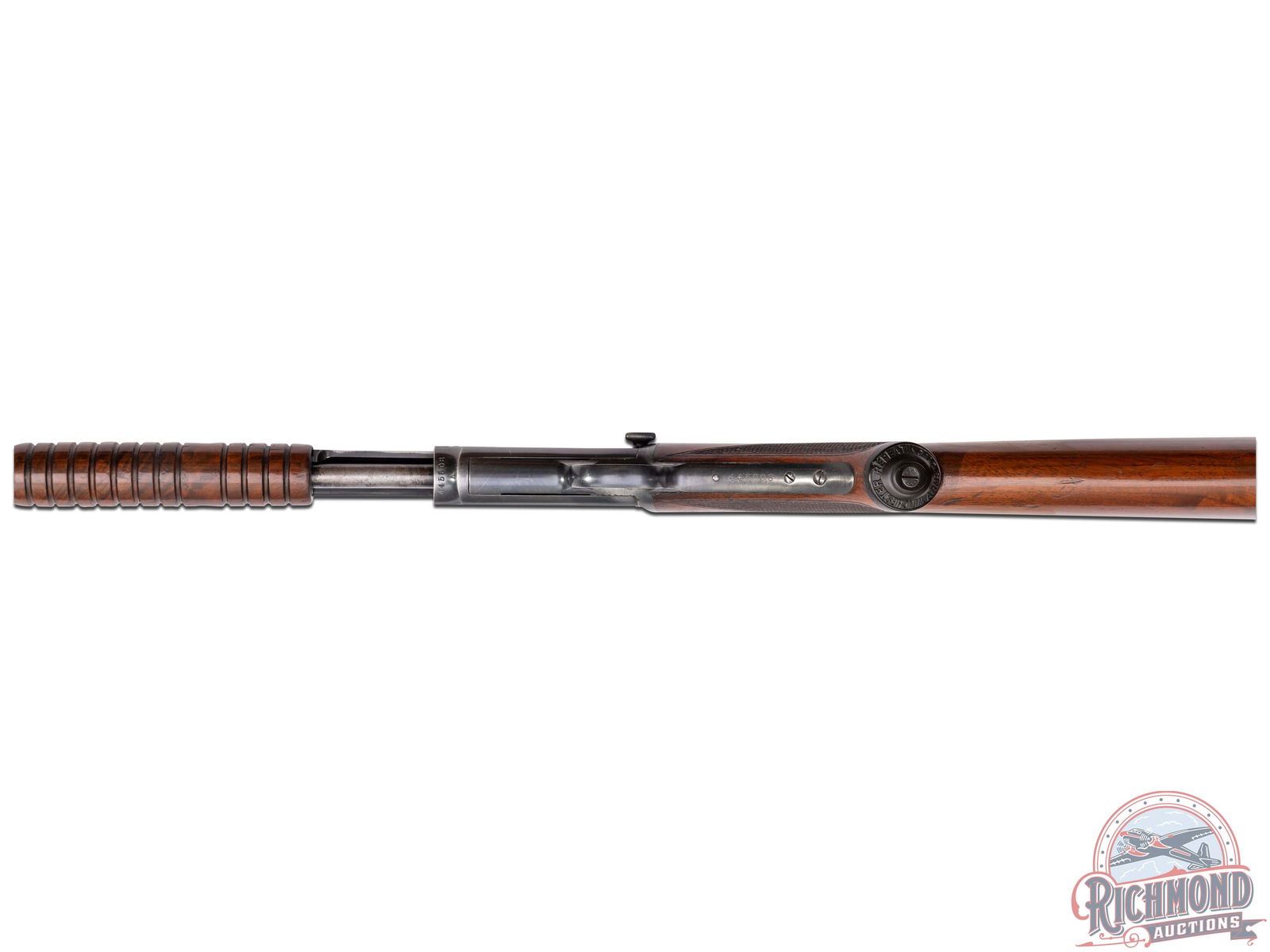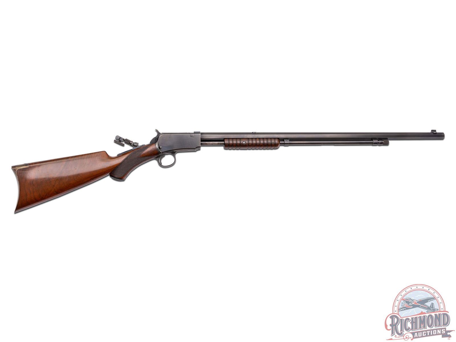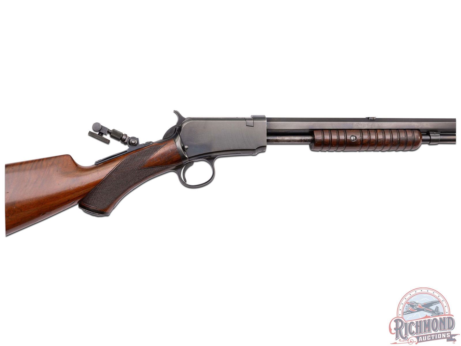 Manufactured in 1910. Features a 24" octagon barrel with a tang mounted Lyman peep sight and blade front sight with nickel bead. Barrel is stamped with the two line Winchester address on the left side flat. Caliber "22 W.R.F." stamped near the receiver as well as Winchester proof marks on barrel and receiver. Matching serial number stamped under the receiver and rear of trigger guard. Nicely figured walnut deluxe wood stock with hand-checkered pistol grip fitted with a factory Winchester pistol grip cap. Crescent case colored butt plate with brass gate and includes field cleaning rods. Twelve line ribbed walnut foregrip / slide. Deluxe 1890 models are hard to come by in this great of condition! CALIBER: 22 WRF. S/N: 445608. FFL STATUS: Curio & Relic.