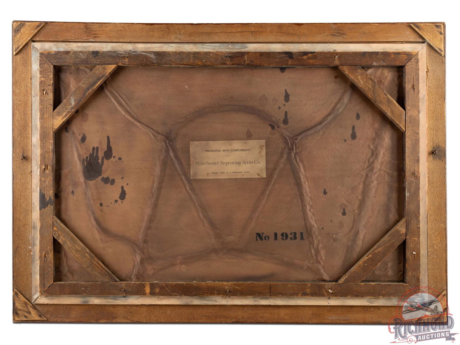 Winchester Repeating Arms Company Double "W" cartridge board made in 1897 for major Winchester Sporting Goods Dealers. Board measures 40" x 58 1/2" with A.B. Frost hunting and game scenes. Board has all the shells loaded at the time which amounts to well over 100 cartridges with wads and primer displays. Board is numbered on back "No. 1931" with standard oak frame.