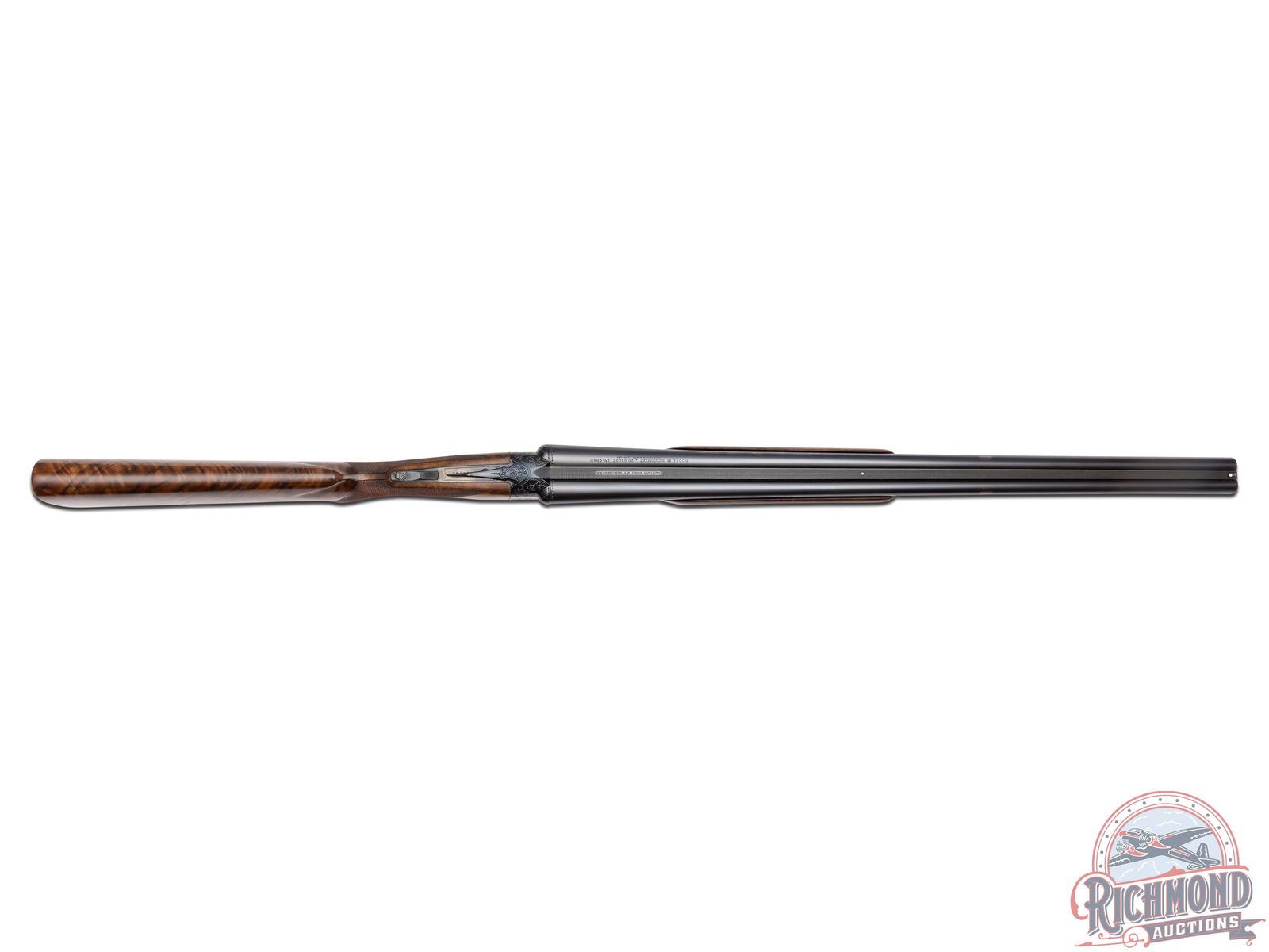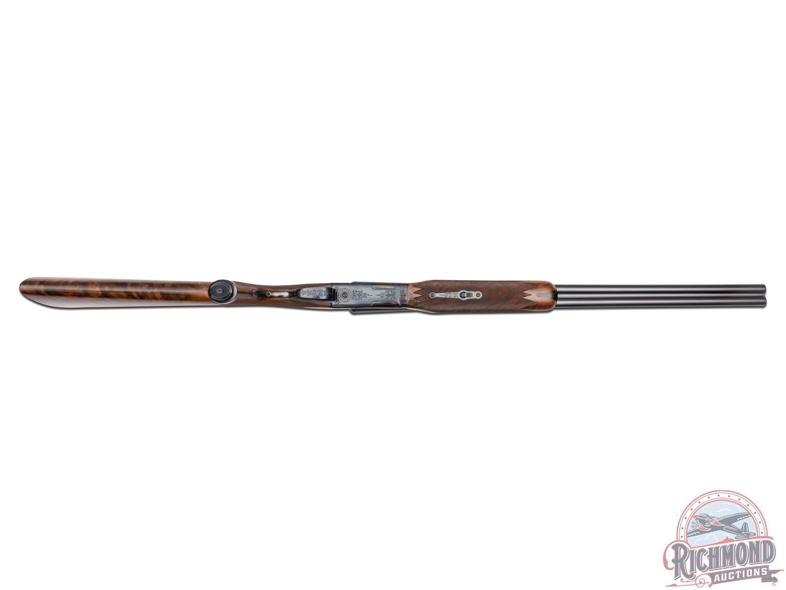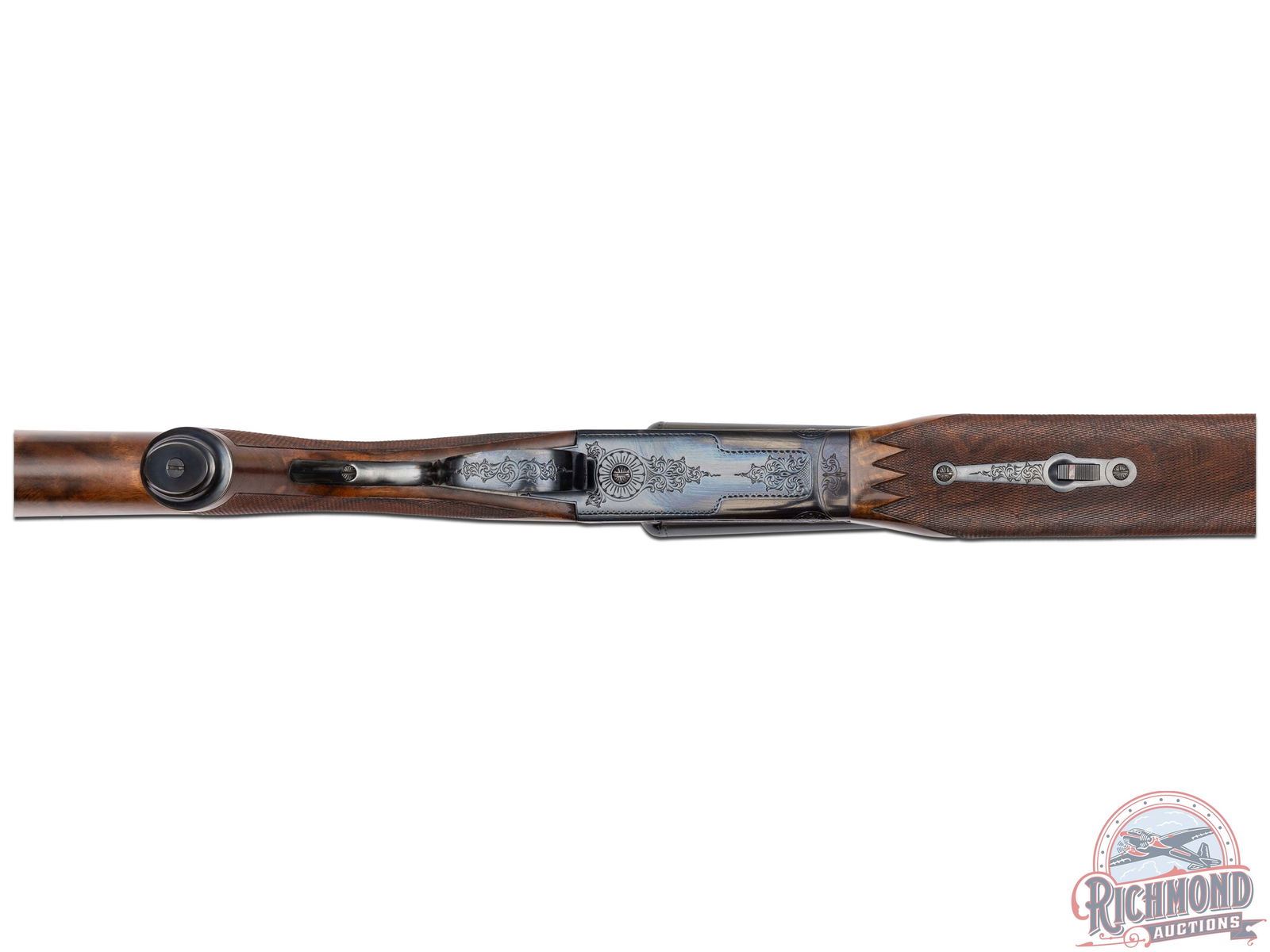 Made by Winchester Repeating Arms in 1974. Gun is fitted with 26" blued Winchester Proof Steel barrels in 20 Gauge with 2-3/4" chambers, ejectors, ivory bead front sight and middle sight, matted rib marked "Custom Built by Winchester" with WS-1 and WS-2 chokes. Left top barrel is marked with "Model 21 Winchester 20 Gauge 2 3/4 Cham/Address". Blued "Flatside" action with No. 1 style factory engraving, gold washed single selective trigger and non-automatic safety. Select Feathercrotch walnut pistol grip checkered stock with checkered wood butt and plain blued steel grip cap. Matching Skeet style beavertail forearm with floral engraved blued roller latch. Gun comes in original style two piece box with red Winchester markings, cardboard inserts, Model 21 hanging tag and 21 instruction sheet. Cody factory research verifies all options. LOP: 14". DAC: 1-9/16". DAH: 2-1/2". CALIBER: 20 GA. S/N: W22150. FFL STATUS: Curio & Relic.