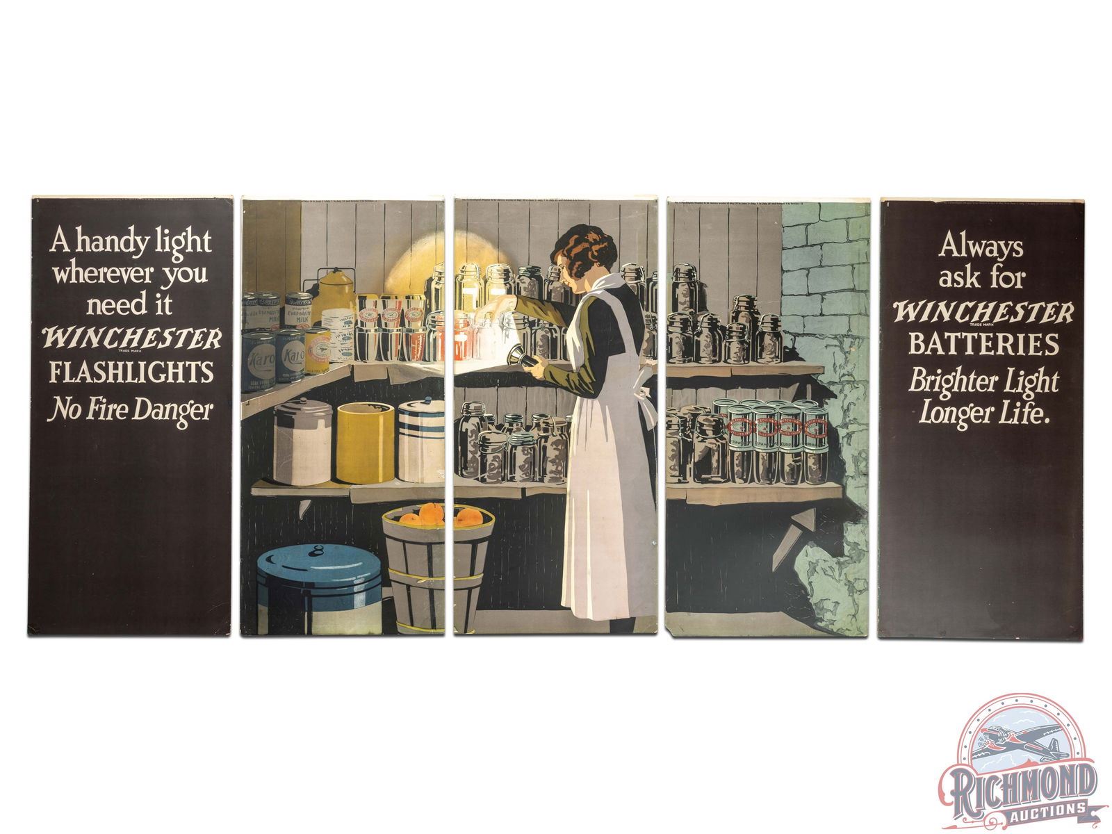 Complete double sided Winchester five panel display. Front side features the "Better Trapshooting" scene with multiple shotguns/shotshell boxes and was displayed from May 12-18, 1921 and used again from June 9-15, 1921. The reverse graphic features the "A Handy Light" scene with flashlights/batteries and was displayed May 26 to June 1, July 7-13 and October 6-12, 1921. Panels have very good color with creases, areas of loss around the edges/corners, a few touch ups and areas of discoloration. This is an earlier example of a tough to fine complete five panel display. 39.5" H x 92.5" W.