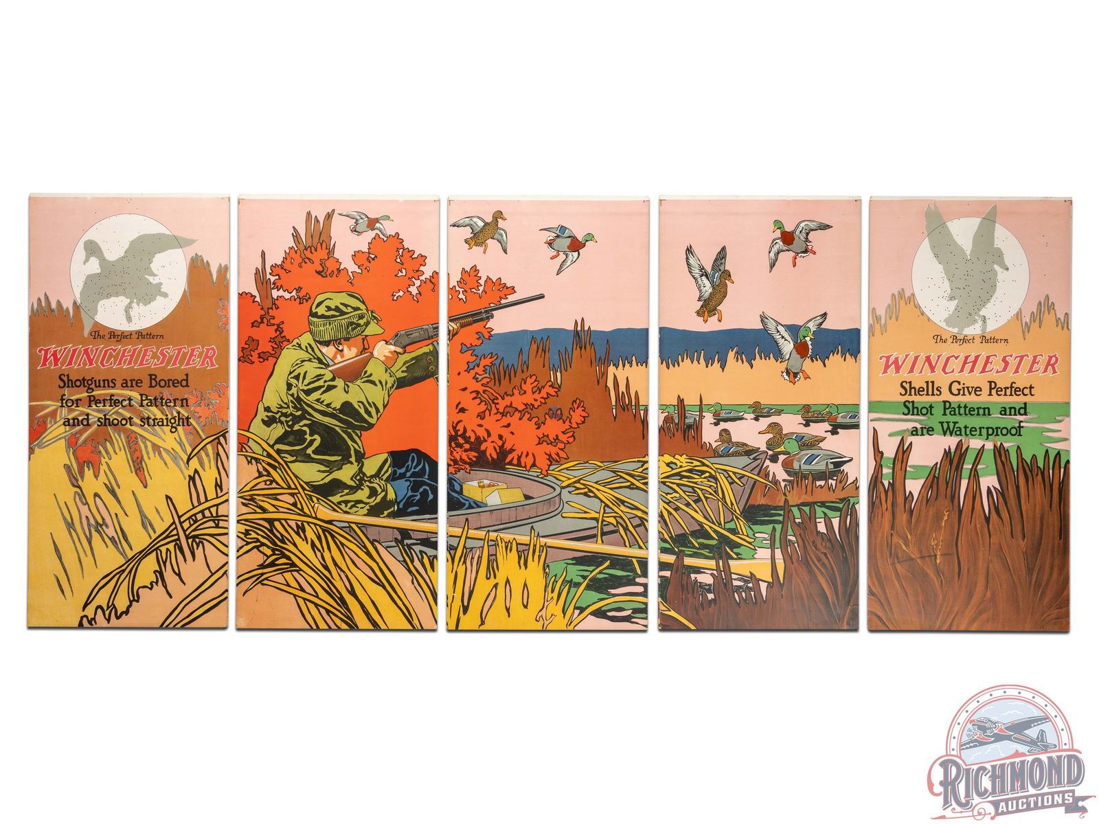 Excellent and complete double sided Winchester five panel display. Features the "Duck Hunting From Boat" scene with amazing graphics and advertisements for Winchester shotguns and shotshells. Displayed from October 14-20, 1920. The reverse features the "Stoves & Heaters" scene with a colorful graphic of a family beside their heater. Displayed from October 21-27, 1920. Overall a very good example. Panels have excellent color with a few creases, areas of edge and surface wear, very minor rips, and areas of discoloration. This is an early example from the initial seven months of the five panel display usage which lasted through 1928. 39.5" H x 92.5" W.