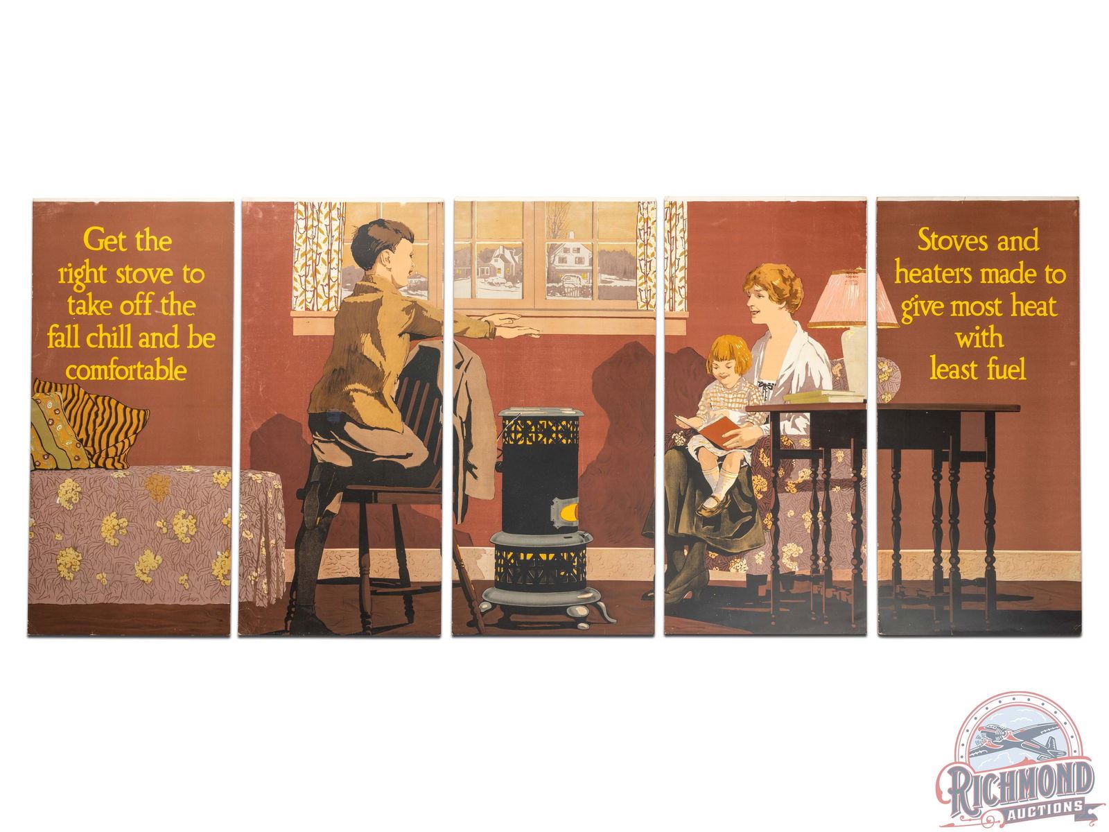 Lot 708 Early & Complete 1920 Winchester "Duck Hunting From Boat" & "Stoves & Heaters" 5 Panel Display Sign