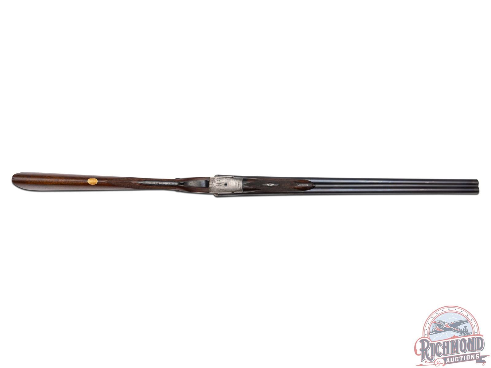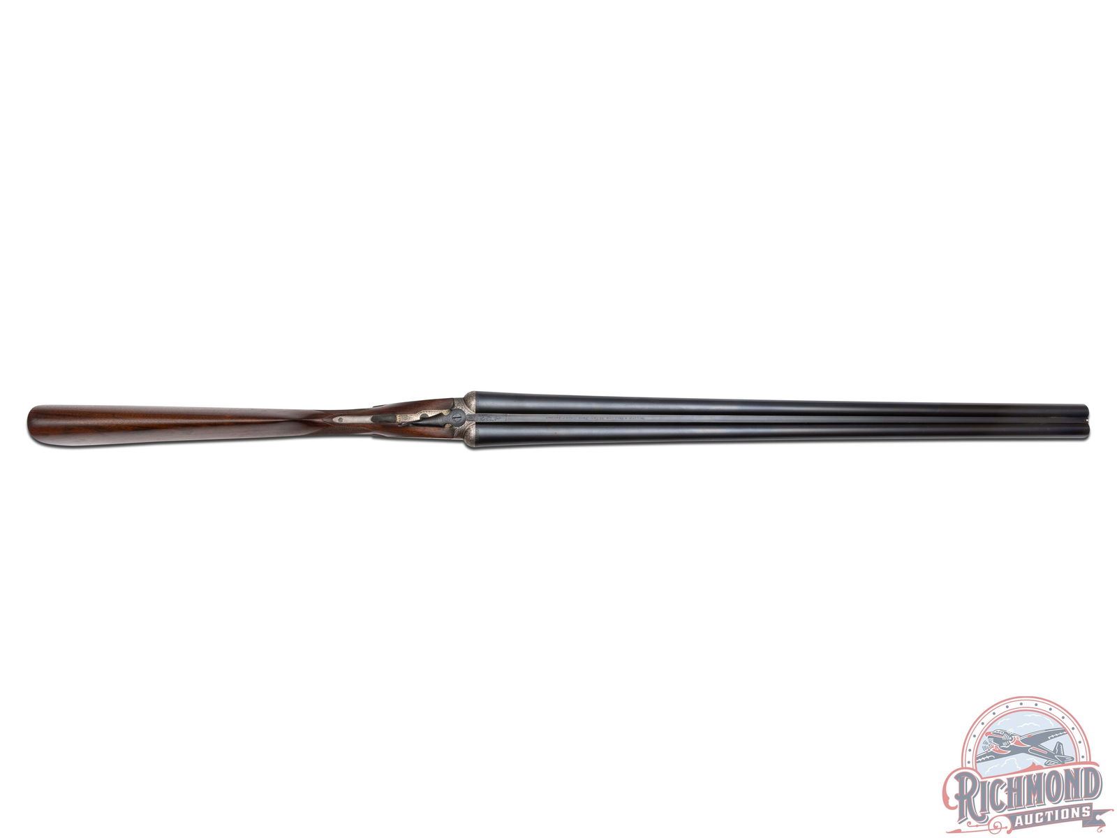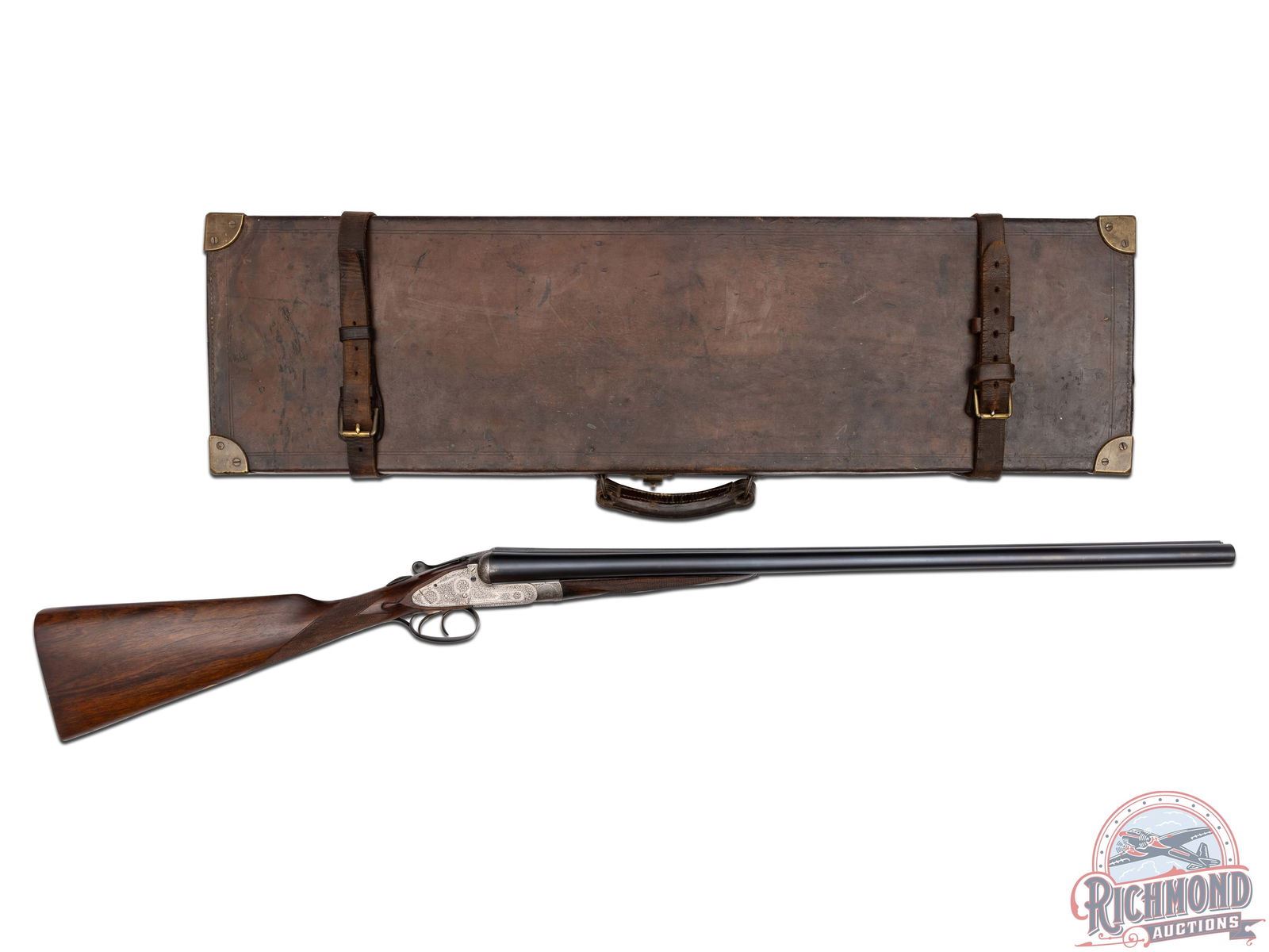 98% reapplied barrel blue with light handling marks. Action has been cleaned to a silvery patina with screws and trigger guard having reapplied finish. Stock has been professionally cleaned and checkering re-chased. Case is in fair condition with some staining and some scuffs and marks. Gun has very good dimensions with mirror bores, tight lock-up, and great mechanics. This gun would be an excellent gun to shoot in a Vintage Shotgun Shoot.