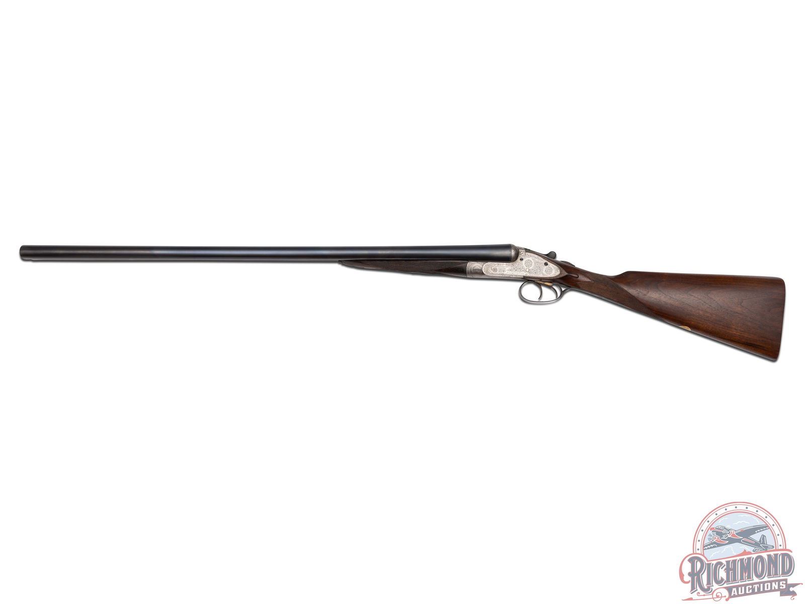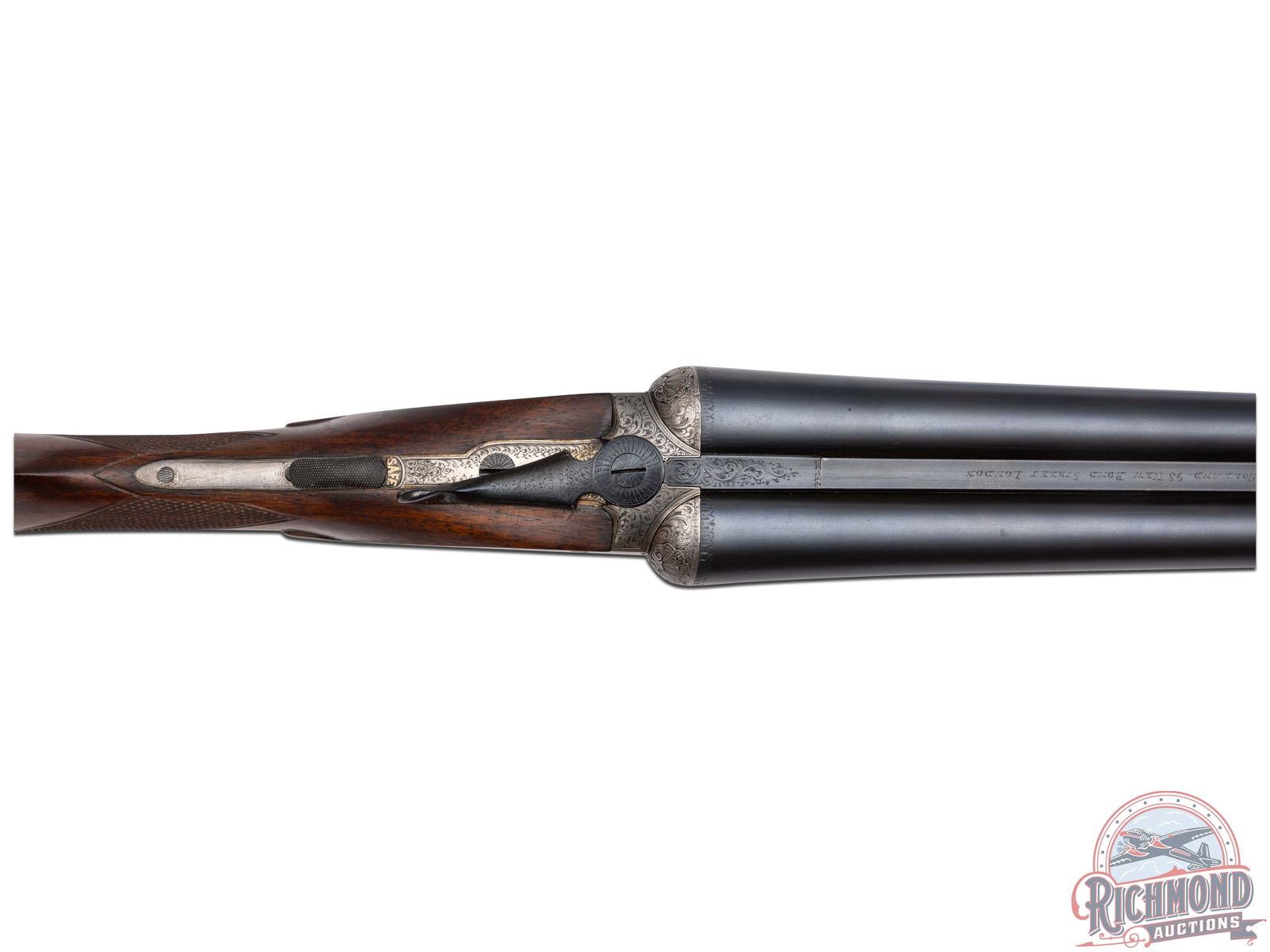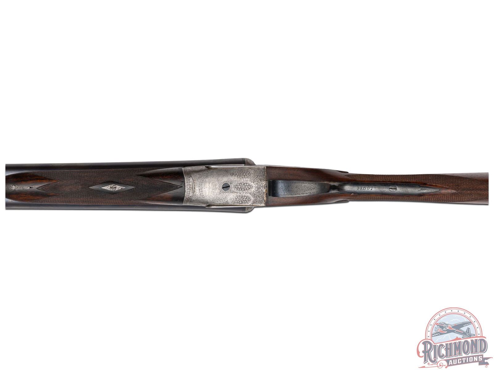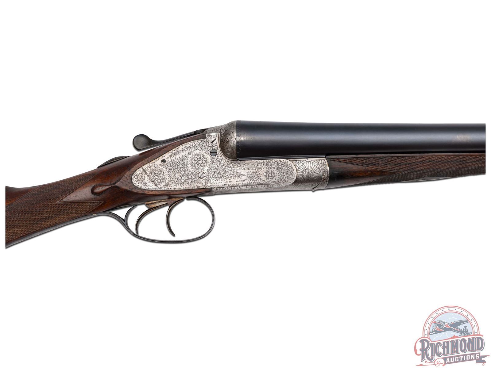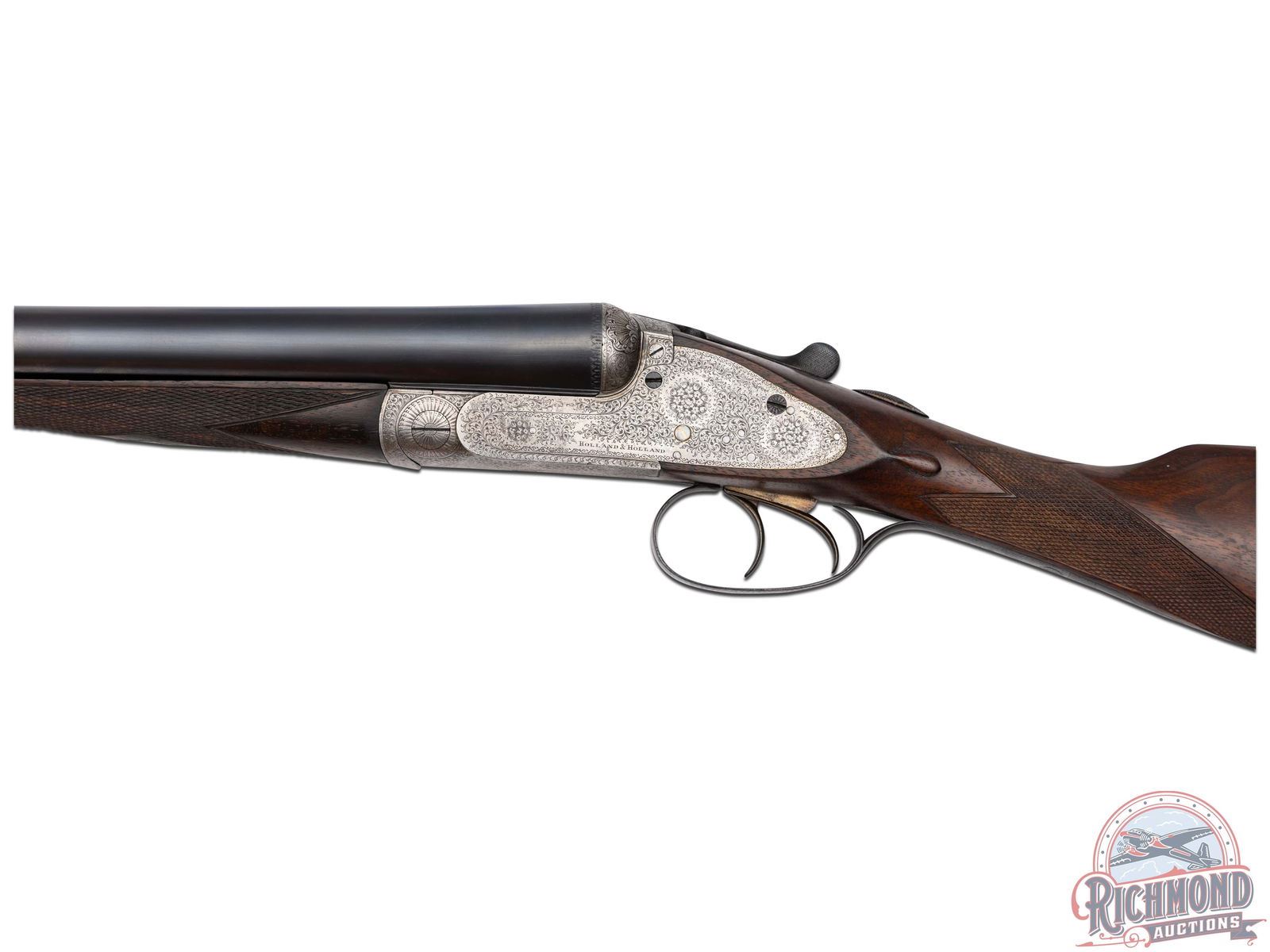 Made by Holland and Holland of London, England for F. Vallange in 1892, according to copy of accompanying original Holland and Holland Ledger Entry. Gun is fitted with blued 28" Nitro Proofed steel barrels in 12 gauge with 2-1/2" chambers with ejectors and Full and Modified chokes. Barrels are re-proofed and marked with import marks with smooth concave maker marked rib and bead front sight with floral engraved lug. Case-hardened hammerless sidelock Royal Ejector marked action with full vignette coverage engraving. Action has Patented Gas Check firing pins with gold lined cocking indicators, double triggers and automatic safety with "SAFE" in gold. Walnut checkered English grip stock with checkered wood butt and German silver oval vanity plate. Matching checkered walnut splinter forearm with push button release. Comes in period oak and leather trunk case with reproduction maker's label and ebony cleaning rod. LOP: 15". DAC: 1-1/2". DAH: 1-1/2". CALIBER: 12/32. S/N: 14607. FFL STATUS: Antique.