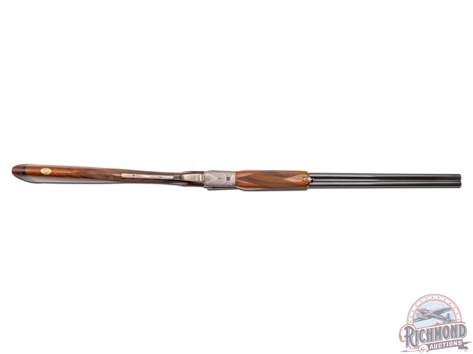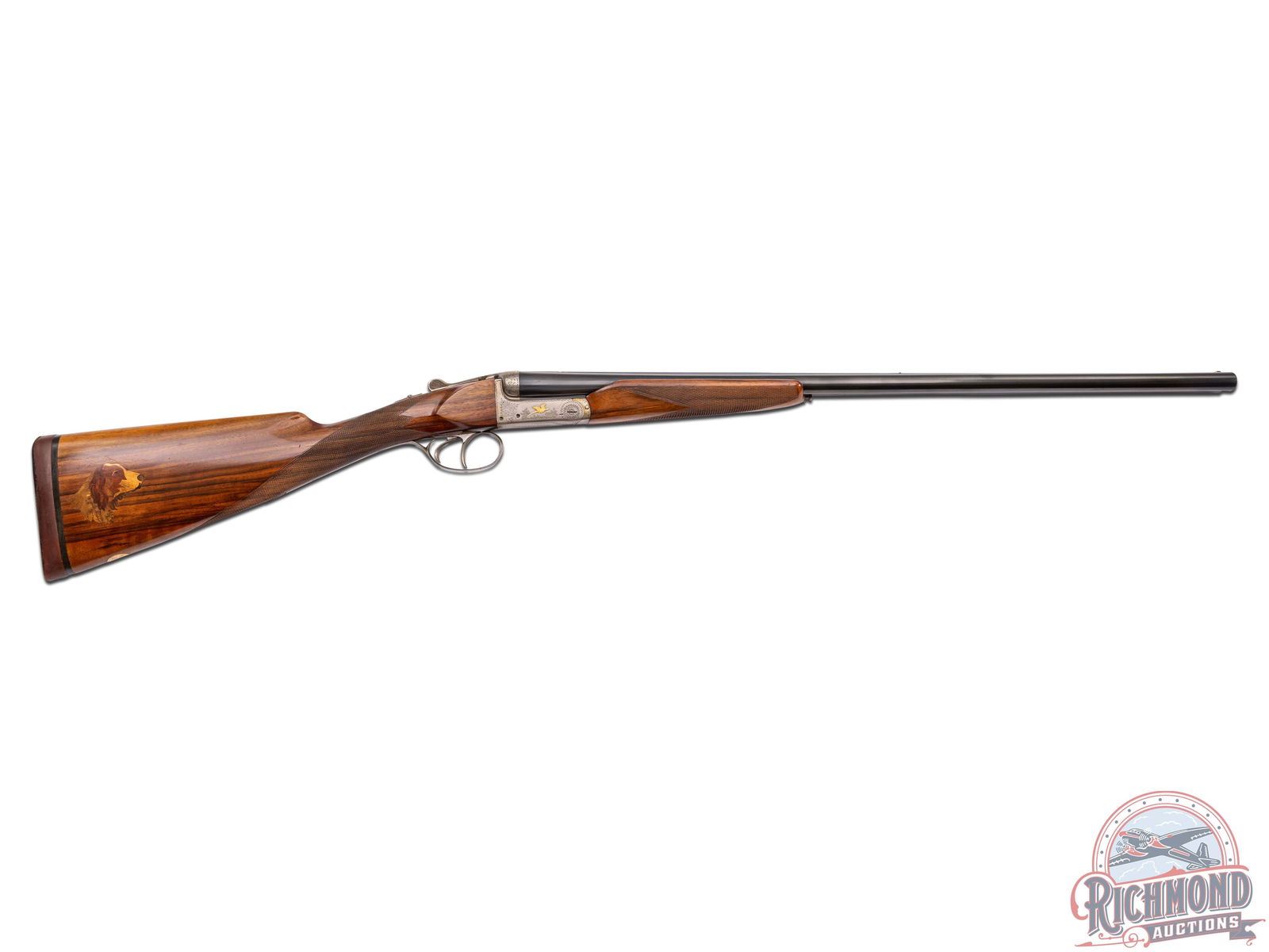 Made in Belgium by Francotte and custom stocked and engraved by Roy Vail in Warwick, New York. 26-1/4" blued Belgium proofed fluid steel 20 gauge barrels with matted rib, 2-3/4" chambers, ejectors, Modified and Modified chokes, and maker marked on rib "Roy Vail Warwich, NY" in gold. Satin finished boxlock action with vignette engraving and gold duck on left and gold pheasant on right. Action fitted with double triggers and non-automatic safety. Walnut English grip checkered stock with gold vanity plate with former owner's initials. Stock has leather faced pad and contrasting wood inlay of a Setter on right side. Inlay would have taken great effort. Gun has matching walnut checkered beavertail forearm with push button release. LOP: 14-3/4". DAC: 1-1/2". DAH: 2". CALIBER: 20 GA. S/N: 70606. FFL STATUS: Curio & Relic.