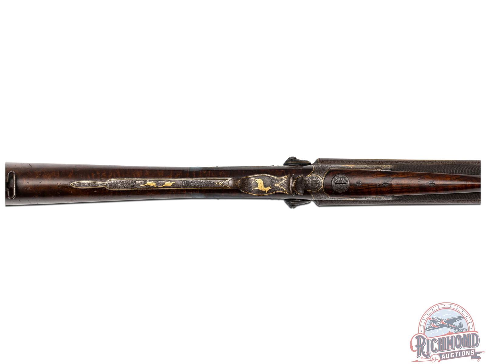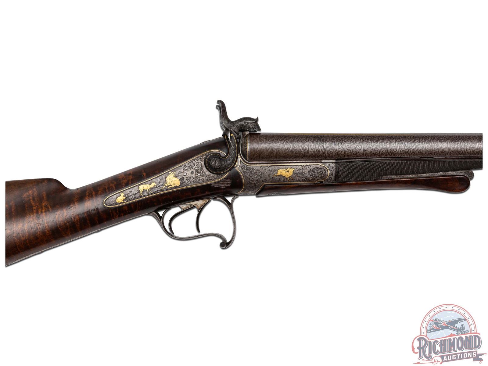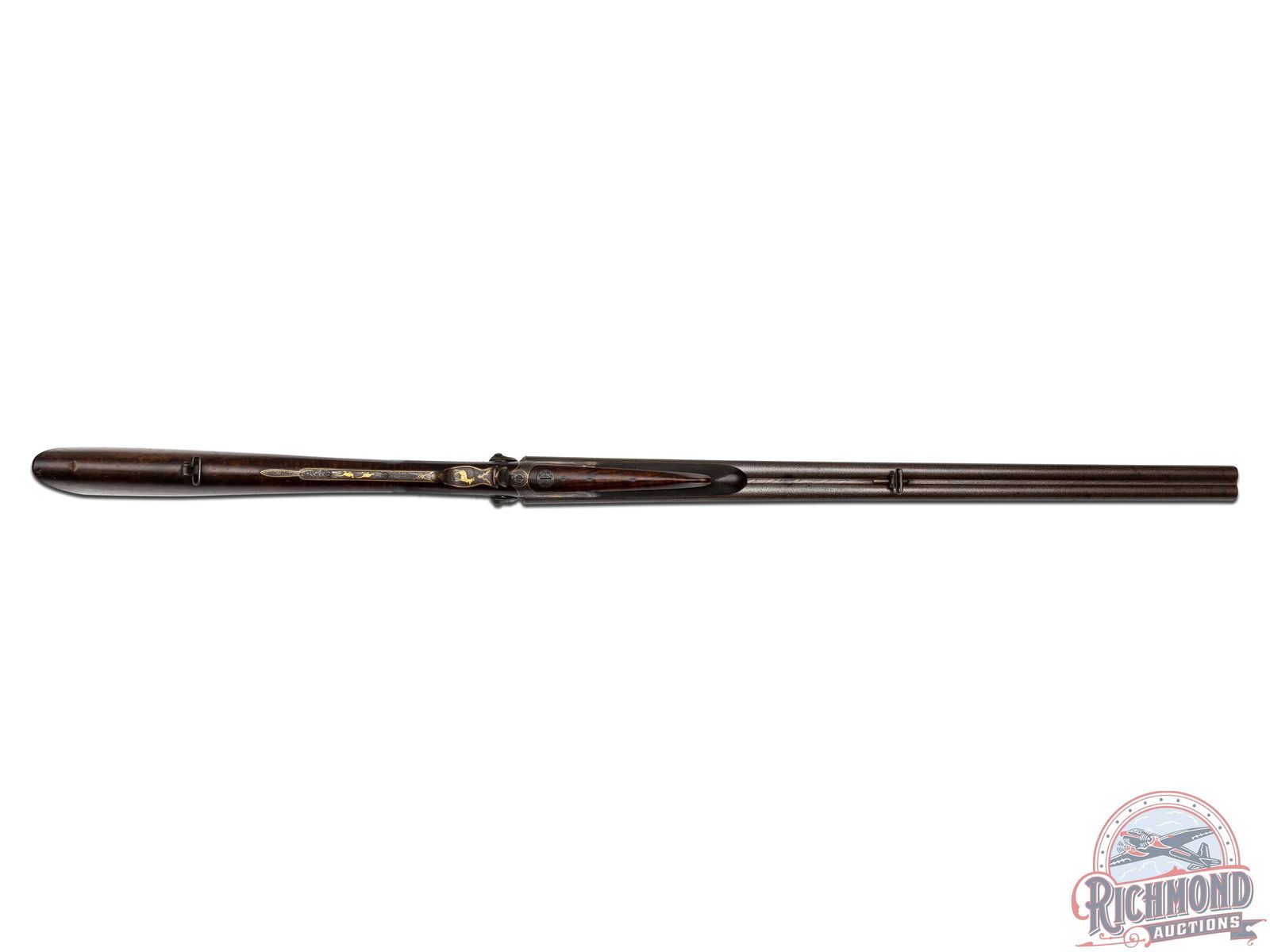 Manufactured in Liege, Belgium circa 1880's by N. Vivario and P. Cali Face. Features a 29-1/2" twist steel Belgium proofed 12 gauge pinfire barrels with smooth rib, bead front sight and marked in gold "N.ViVario and P. CaliFace D'Armas A Liege". Floral engraved underlever action with gold deer on right side and gold fox on the left. Dark action locks with floral engraving and three gold deer on each lock. Tang has gold bird in flight with edges of locks, action and tang having gold line border. Locks have engraved serpentine hammers with gold wash border lines. Fine walnut stock with English grip and steel engraved over-the-comb butt plate also with floral engraving and gold border with wounded duck in gold. Gun has double triggers surrounded by blued steel floral engraved shaped trigger guard with gold borders and gold deer on trigger bow and two gold pheasants on tang. Matching walnut opening lever. In total, 12 gold animal inlays. LOP: 14-1/4". DAC: 1-1/4". DAH: 2-1/4". CALIBER: 12 GA. S/N: 7500. FFL STATUS: Antique.