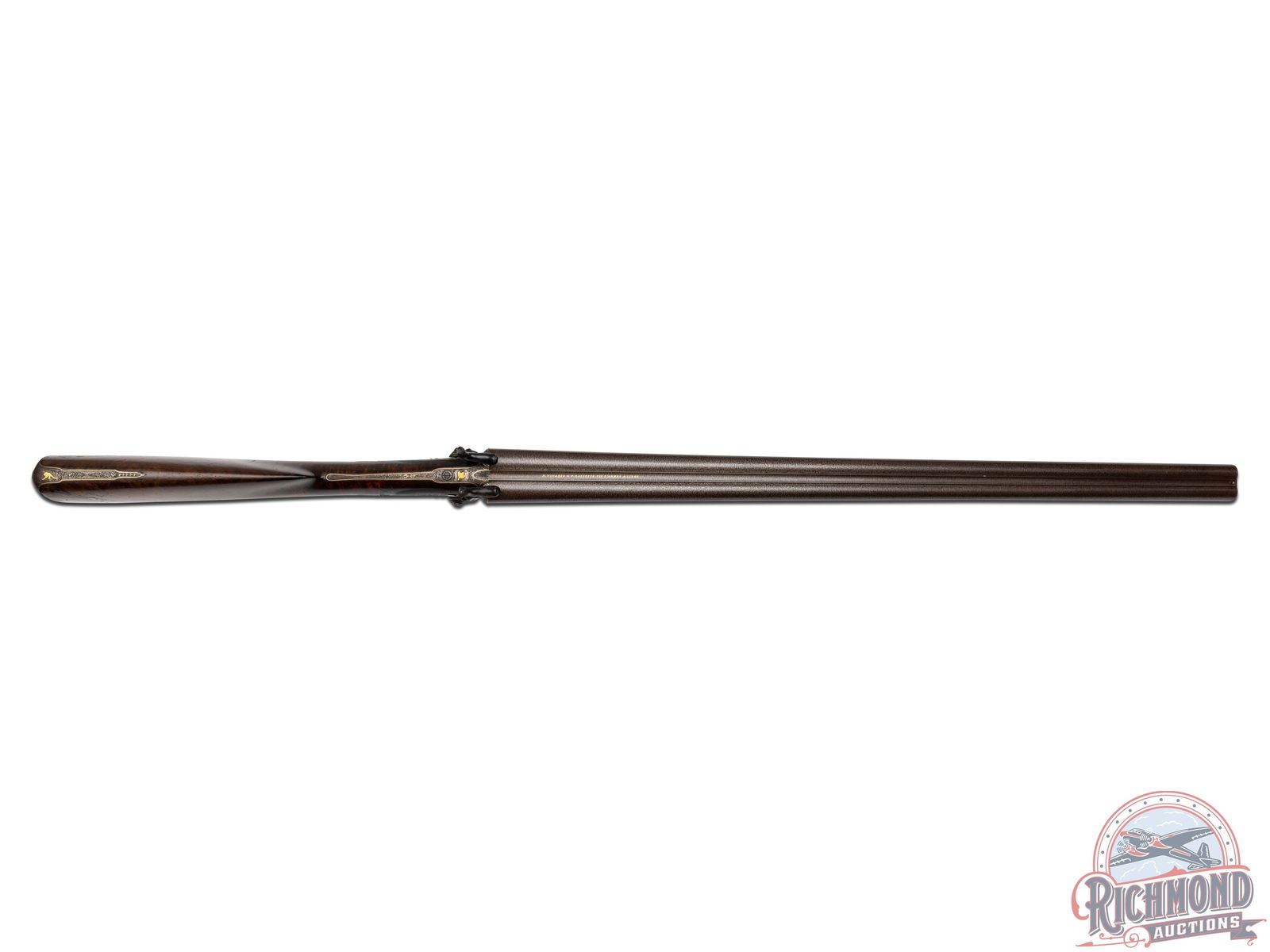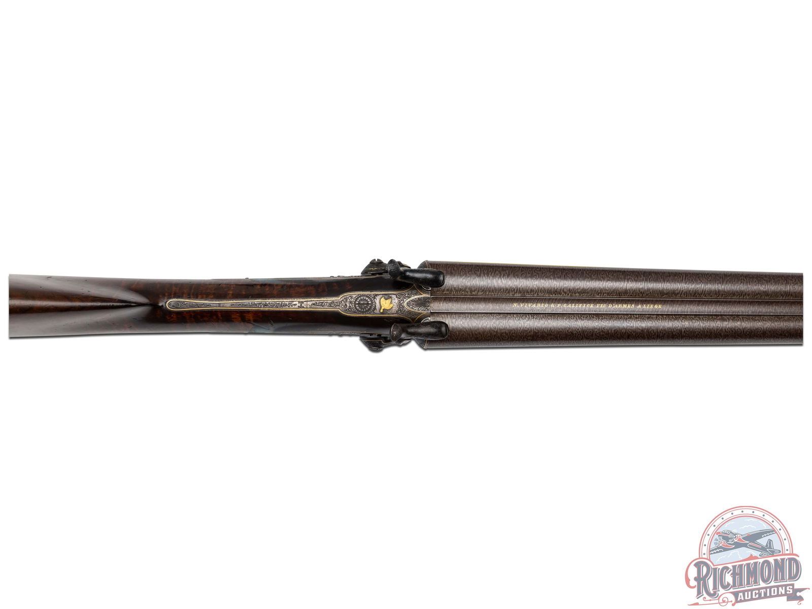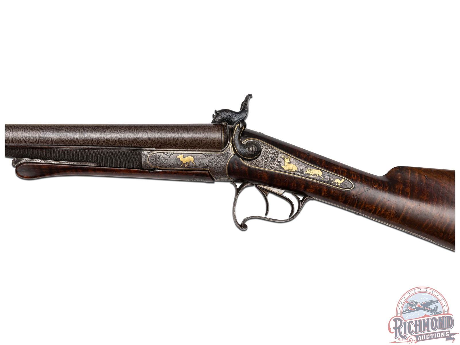 Manufactured in Liege, Belgium circa 1880's by N. Vivario and P. Cali Face. Features a 29-1/2" twist steel Belgium proofed 12 gauge pinfire barrels with smooth rib, bead front sight and marked in gold "N.ViVario and P. CaliFace D'Armas A Liege". Floral engraved underlever action with gold deer on right side and gold fox on the left. Dark action locks with floral engraving and three gold deer on each lock. Tang has gold bird in flight with edges of locks, action and tang having gold line border. Locks have engraved serpentine hammers with gold wash border lines. Fine walnut stock with English grip and steel engraved over-the-comb butt plate also with floral engraving and gold border with wounded duck in gold. Gun has double triggers surrounded by blued steel floral engraved shaped trigger guard with gold borders and gold deer on trigger bow and two gold pheasants on tang. Matching walnut opening lever. In total, 12 gold animal inlays. LOP: 14-1/4". DAC: 1-1/4". DAH: 2-1/4". CALIBER: 12 GA. S/N: 7500. FFL STATUS: Antique.