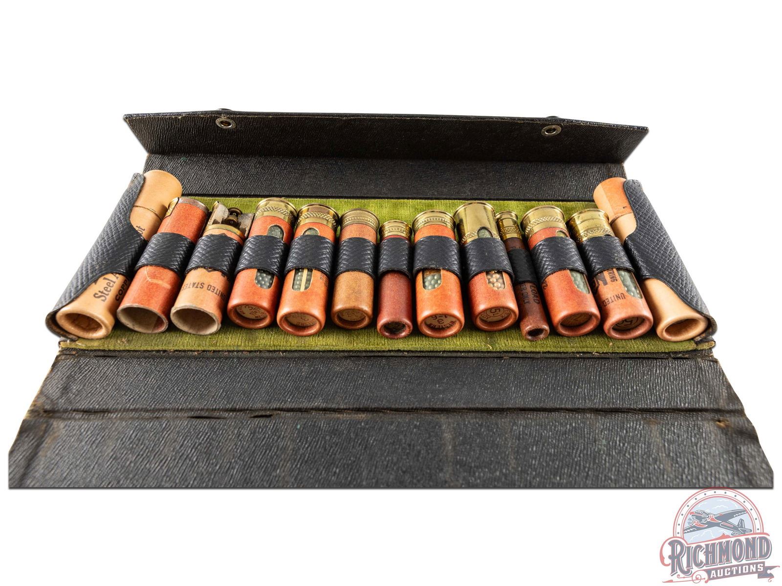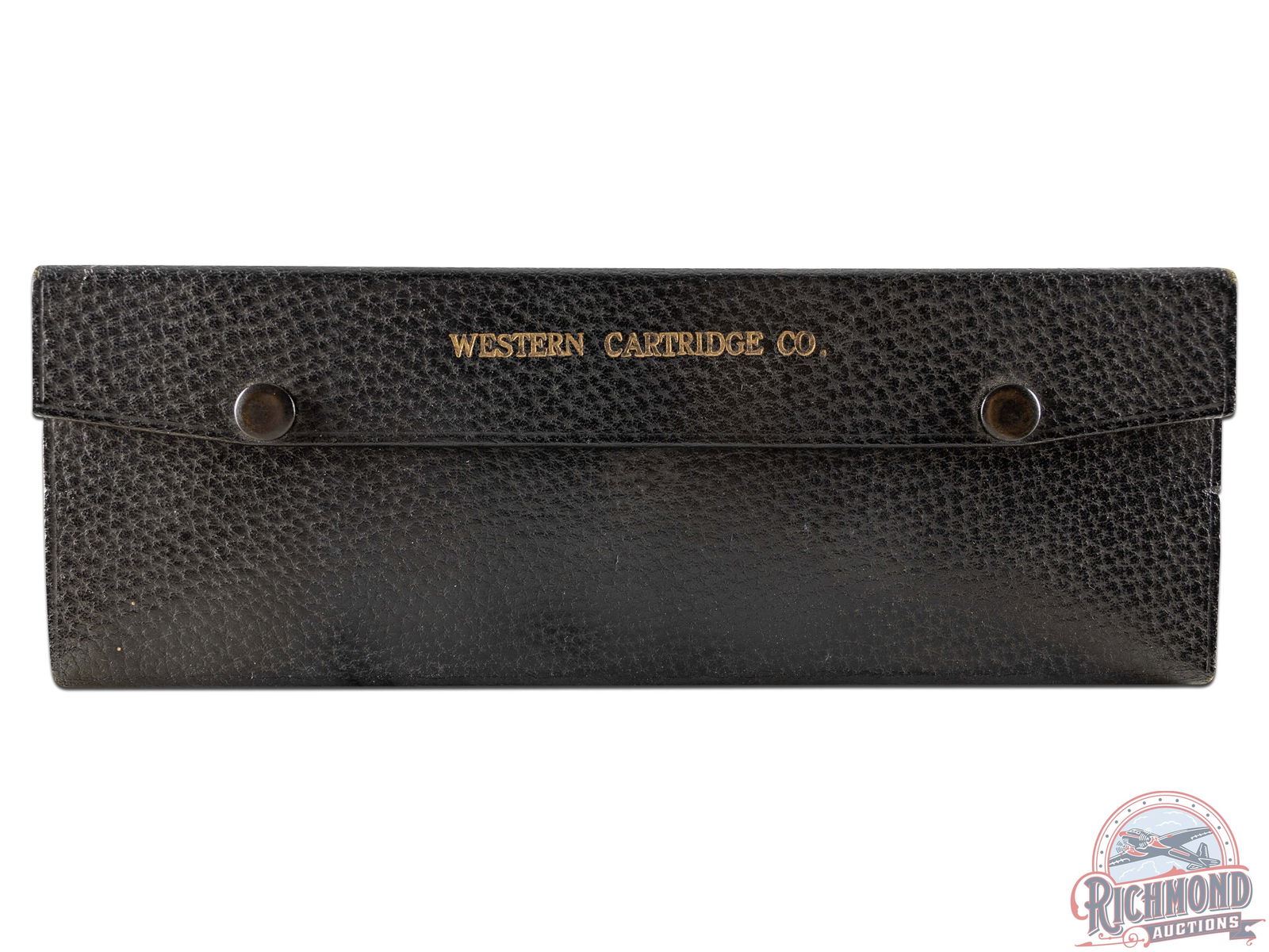 Western Cartridge Company Salesman Dummy Sample Kit with Western Super-X, X-pert, Record and Field brand shotgun shells with Western Steel Air rifle shot tubes in folding hard leather covered envelope case with "WESTERN CARTRIDGE CO." in gilded stamped letters.