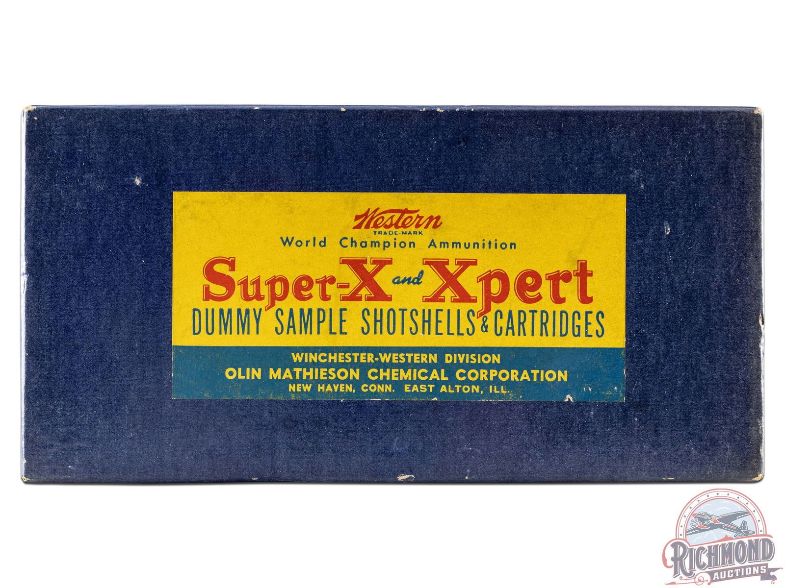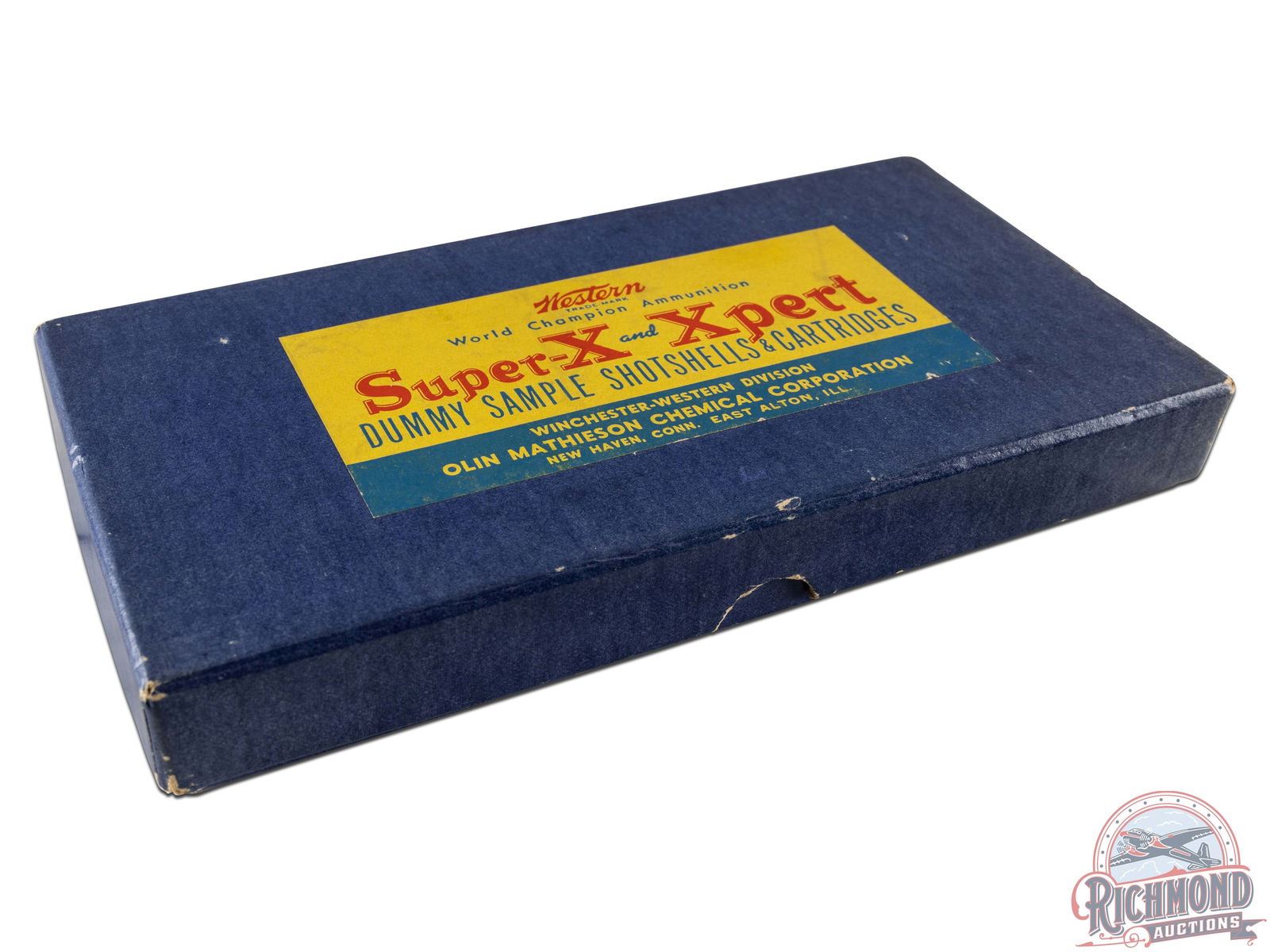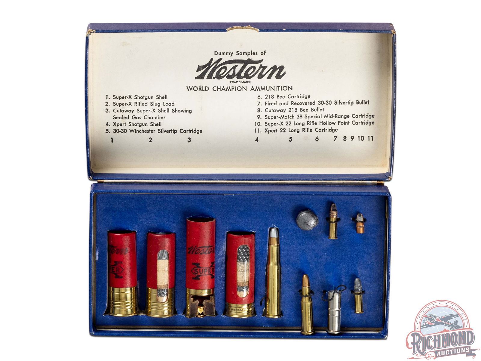 Winchester Western Salesman's Kit with Western Brand shotgun and rifle shells with kit having Super-X and Xpert shotgun shells with Silvertip 30-30, 218 Bee shell and bullet with 38 Special wadcutter and 22 long rifle shells. Kit is in hinged blue cardboard box with Western label.