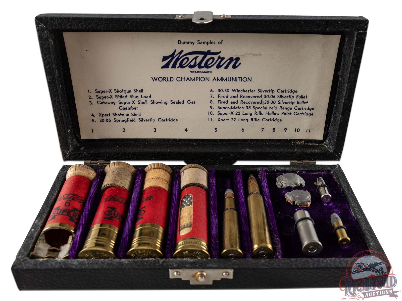 Winchester/Western Western Brand Salesman's Dummy Sample Kit with Super-X and X-pert shotgun shells, 30-30 and 30-06 silvertip shells with38 special mid range, mushroomed bullets and 22 shells housed in a purple felt lined wooden leather covered black case.