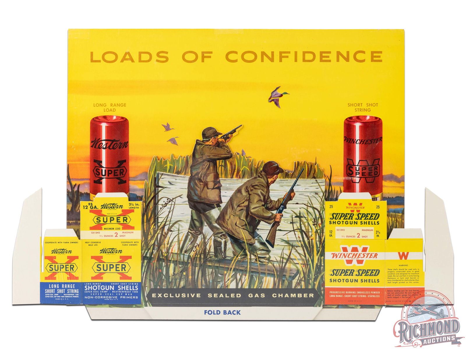 Fantastic NOS (new old stock) 3D folding cardboard countertop display sign featuring duck hunters in a marsh, mallards in flight, a Winchester Super Speed shotgun shell box and Western Super X shotgun shell box. Reads "Exclusive Sealed Gas Chamber" with a graphic of each type of shell. Excellent condition overall with only minor storage wear in a few spots. The fold lines are clean and appear to have never been used. Shrink wrapped an secured to foamboard. This is an example that will never need to be upgraded. 19" H x 28.75" W.