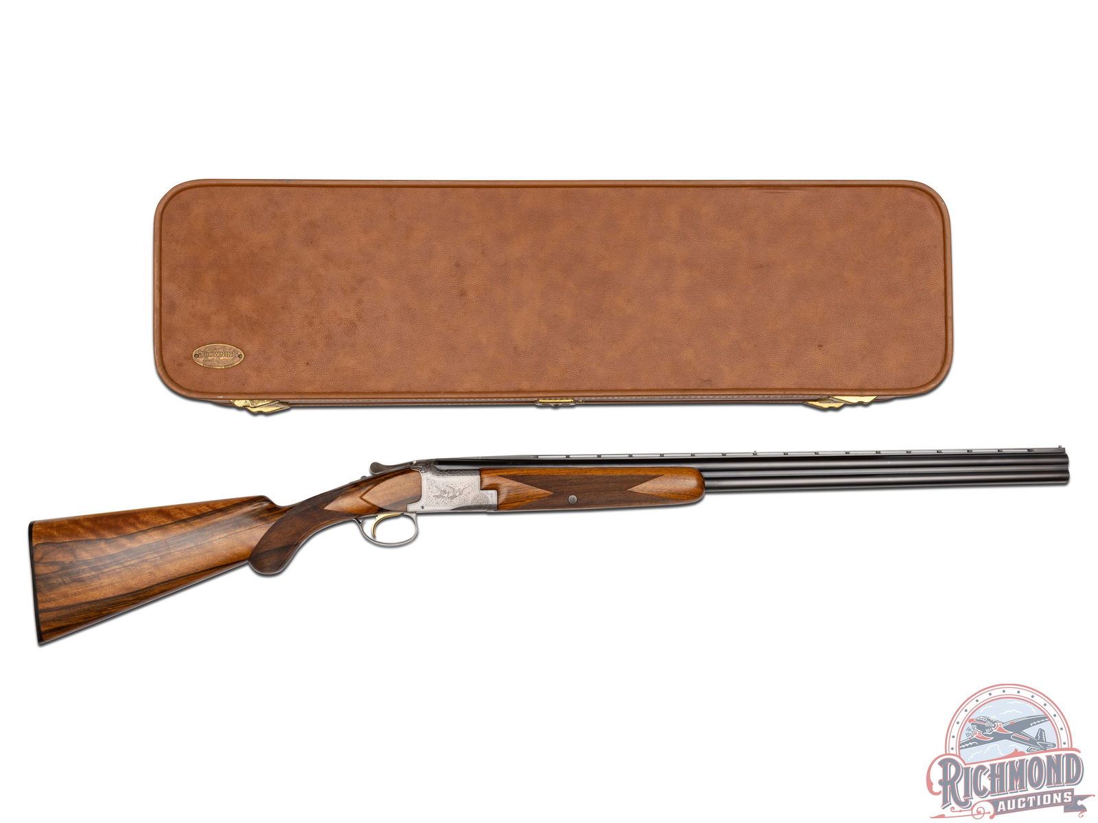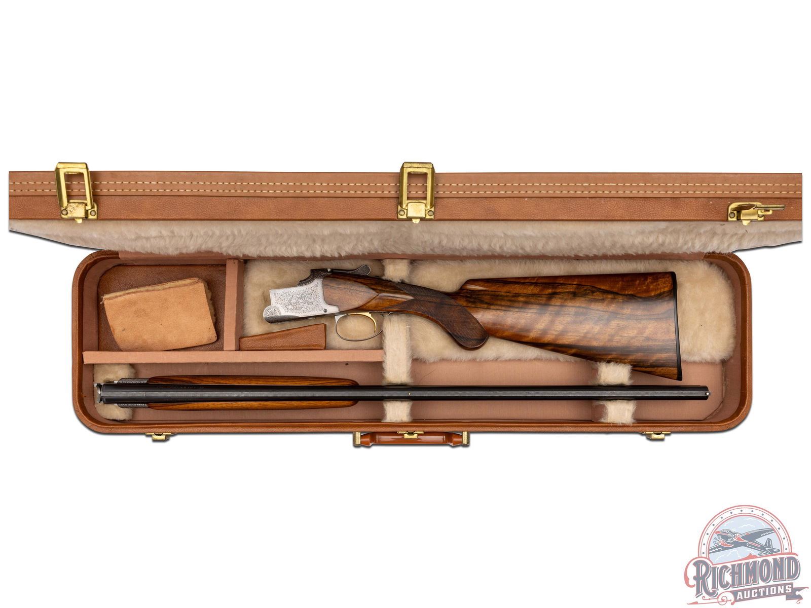 Made in Herstal, Belgium by Browning in 1959. Fitted with blued 28" Special Steel 20 gauge barrels with ventilated rib, twin bead sights, ejectors, 3" chambers, Browning St. Louis, Missouri address marking, and Skeet and Skeet chokes. Satin finish Pigeon Grade style engraved action with single gold washed selective trigger and top tang safety and barrel selector. Action is engraved with vignette engraving and flying Pigeon panel scenes. French walnut round knob long tang pistol grip stock with fine checkering and "Browning" hard rubber butt plate. Matching sporting style checkered attached forearm. Comes in tan Browning luggage case. LOP: 14-1/4". DAC: 1-1/2". DAH: 2-3/8". CALIBER: 20 GA. S/N: 14484. FFL STATUS: Curio & Relic.