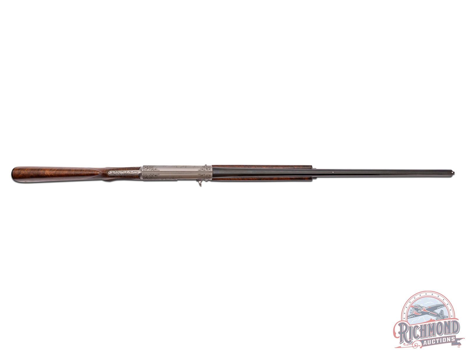 Manufactured in 1984 at FN in Belgium for Browning. Rare, number 227 of only 500 produced. Features a 28" blued ventilated rib barrel with white bead mid and front sight, choked Modified (**) and chambered for 2-3/4" shells. All standard Browning roll marks and proof marks. Beautiful coin finish receiver engraved and signed on the left side by Georges Marchal and the right side by H. Blanvalet. Right side features Gold inlaid landing ducks in a pond scene surrounded by deep-relief floral scroll and a gold inlaid silhouette of John Browning. Scroll banner at the bottom edge reads "BROWNING / GOLD CLASSIC" in gold lettering. Top "hump" has matching deep-relief floral scroll engraving with eight ducks total in flight. Left side features a gold inlaid downed duck and retriever in motion in a pond scene surrounded by deep-relief floral scroll. Scroll banner at the bottom edge reads "227 OF / FIVE HUNDRED" in gold lettering. Floral scroll engraving also along the tang and under the trigger guard. Gold inlaid Browning Buck logo in the bottom of the trigger guard. Gold washed trigger and crossbolt safety. Long tang, round knob highly figured walnut stock with finely checkered pistol grip and forearm. Checkering is surrounded by floral scroll and punch dot borders. Fitted with a factory FN synthetic butt plate. LOP: 14". DAC: 1-3/4". DAH: 2-1/2". CALIBER: 12 GA. S/N: 211GC227. FFL STATUS: Modern.