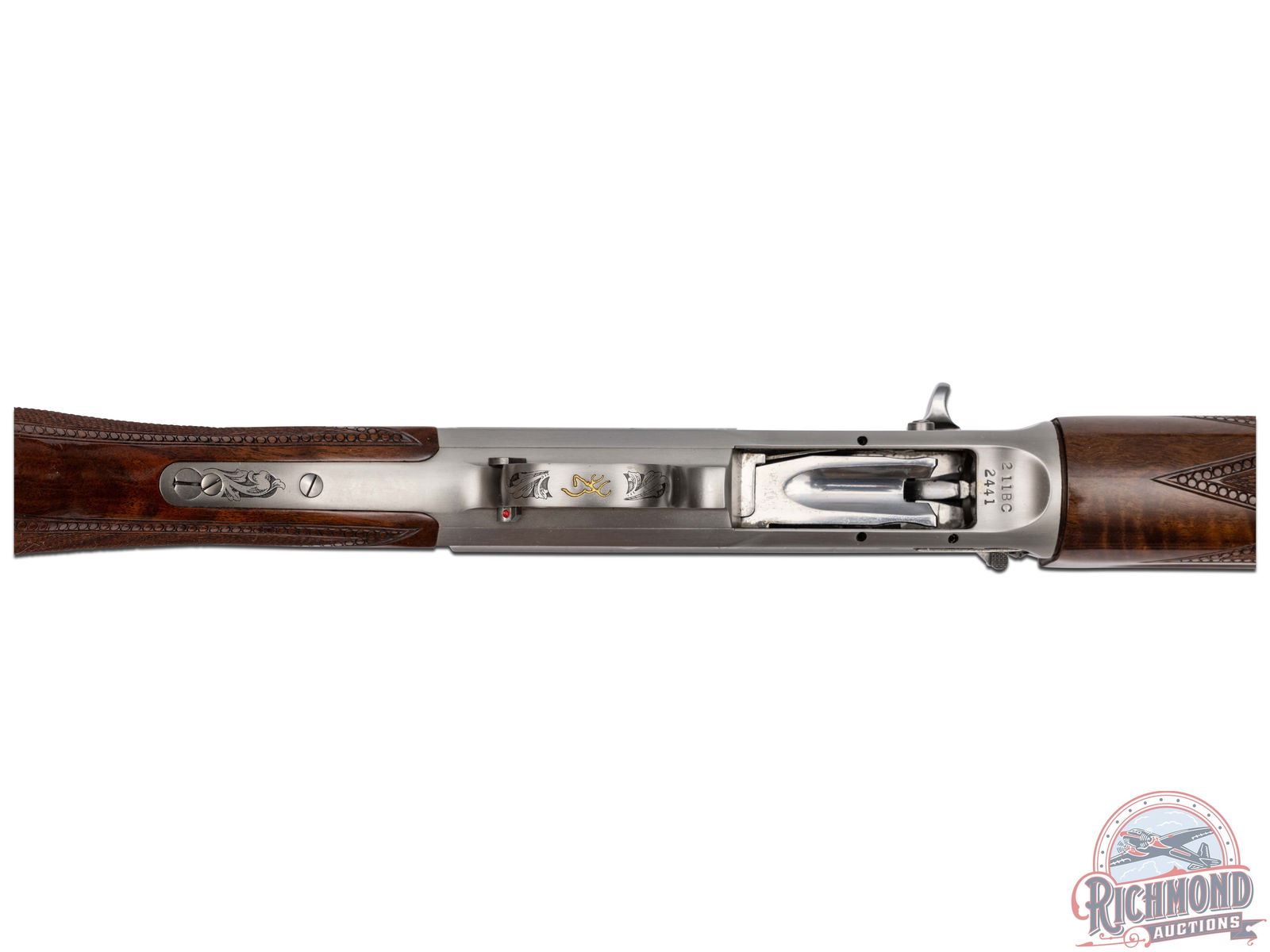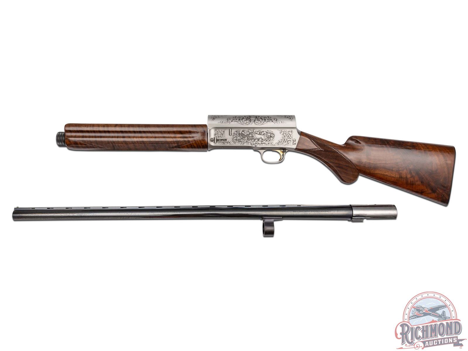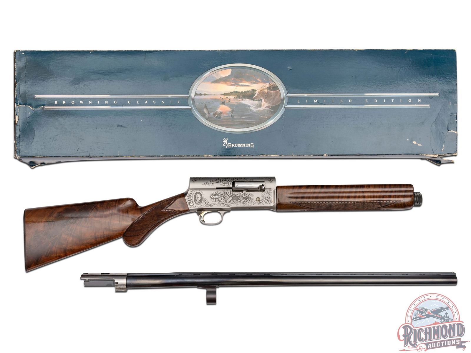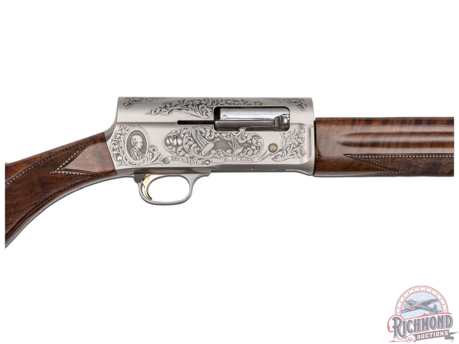 Manufactured in 1984. This beautiful A5 features a 28" blued ventilated rib barrel chambered for 2-3/4" shells with Improved Modified choke and nickel bead front sight. Coin finished receiver with Browning Custom Shop engraving. Coin finished receiver with Browning Limited Edition engraving. Right side features floral scroll designs with two ducks in flight, an oval portrait of John M. Browning and a banner stamped "BROWNING CLASSIC". Left side features floral scroll designs surrounding a dog after a fallen duck with a banner stamped "ONE OF FIVE THOUSAND". Both sides of the grip tang and bottom of trigger guard feature floral scroll engraving. Crossbolt safety and gold washed trigger with Browning Buck logo stamped on the bottom of the guard in gold. High grade walnut round knob, long tang stock with matching skeet style forearm in a gloss finish. Checkered grip and forearm with dotted border. Fitted with a factory black checkered butt plate. Comes in the original Browning factory box with sleeve and paperwork. LOP: 14-1/4". DAC: 1-3/4". DAH: 2-3/4". CALIBER: 12 GA. S/N: 211BC2441. FFL STATUS: Modern.