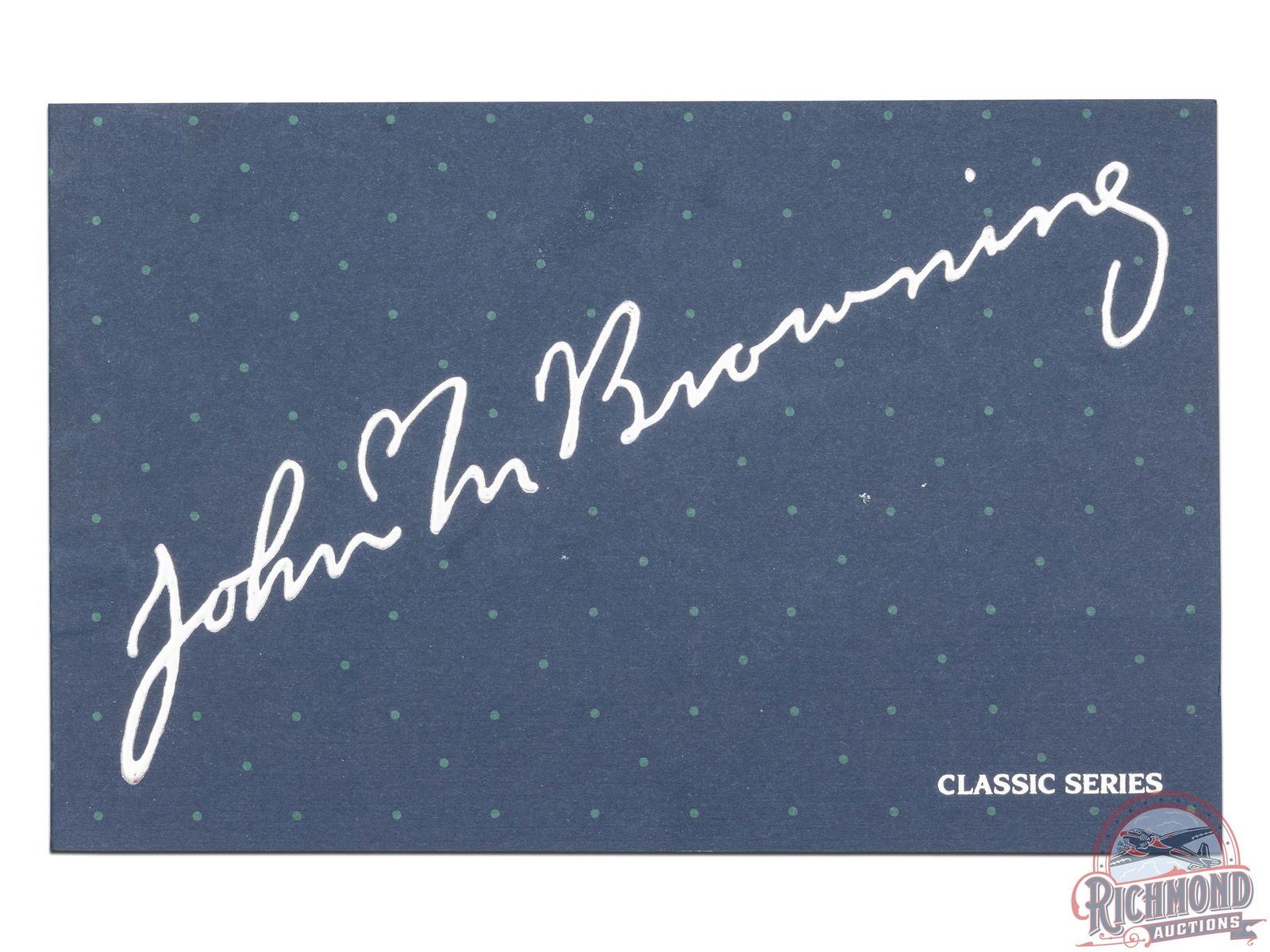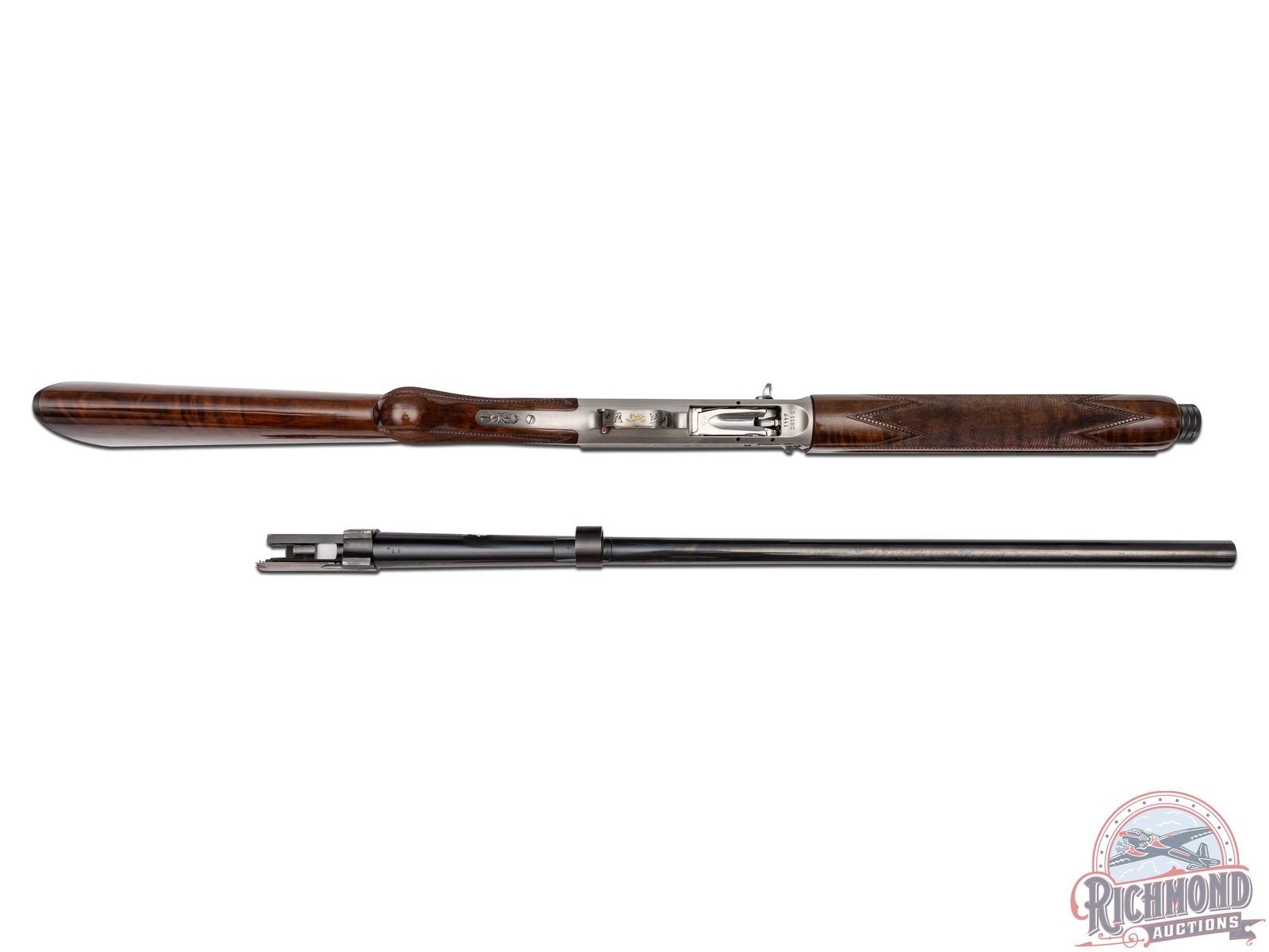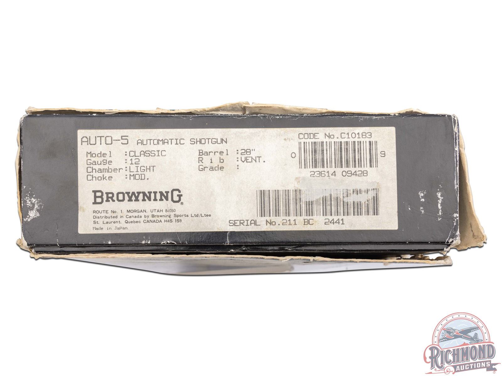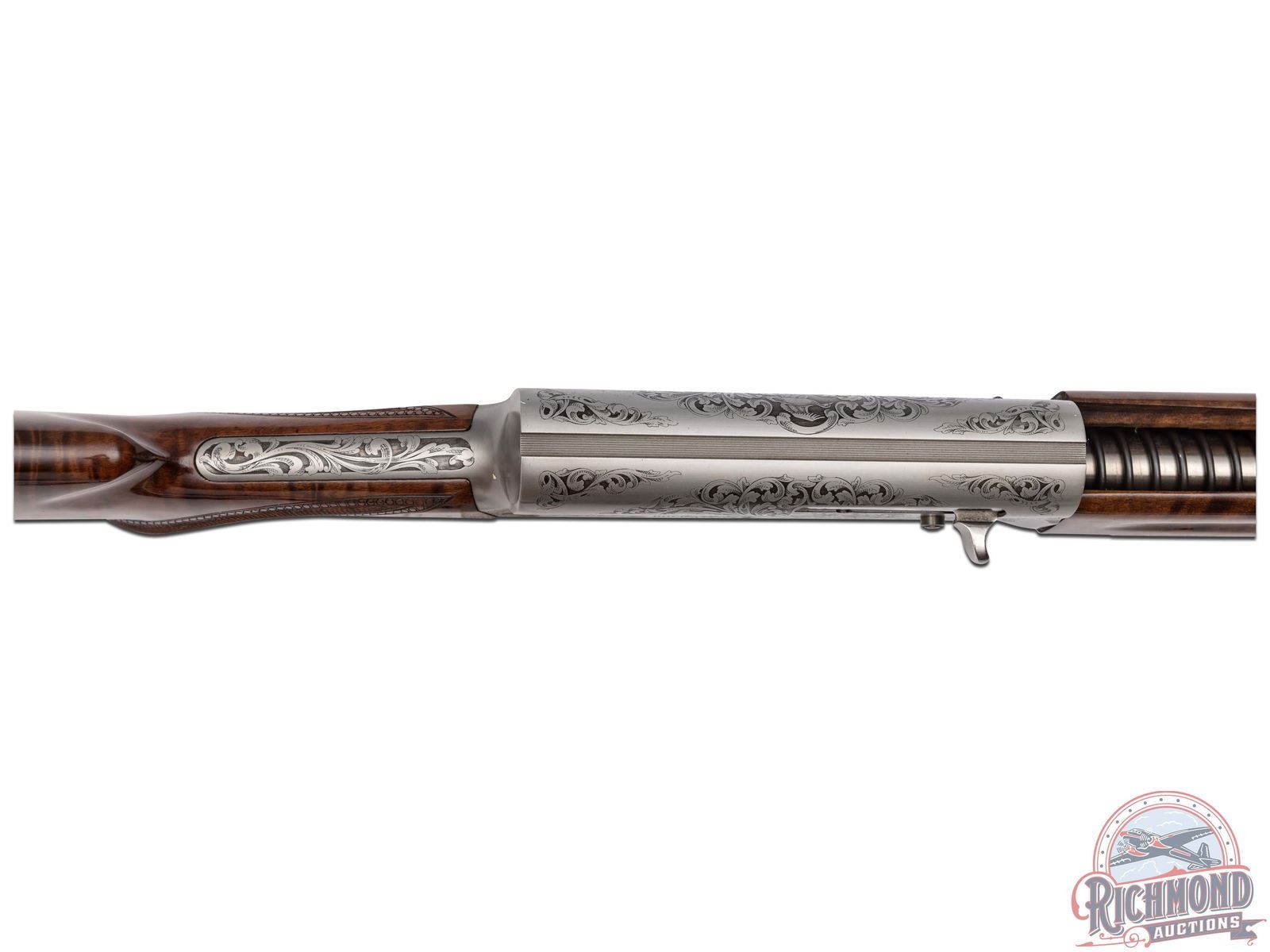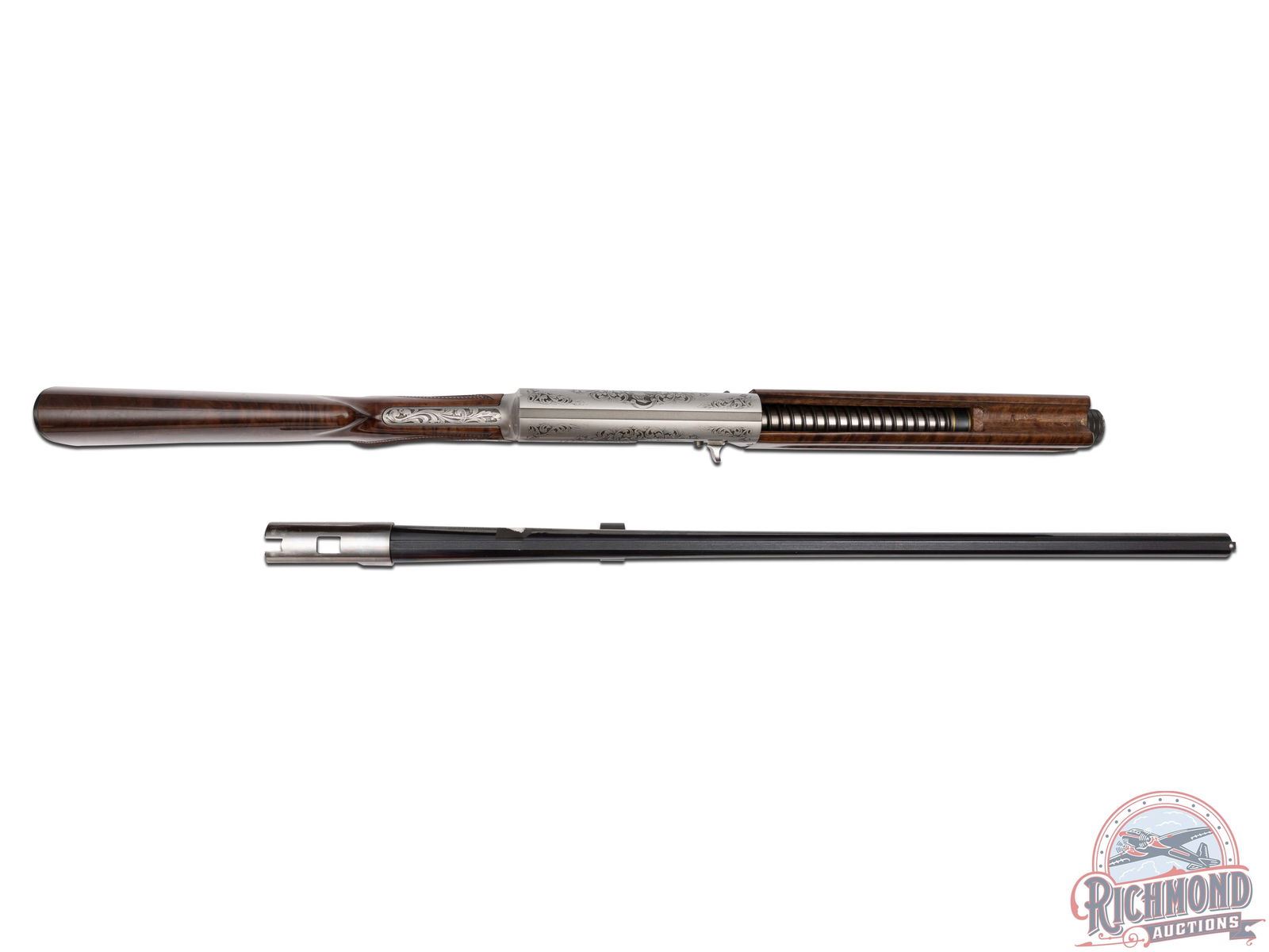 Manufactured in 1984. This beautiful A5 features a 28" blued ventilated rib barrel chambered for 2-3/4" shells with Improved Modified choke and nickel bead front sight. Coin finished receiver with Browning Custom Shop engraving. Coin finished receiver with Browning Limited Edition engraving. Right side features floral scroll designs with two ducks in flight, an oval portrait of John M. Browning and a banner stamped "BROWNING CLASSIC". Left side features floral scroll designs surrounding a dog after a fallen duck with a banner stamped "ONE OF FIVE THOUSAND". Both sides of the grip tang and bottom of trigger guard feature floral scroll engraving. Crossbolt safety and gold washed trigger with Browning Buck logo stamped on the bottom of the guard in gold. High grade walnut round knob, long tang stock with matching skeet style forearm in a gloss finish. Checkered grip and forearm with dotted border. Fitted with a factory black checkered butt plate. Comes in the original Browning factory box with sleeve and paperwork. LOP: 14-1/4". DAC: 1-3/4". DAH: 2-3/4". CALIBER: 12 GA. S/N: 211BC2441. FFL STATUS: Modern.