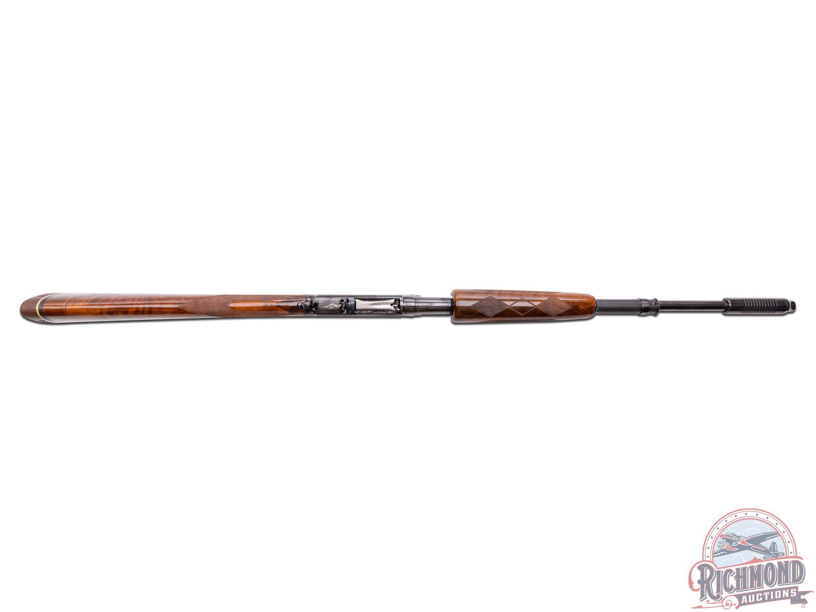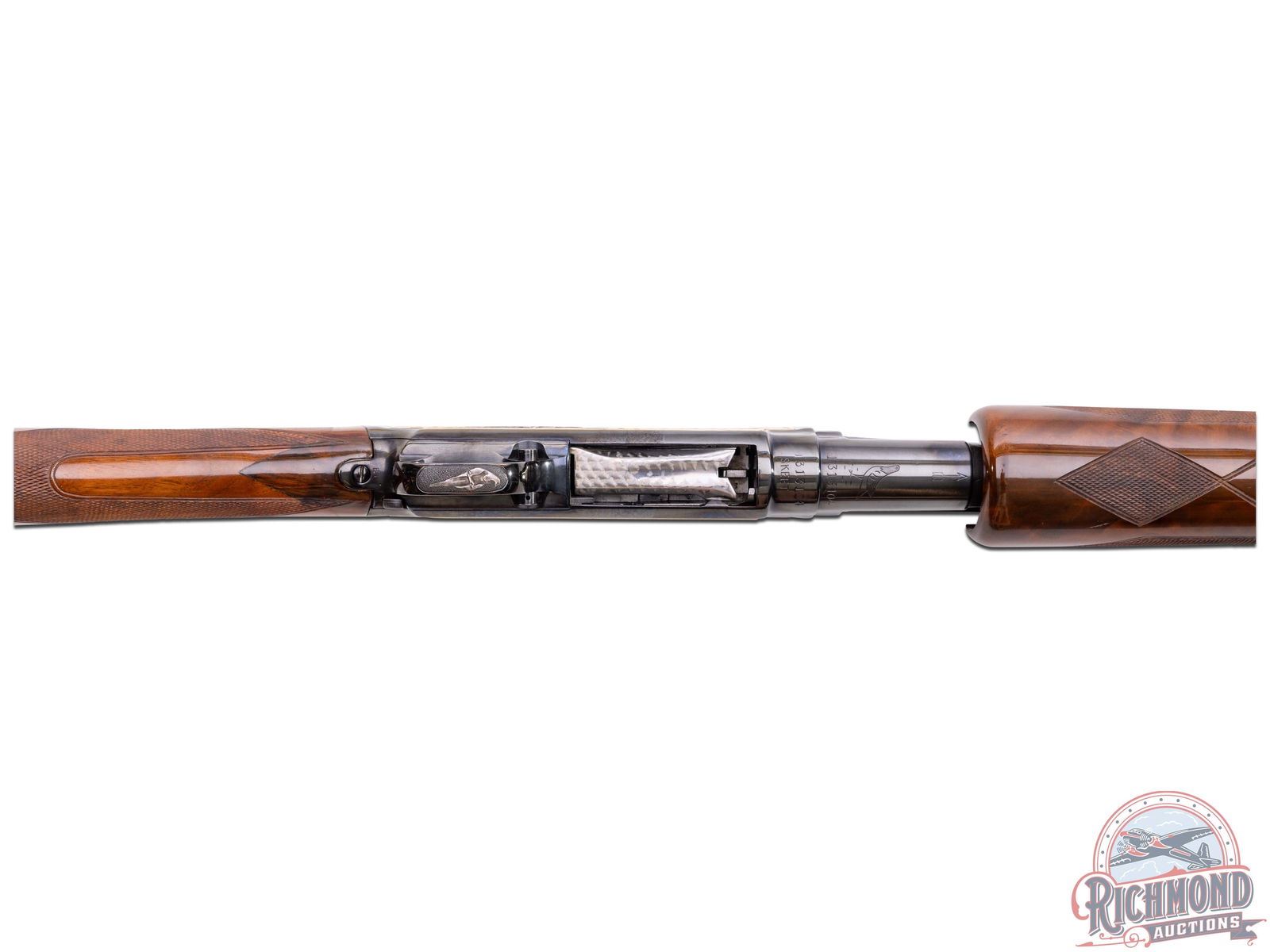 Manufactured in 1952. Features a 26" blued barrel with Cutts compensator and Simmons ventilated rib. White bead mid and front sight. Chambered for 2-3/4" shells with original WS-1 skeet choke. Floral scroll engraving extends 3/4" from receiver on both sides of the barrel with period correct stampings. Bottom of barrel and action have matching serial numbers with the pigeon stamping and "SKEET" on the receiver. Beautiful polished blued receiver with matte top. Both sides feature two embossed Mexican silver grouse in flight on a punch dot background, circled in a gold border with floral scroll engraving and gold receiver border. Right side is signed in the bottom right corner "DUBBER '73". Diamond cut bolt and lifter with a crossbolt safety. Bottom of the trigger guard features a Mexican silver embossed bird sitting on a wire with a punch dot background. Highly figured straight stock with hand-checkering at the pistol grip and several inlays; both sides of the grip feature a diamond inlay, right side of the stock features a birch and cherry inlay of a bird in flight and about an 1" from the butt plate a birch and cherry line circling the stock. Walnut forearm features Pigeon grade correct checkering the with diamond pattern on the bottom. Fitted with a black & white lined brown ventilated recoil pad. LOP: 13-1/2". DAC: 1-5/8". DAH: 2". CALIBER: 20 GA. S/N: 1313104. FFL STATUS: Curio & Relic.