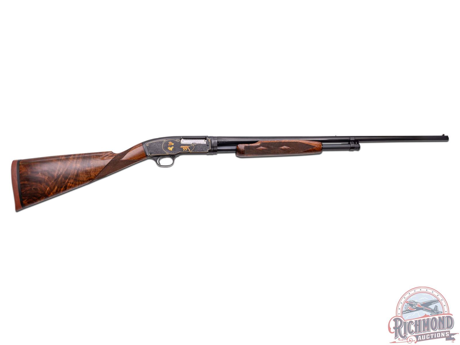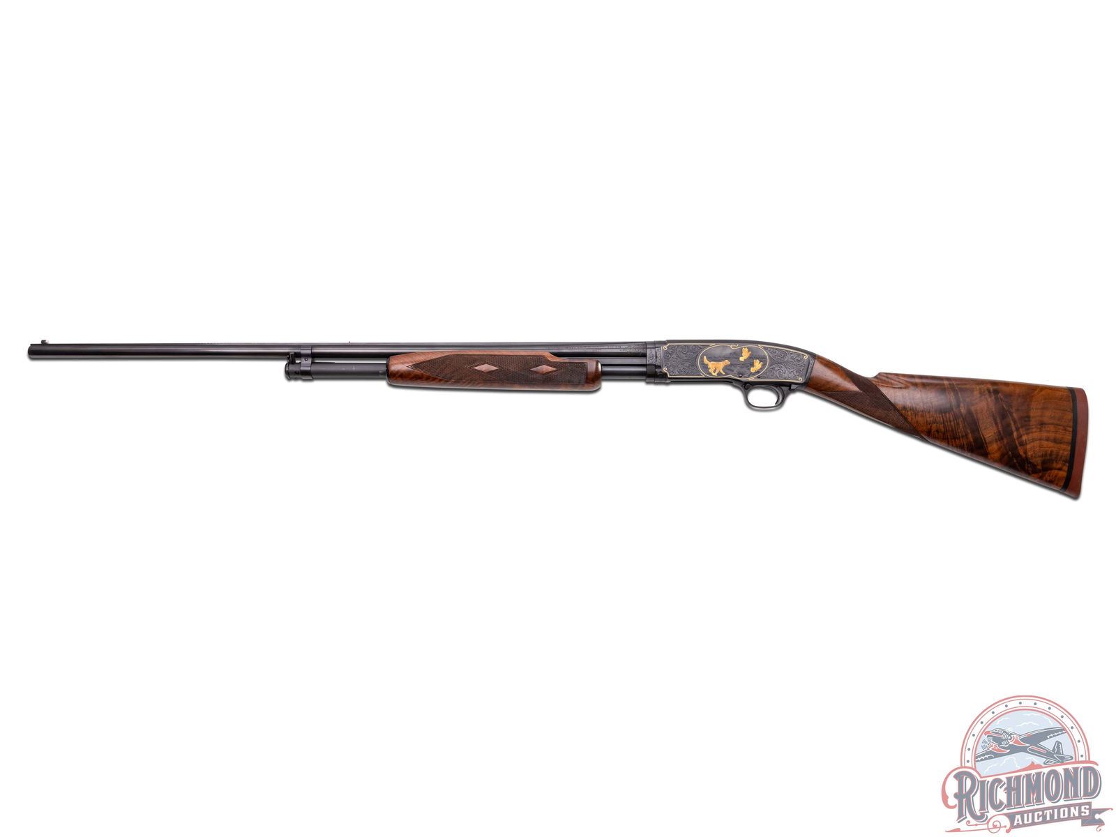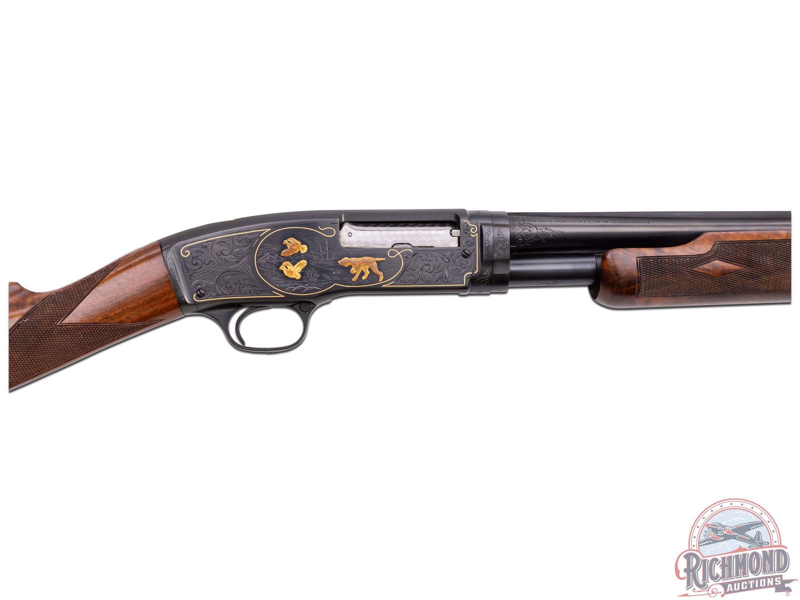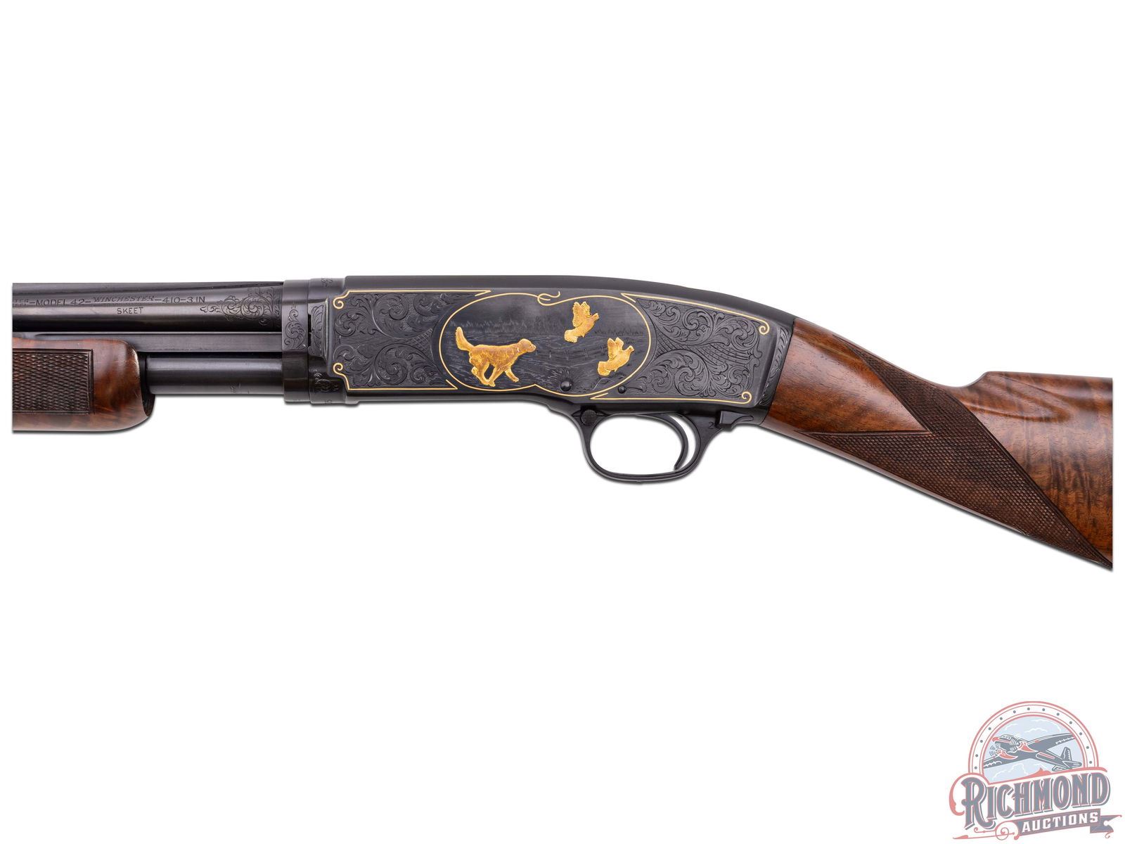 Manufactured in 1937. Features a 28" blued solid rib barrel with white bead front sight, chambered for 3" shells with Modified choke. Standard Winchester barrel markings with "SKEET" below the Winchester stamping. Floral scroll engraving design extending 1-1/4" from the action on each side of the barrel, design also carries over to the barrel sleeve lock. Bottom of the barrel depicts the Pigeon grade bird engraving. Both sides of the receiver feature a gold inlaid dog flushing two gold inlaid game birds. This woodland scene is surrounded in a gold lined oval border with floral scroll and checkerboard design on each side, also with gold line border. Diamond cut bolt and lifter. Nice feather crotch walnut straight grip stock with checkering on grip. Matching forearm with double diamond checkering pattern. Fitted with a factory Winchester red recoil pad. LOP: 14-1/2". DAC: 1-1/2". DAH: 2-1/4". CALIBER: 410. S/N: 30405. FFL STATUS: Curio & Relic.