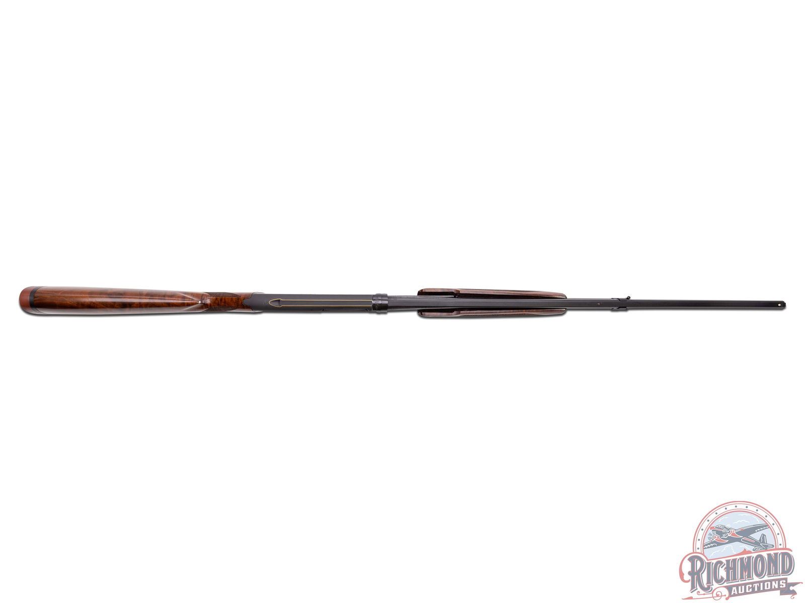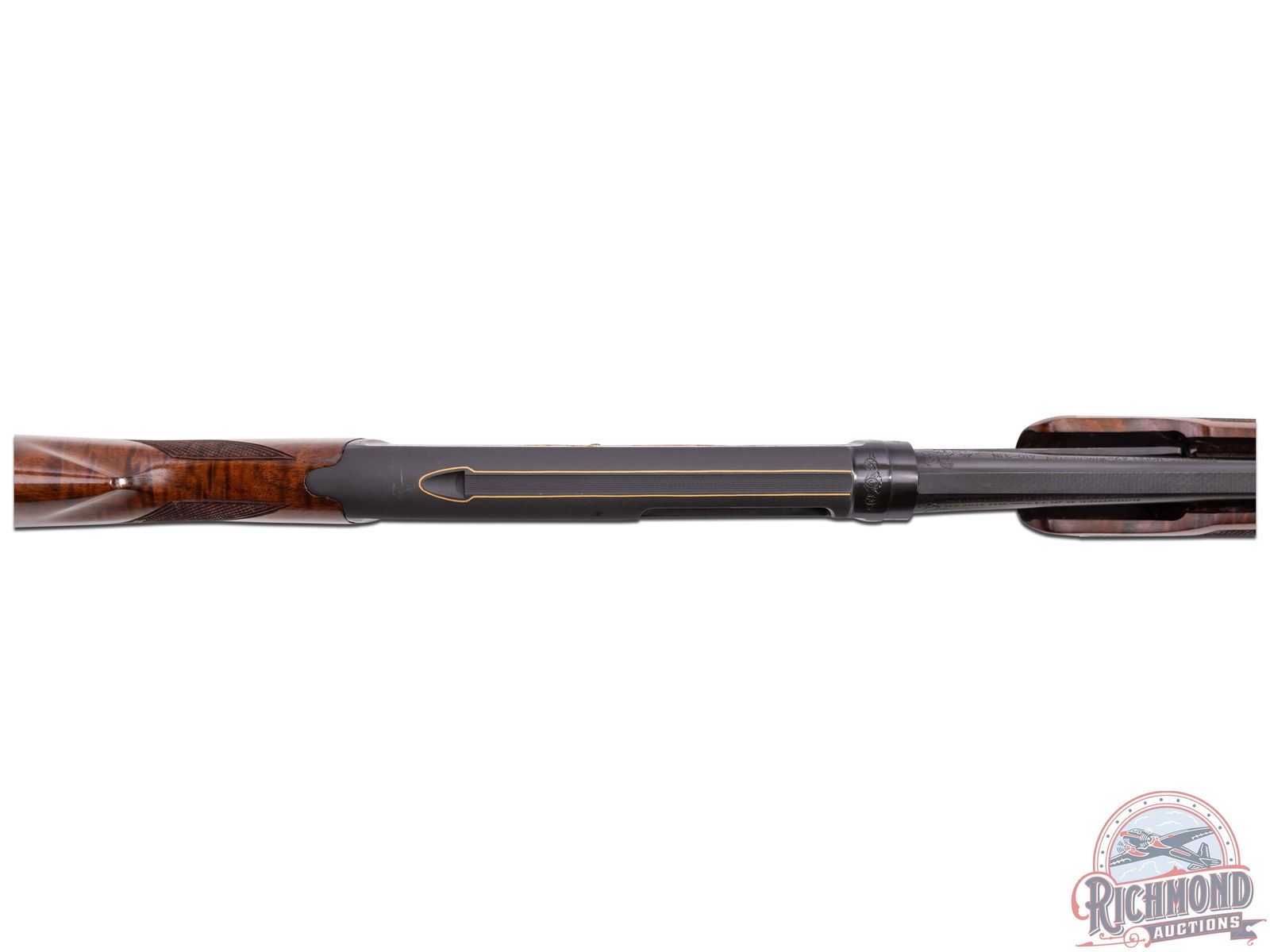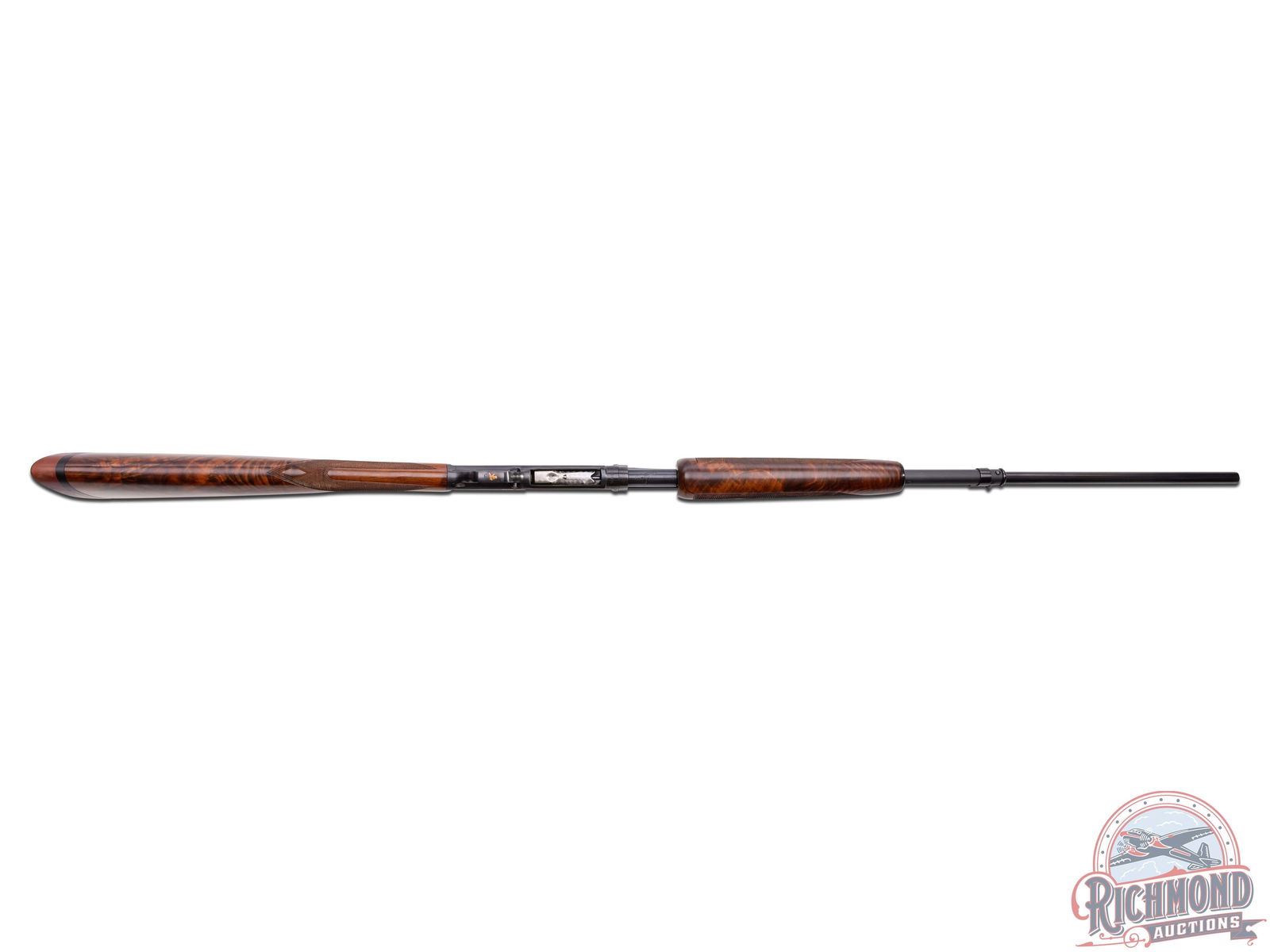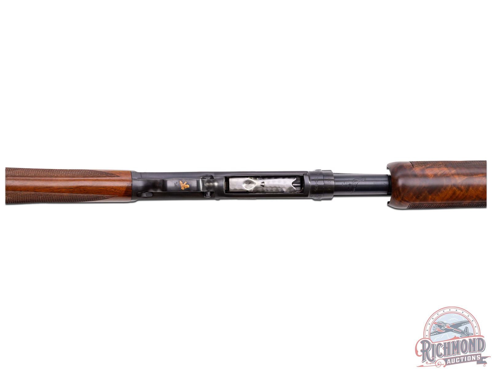 Manufactured in 1937. Features a 28" blued solid rib barrel with white bead front sight, chambered for 3" shells with Modified choke. Standard Winchester barrel markings with "SKEET" below the Winchester stamping. Floral scroll engraving design extending 1-1/4" from the action on each side of the barrel, design also carries over to the barrel sleeve lock. Bottom of the barrel depicts the Pigeon grade bird engraving. Both sides of the receiver feature a gold inlaid dog flushing two gold inlaid game birds. This woodland scene is surrounded in a gold lined oval border with floral scroll and checkerboard design on each side, also with gold line border. Diamond cut bolt and lifter. Nice feather crotch walnut straight grip stock with checkering on grip. Matching forearm with double diamond checkering pattern. Fitted with a factory Winchester red recoil pad. LOP: 14-1/2". DAC: 1-1/2". DAH: 2-1/4". CALIBER: 410. S/N: 30405. FFL STATUS: Curio & Relic.