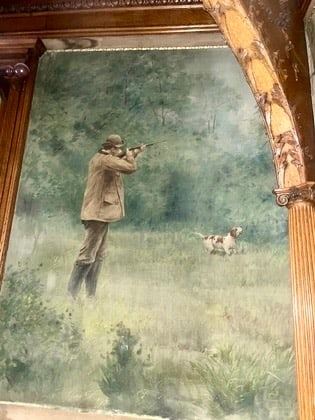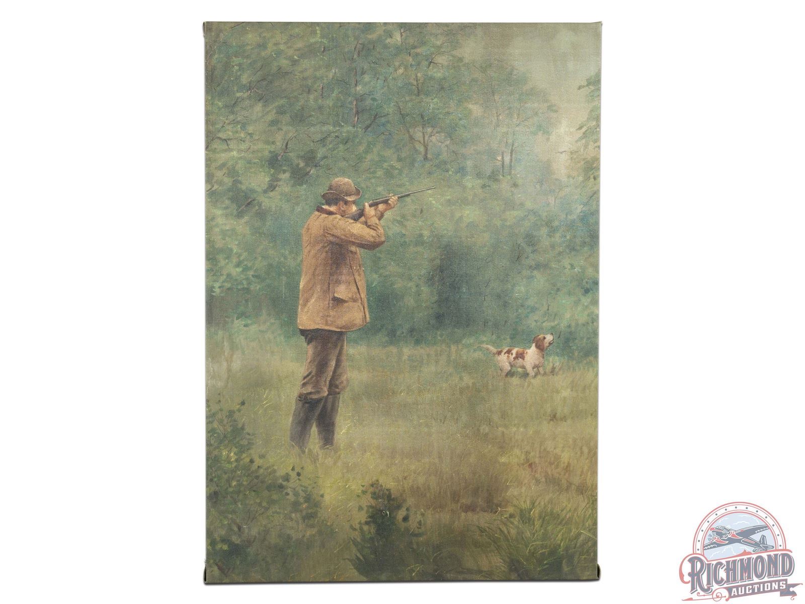Measures 40" wide by 57" tall. This beautiful painting depicts a sportsman woodcock hunting with a shotgun, in a woodland scene with his pointer dog ready to retrieve. This piece closely resembles A.B. Frost's original "Shooting Ducks from a Blind" that is part of his 1895 publication "Shooting Pictures", Charles Scribner's Sons Binding of the Portfolio booklet, as well as "The Sporting Art of Arthur Burdett Frost" by Colleen F. Storey, James A. Casada, Ph.D. and Charles Wechsler on page 173. Part of the Vandling mansion wallpaper collection.