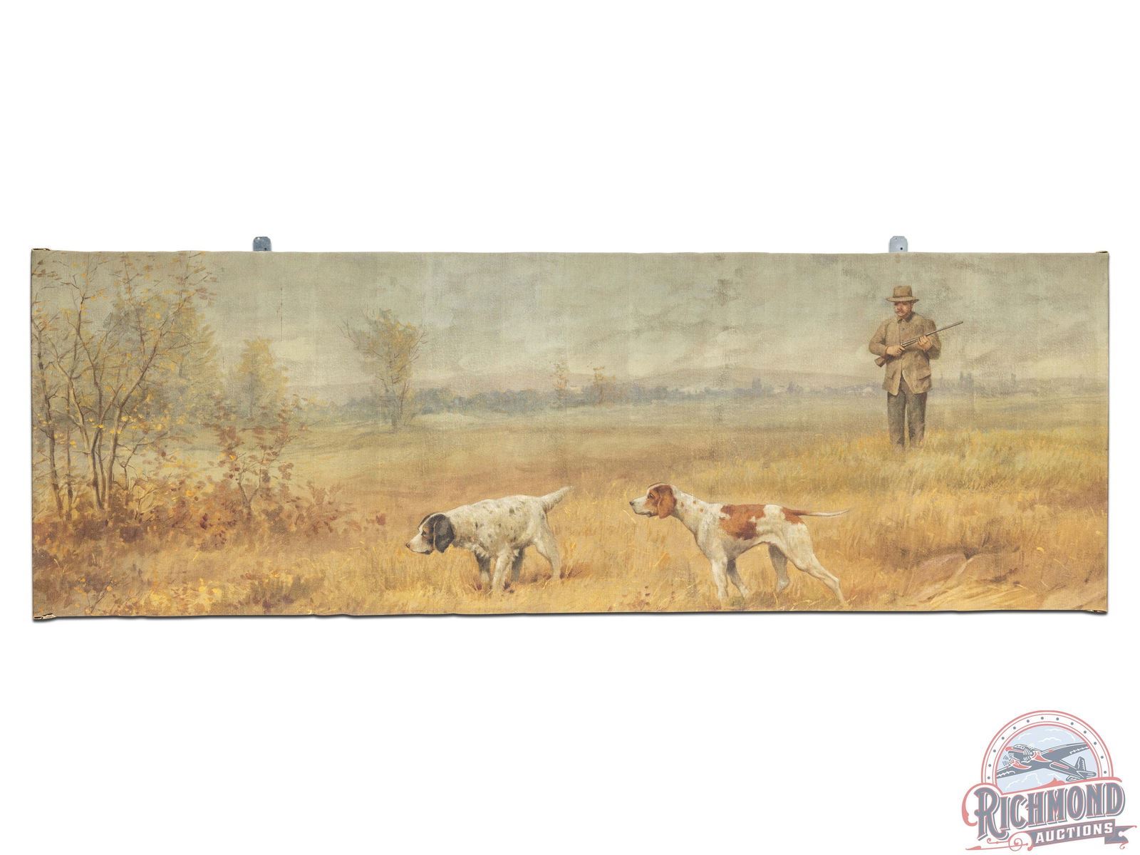 Lot 746 1900's Original Muslin Tapestry Painting "Quail - A Dead Stand" Hunter & Two English Pointer Dogs