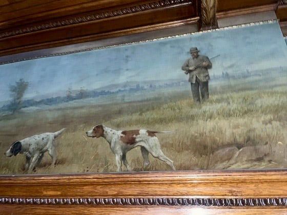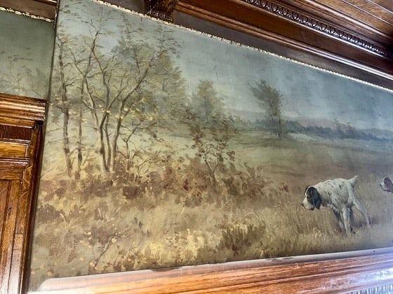 Measures 28" tall by 7' wide. This beautiful painting depicts a sportsman with a shotgun, in a woodland scene with two pointer dogs ready to flush a quail from the brush before them. This piece closely resembles A.B. Frost's original "Quail - A Dead Stand" that is part of his 1895 publication "Shooting Pictures", Charles Scribner's Sons Binding of the Portfolio booklet, as well as "The Sporting Art of Arthur Burdett Frost" by Colleen F. Storey, James A. Casada, Ph.D. and Charles Wechsler on page 170. Part of the Vandling mansion wallpaper collection.