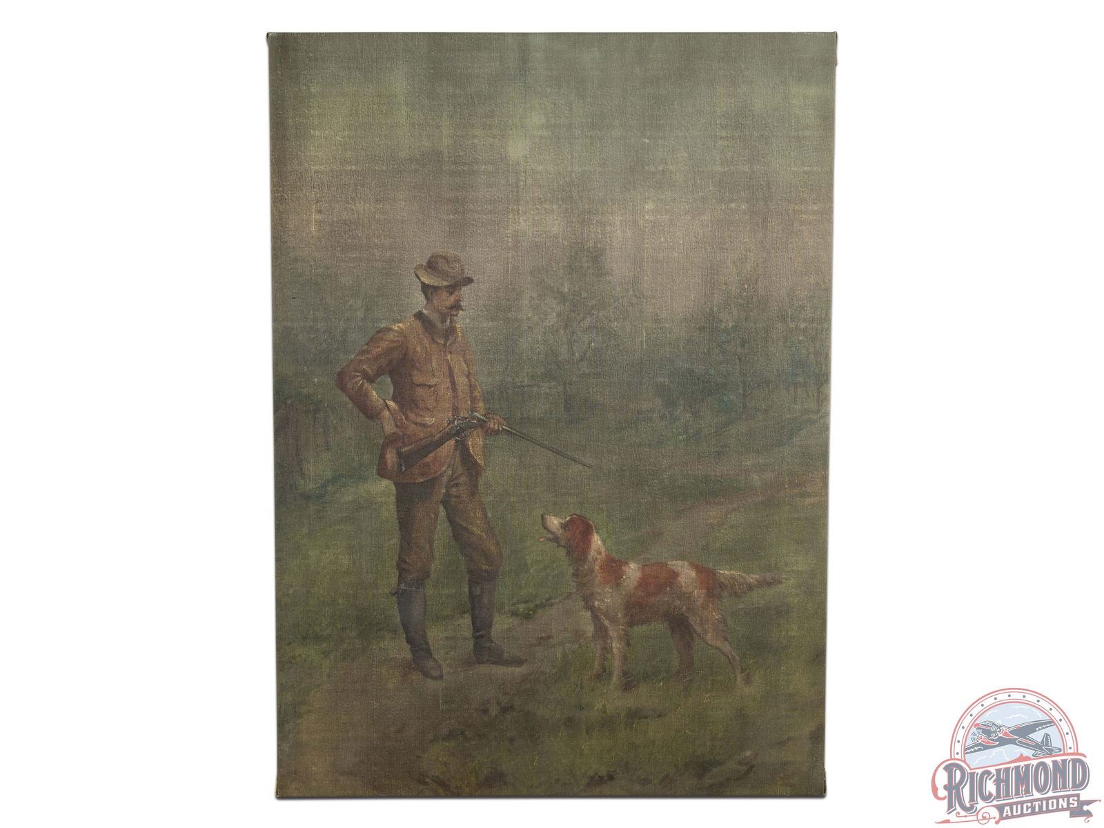 Lot 747 1900's Original Muslin Tapestry Painting Sportsman Hunter Reloading Shotgun w/ English Pointer Dog