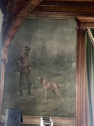 Measures 41" wide by 56" tall. This beautiful painting depicts a sportsman reloading his shotgun, in a woodland scene with his pointer dog ready for his command. This piece closely resembles A.B. Frost's original cover sketch part of his 1895 publication "Shooting Pictures", Charles Scribner's Sons Binding of the Portfolio booklet, as well as "The Sporting Art of Arthur Burdett Frost" by Colleen F. Storey, James A. Casada, Ph.D. and Charles Wechsler on page 145. Part of the Vandling mansion wallpaper collection.