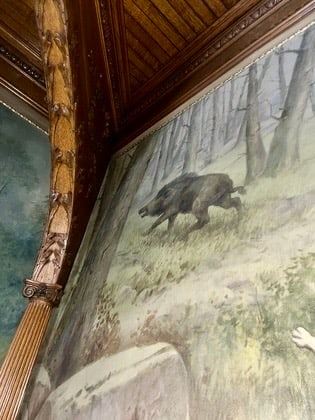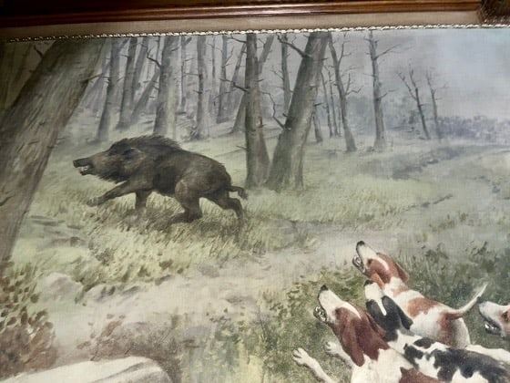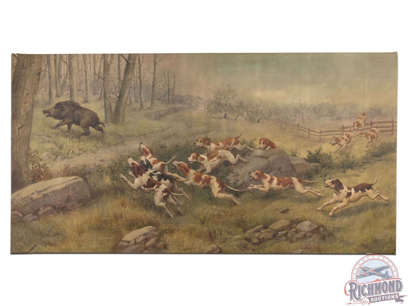 Large painting measures 56" tall by 9' wide. This beautiful large painting depicts 12 hound dogs chasing down a large boar. Field scene with fence and large rocks which are depicted in several works by A.B. Frost. Part of the Vandling mansion wallpaper collection.