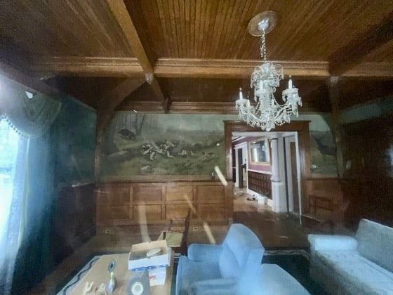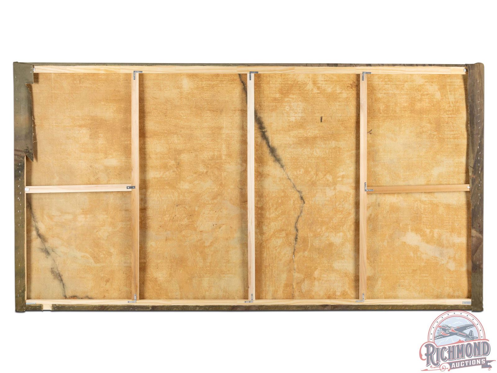 Each piece in this collection was masterfully painted on muslin, showcasing hunting and animal scenes that epitomize the genteel sporting life of the East Coast during that era. Separated in the mansion by mahogany columns and detailed molding, the paintings vary in size and were likely painted off-site with specific wall measurements provided to the artist. A unique number was placed on the reverse of each painting that is believed to correspond to a specific wall location in the room. Due to this unique installation method, no artist signatures have been discovered. It is speculated that signatures may have been placed at the bottom of each painting or on one lone piece, subsequently concealed by ornamental mahogany panels and trim, but potentially removed during the extraction process. The paintings were removed from the mansion before its demolition, preserving a unique slice of American artistic and cultural history. This feature adds to their individual allure, charm, and historical significance.
