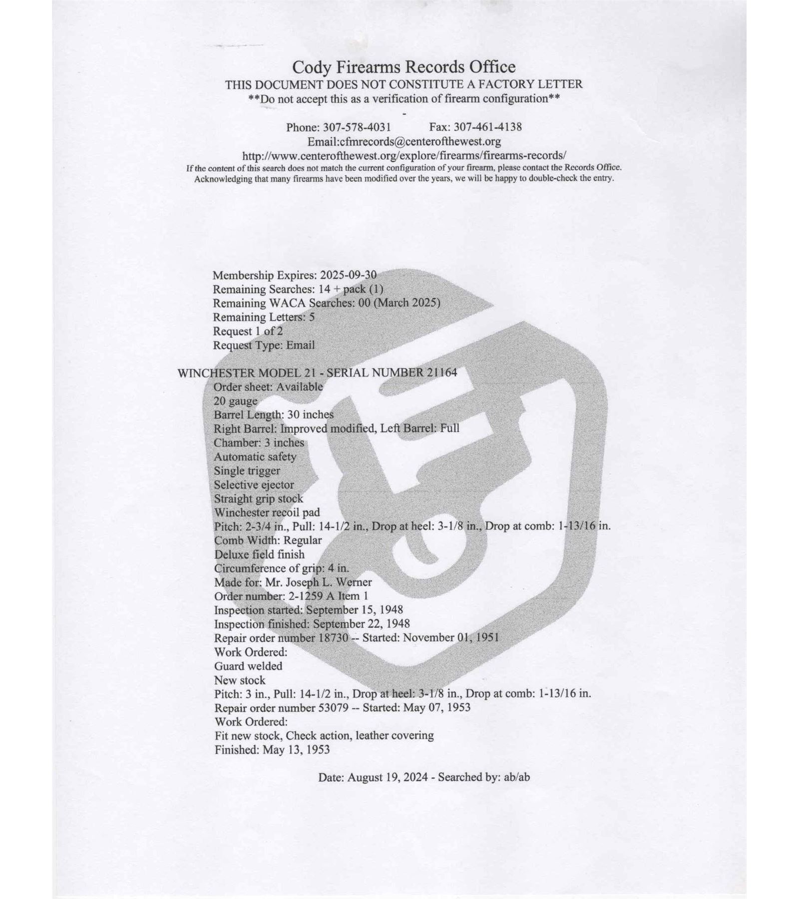 Manufactured by Winchester custom shop in 1948 and includes Cody Museum research. Features rare 30" blued finish 20 gauge special order barrels. Lyman red Hi-Viz front sight. Chambered for 3" shells with ejectors and choked Full and Improved Cylinder. Barrel flats and bores are engine turned with border engraving around outside and left barrel tops. Marked "Model 21 / Winchester / Trademark - 20 Gauge 3 IN". Blued side panel frame with engine turned water table, gold washed single selective trigger with automatic safety. Action has nearly full engraved coverage vignette and dog scene in the 21-6 pattern done by George Ulrich, Master Engraver for Winchester between 1933-1949. Left panel is engraved with a setter scene and the right engraved with pointer in a banner. Trigger guard marked "Engr. by George Ulrich". Blued English grip trigger guard with "JLW" in gold. Dark select walnut English grip stock with 22 LPI checkering and 21-A carving. Fitted with Winchester leather faced recoil pad. Matching 21-A carved and checkered Skeet style beavertail forearm with ebony inlay and blued floral engraved roller latch. Research letter states all options, repairs, and returns done for the original owner, Joseph L. Werner. A fine Model 21! LOP: 14-1/2". DAC: 1-1/8". DAH: 3-1/8". CALIBER: 20 GA. S/N: 21164. FFL STATUS: Curio & Relic.