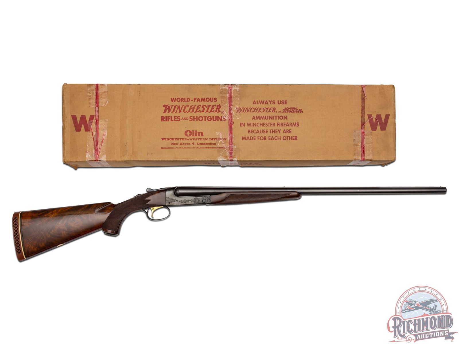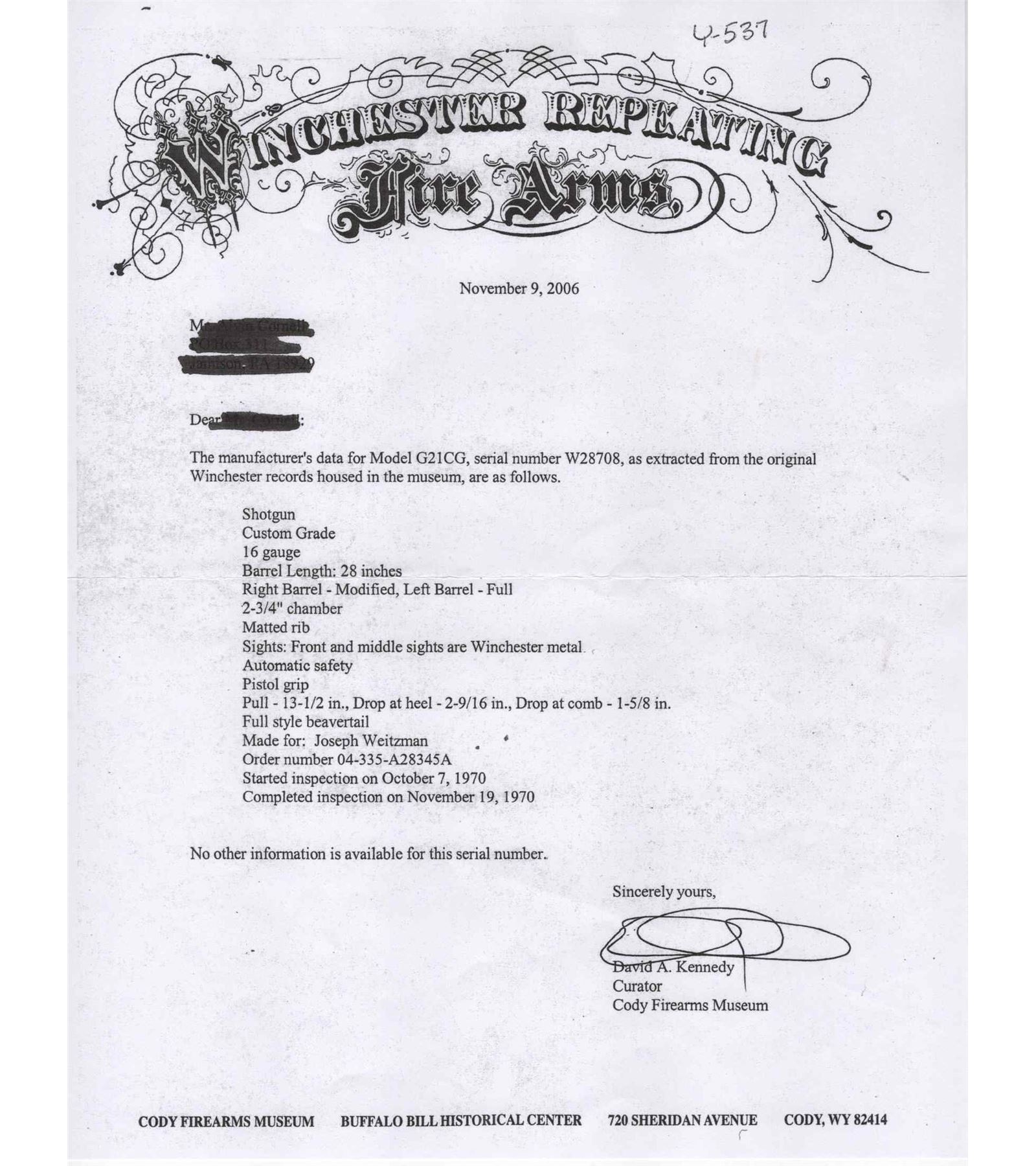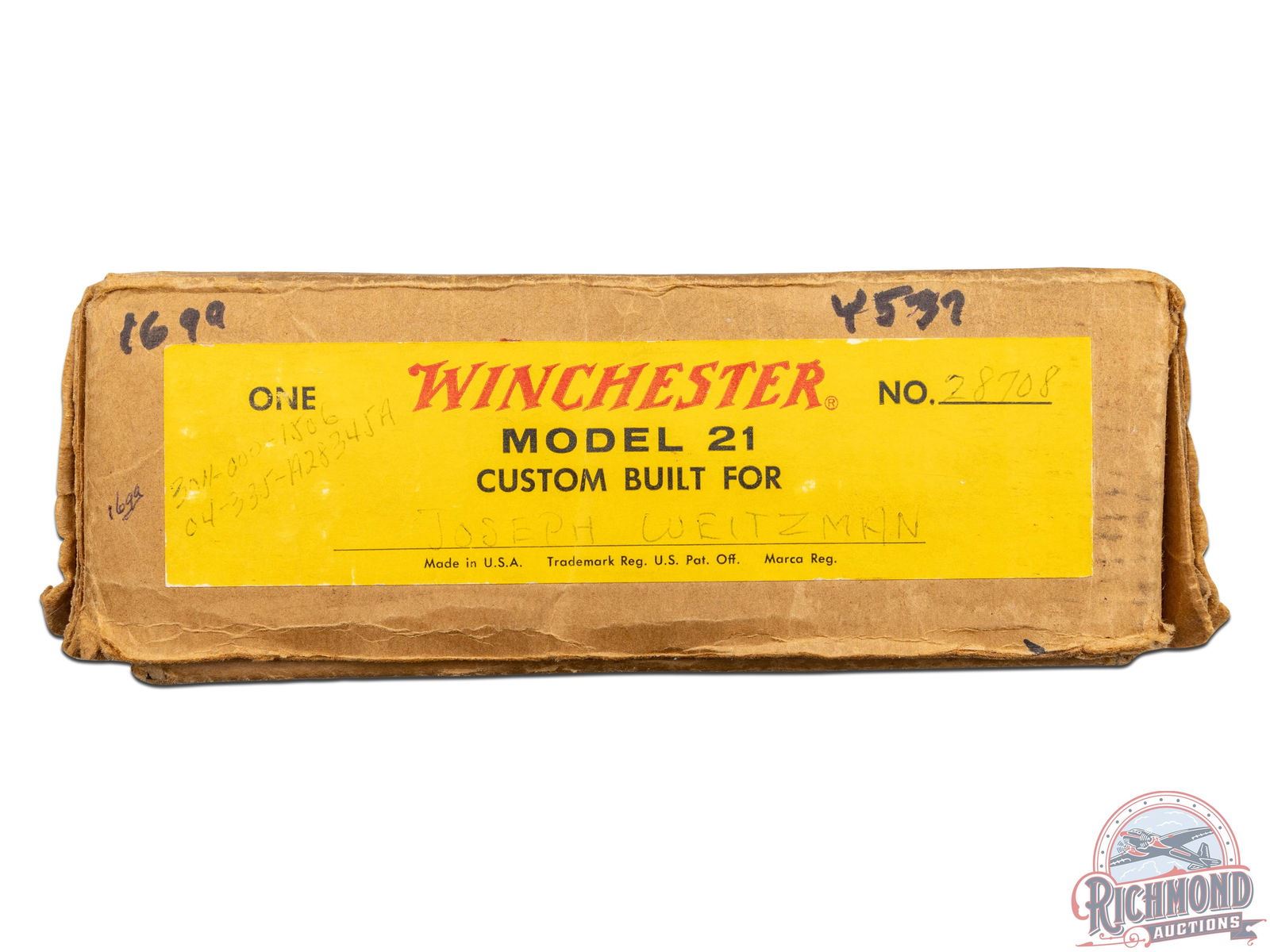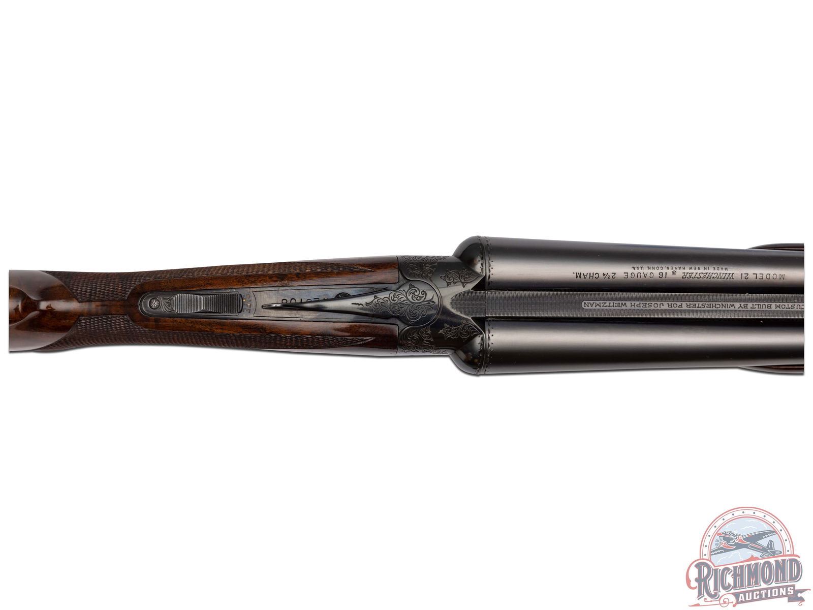 Manufactured in 1970 and custom built for Joseph Weitzman, a 5th Ave New York power attorney. Cody Museum factory letter dates the completion of this Custom Grade on November 19th, 1970. Features 28" blued solid matted rib barrels with 2-3/4" chambers. Right barrel with Modified choke and Full on the left. Blued No. 1 custom engraving pattern (found on page 54 of "Winchester Factory Engraving Collector's Guide" by Pauline Muerrle) features a floral scroll pattern on the sides, bottom, trigger guard and lever. Gold washed trigger and diamond cut water table with extractors. Nicely figured feather crotch walnut stock with hand-checkered pistol grip. Fitted with a blued steel pistol grip cap, brass oval inlay on the bottom, and red Winchester factory ventilated rubber recoil pad. Matching walnut beavertail style forearm with hand-checkering, ebony tip, and engraved blued latch. Comes in the original Winchester factory box. LOP: 13-1/2". DAC: 1-5/8". DAH: 2-1/2". CALIBER: 16 GA. S/N: W28708. FFL STATUS: Curio & Relic.