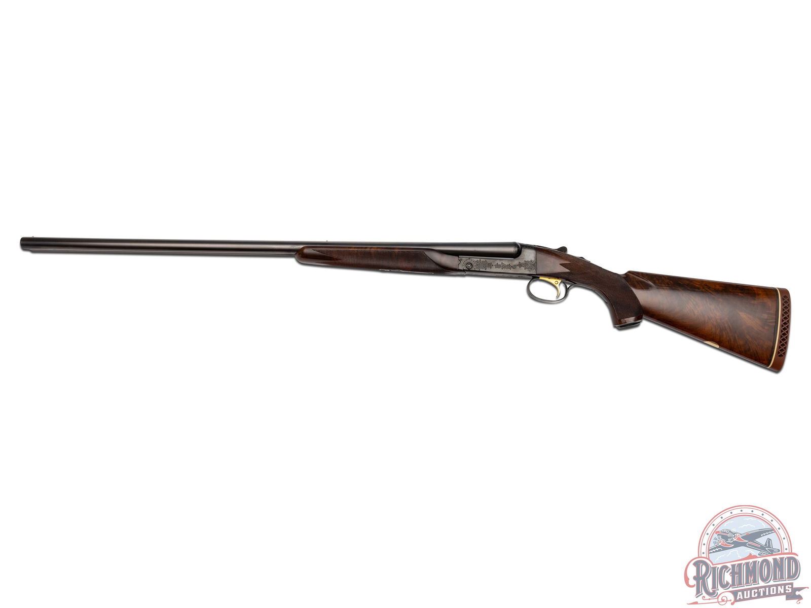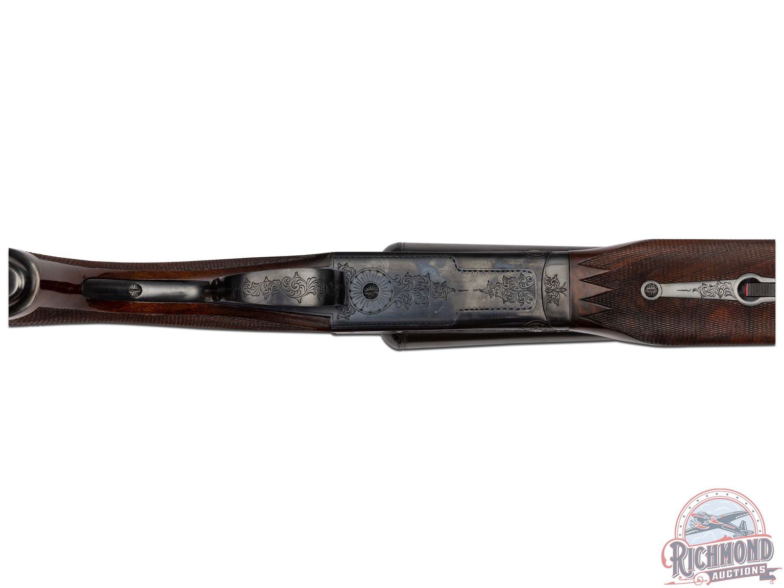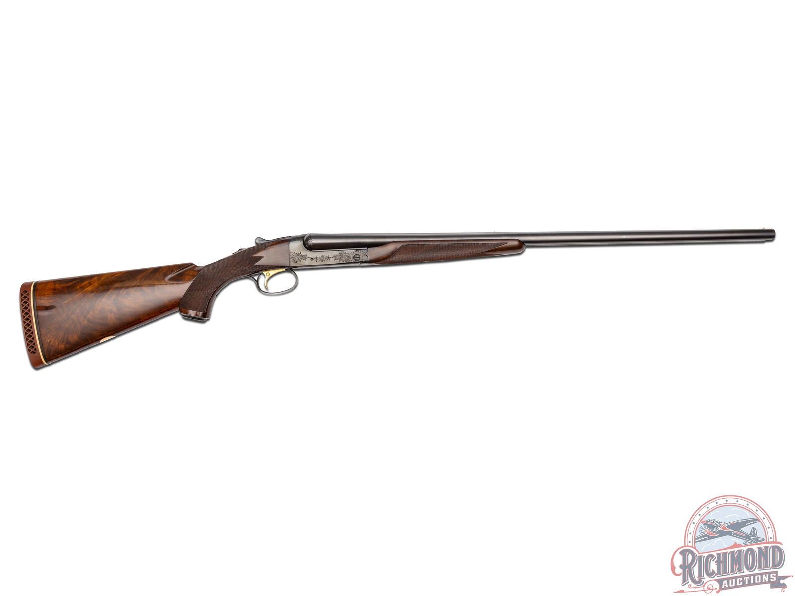 Manufactured in 1970 and custom built for Joseph Weitzman, a 5th Ave New York power attorney. Cody Museum factory letter dates the completion of this Custom Grade on November 19th, 1970. Features 28" blued solid matted rib barrels with 2-3/4" chambers. Right barrel with Modified choke and Full on the left. Blued No. 1 custom engraving pattern (found on page 54 of "Winchester Factory Engraving Collector's Guide" by Pauline Muerrle) features a floral scroll pattern on the sides, bottom, trigger guard and lever. Gold washed trigger and diamond cut water table with extractors. Nicely figured feather crotch walnut stock with hand-checkered pistol grip. Fitted with a blued steel pistol grip cap, brass oval inlay on the bottom, and red Winchester factory ventilated rubber recoil pad. Matching walnut beavertail style forearm with hand-checkering, ebony tip, and engraved blued latch. Comes in the original Winchester factory box. LOP: 13-1/2". DAC: 1-5/8". DAH: 2-1/2". CALIBER: 16 GA. S/N: W28708. FFL STATUS: Curio & Relic.