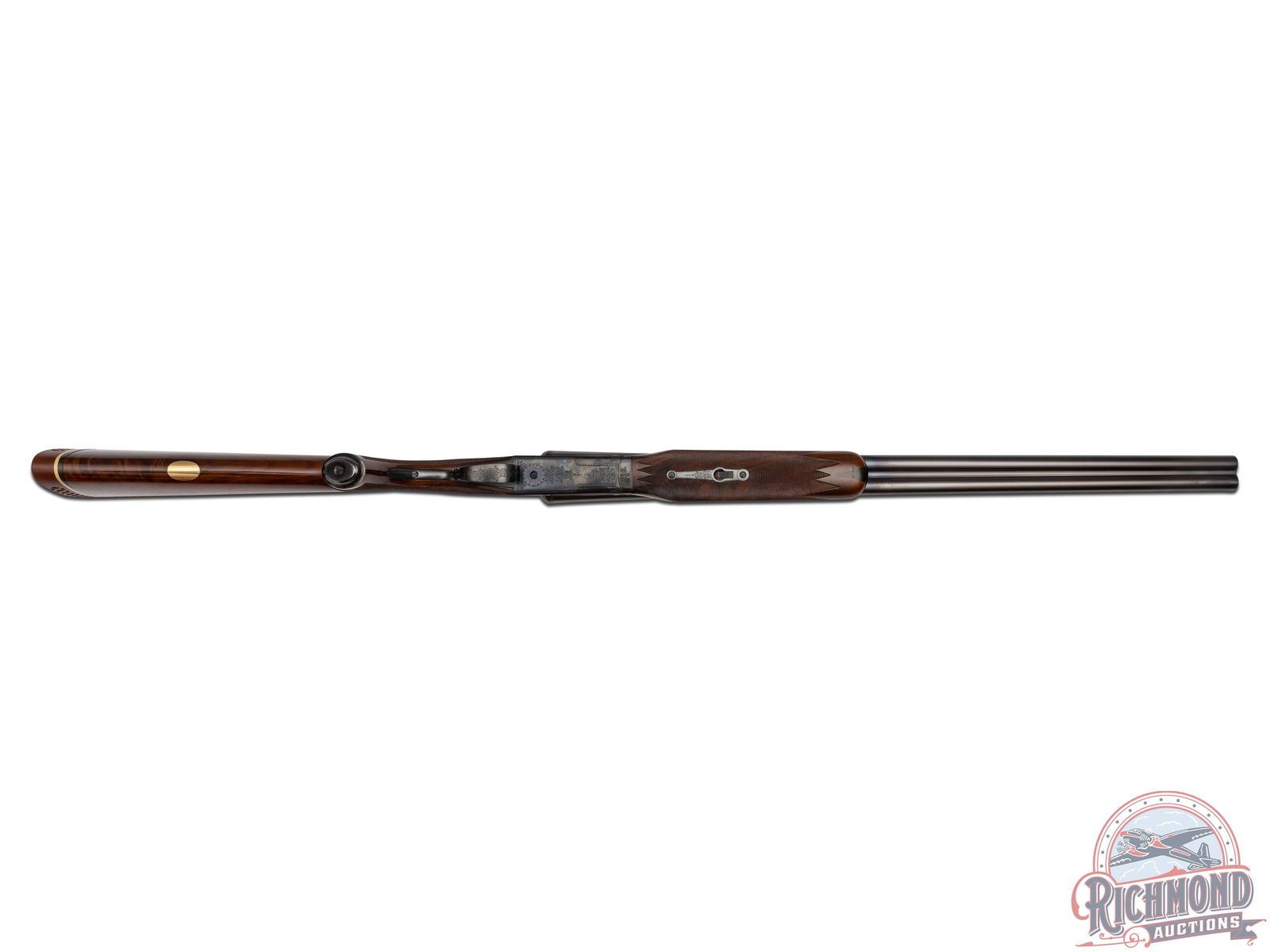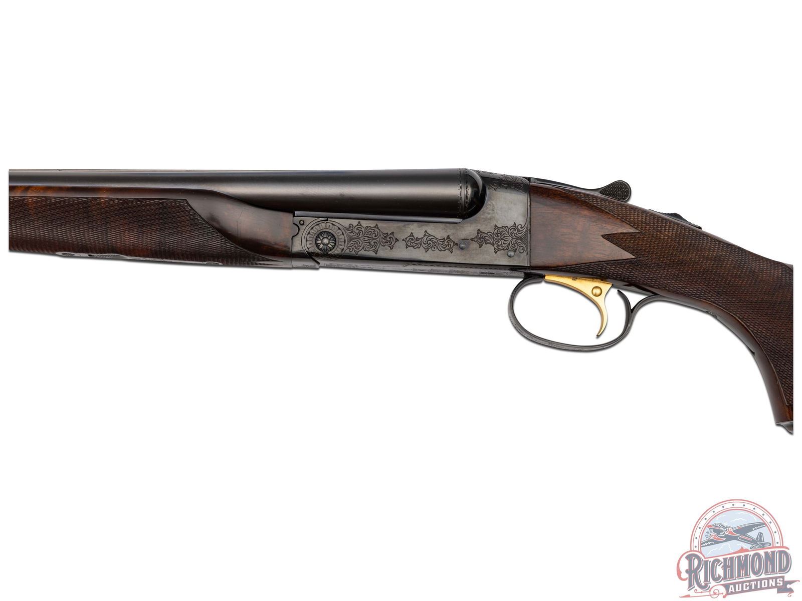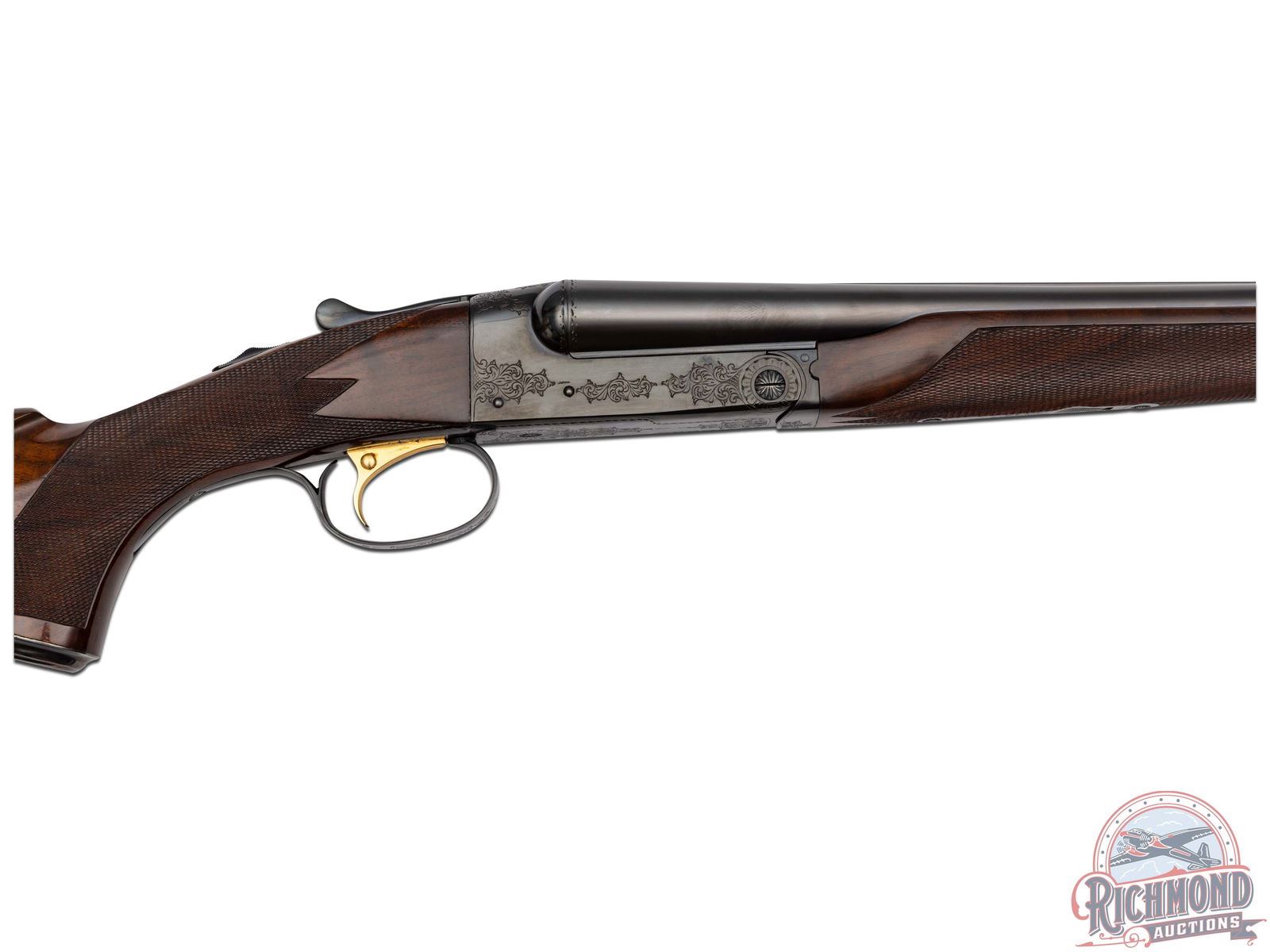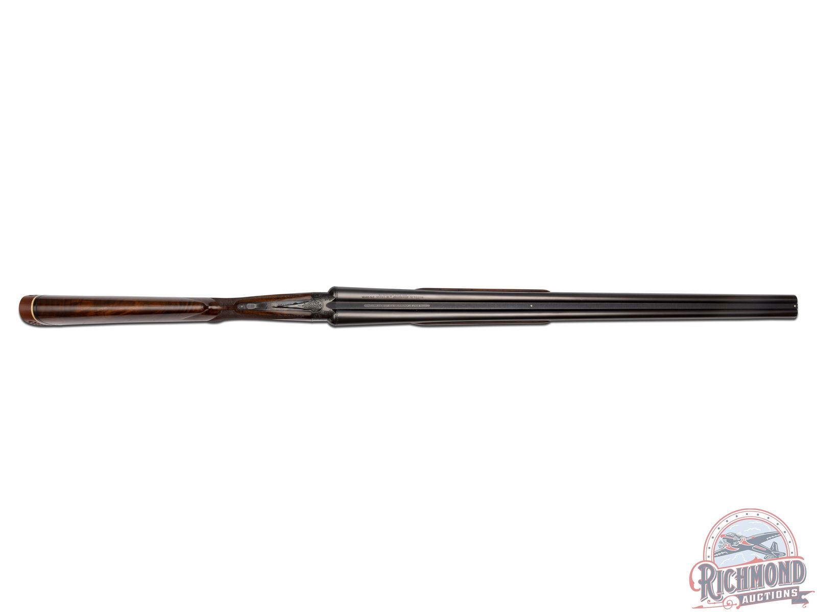 Manufactured in 1970 and custom built for Joseph Weitzman, a 5th Ave New York power attorney. Cody Museum factory letter dates the completion of this Custom Grade on November 19th, 1970. Features 28" blued solid matted rib barrels with 2-3/4" chambers. Right barrel with Modified choke and Full on the left. Blued No. 1 custom engraving pattern (found on page 54 of "Winchester Factory Engraving Collector's Guide" by Pauline Muerrle) features a floral scroll pattern on the sides, bottom, trigger guard and lever. Gold washed trigger and diamond cut water table with extractors. Nicely figured feather crotch walnut stock with hand-checkered pistol grip. Fitted with a blued steel pistol grip cap, brass oval inlay on the bottom, and red Winchester factory ventilated rubber recoil pad. Matching walnut beavertail style forearm with hand-checkering, ebony tip, and engraved blued latch. Comes in the original Winchester factory box. LOP: 13-1/2". DAC: 1-5/8". DAH: 2-1/2". CALIBER: 16 GA. S/N: W28708. FFL STATUS: Curio & Relic.