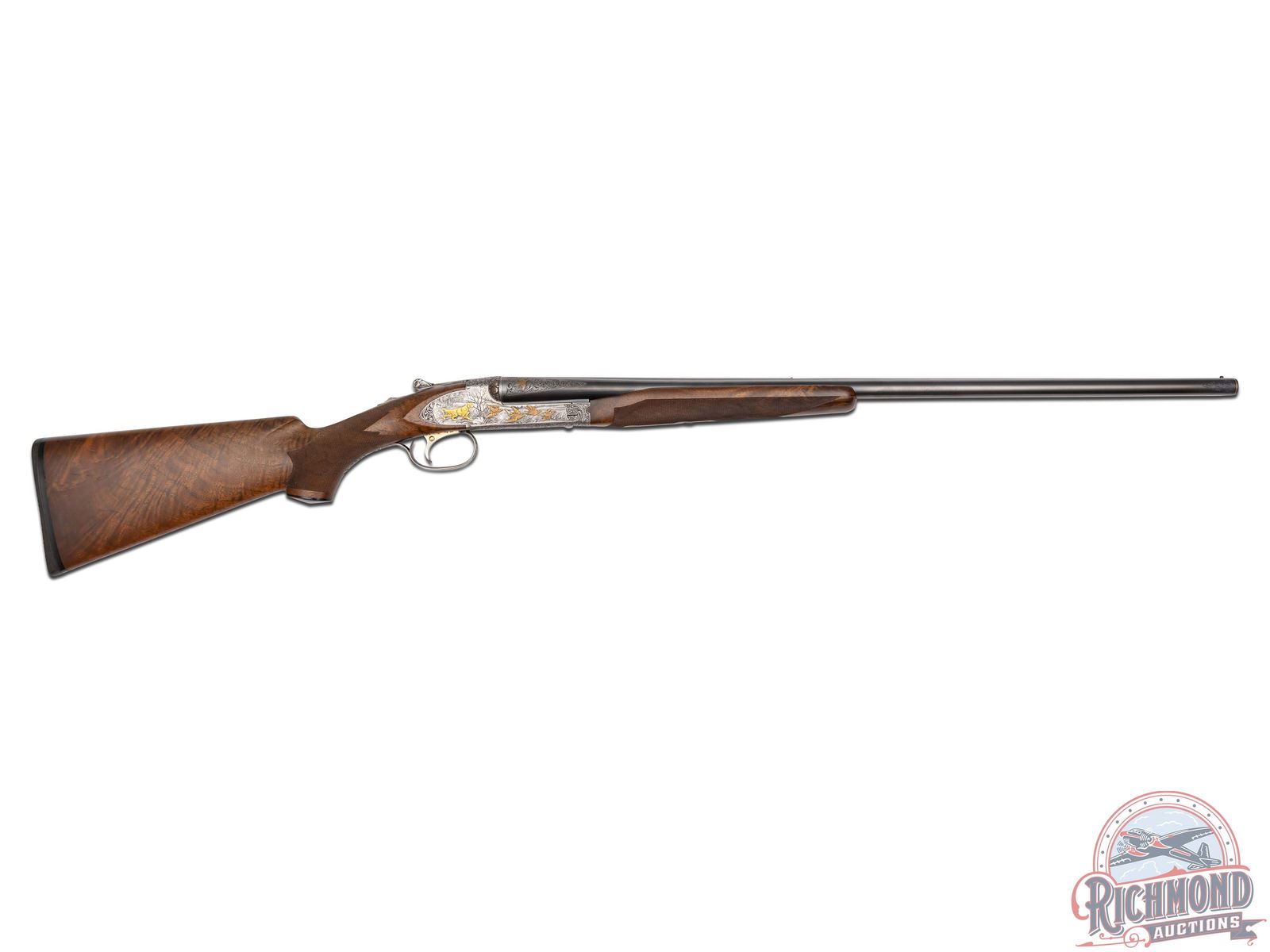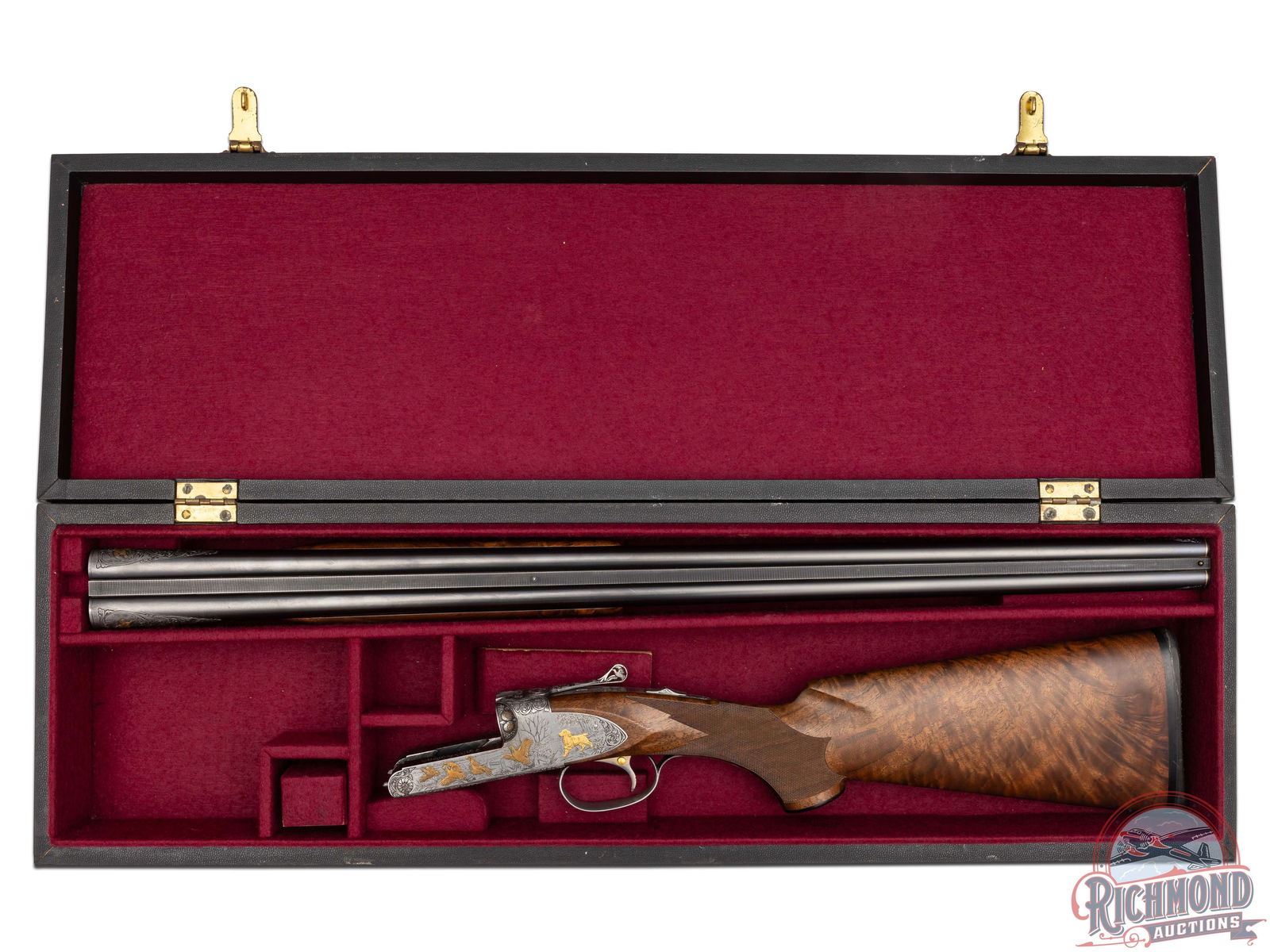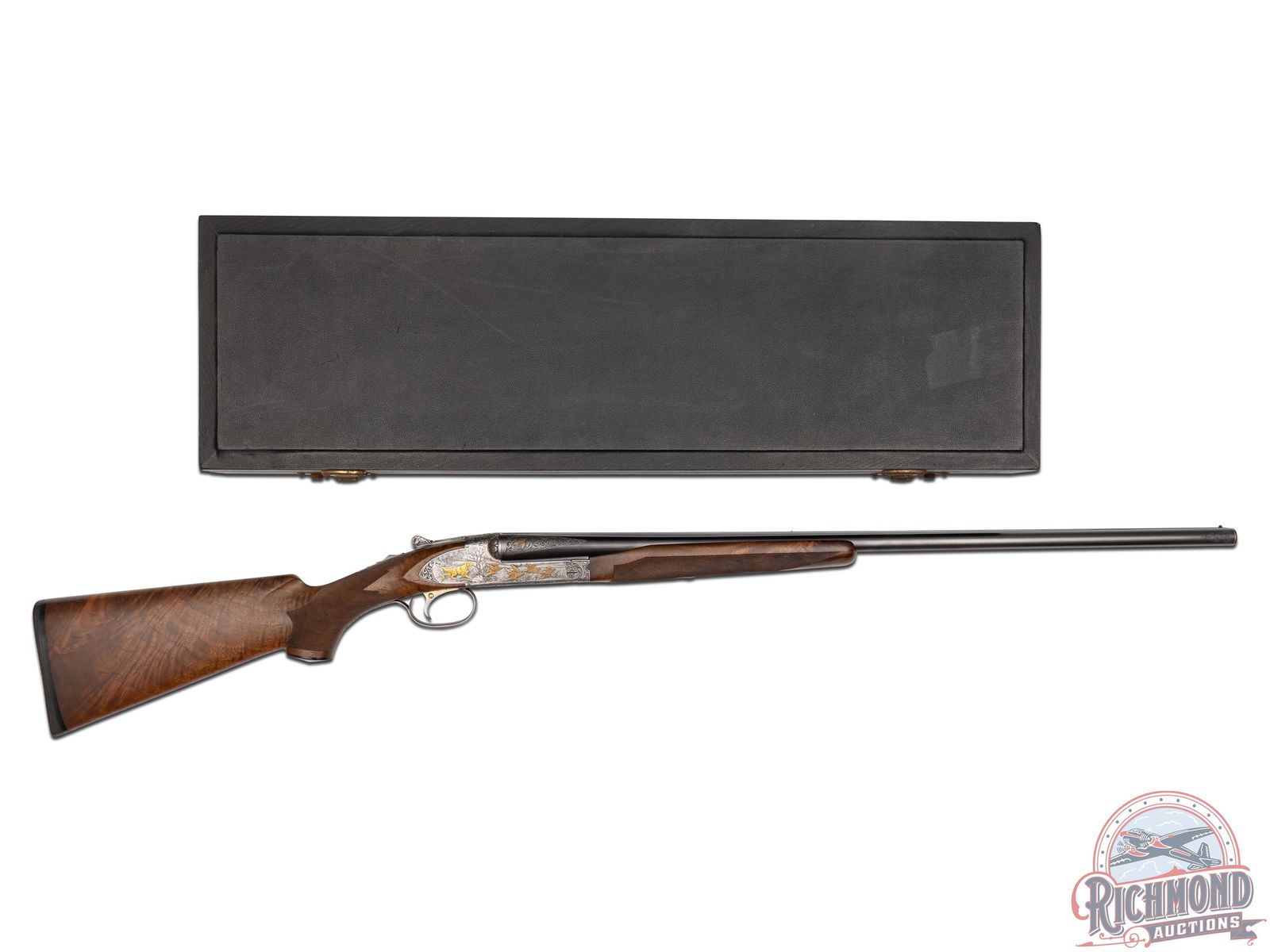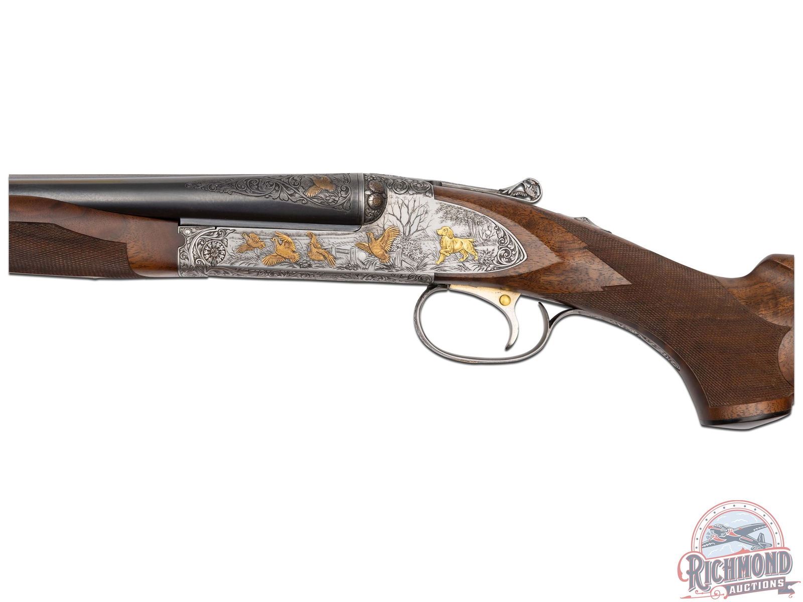Made by Winchester Repeating Arms in 1949 and upgraded at an unknown date possibly by Frank Pachmayr. Cody Factory Research states this gun was made in 1949 as a Skeet Grade with dimensions similar to current dimensions. Fitted with matching 28" blued Winchester Proof Steel barrels with raised matted rib, twin bead sight, 2-3/4" chambers, ejectors, and Winchester Skeet 1 and Winchester Skeet 2 chokes. Barrels are floral engraved at breeches with quail scene with quail in gold. Muzzles are floral engraved with gold ring borders. Satin finished round action fitted with sideplates, gold washed Winchester single selective trigger and non-selective top tang safety. Action is extremely well executed with left side featuring a wooded background with gold inlaid setter flushing four gold quail. Right side features wooded scene with gold inlaid setter flushing four gold doves. Top of action has floral engraving with serial number and "SAFE" in gold with chiseled flowers on barrel lugs with gold washed centers. Bottom of receiver has floral pattern with six gold inlaid quail in fence row scene. Winchester "Skeet" marking is in gold along with "L" trigger selections. trigger guard has satin finish with floral and wooded scene with gold inlaid woodcock. Custom Feathercrotch walnut hard rubber finish fine line checkered pistol grip stock with Pachmayr hard rubber recoil pad and unmarked hard rubber grip. Matching walnut full coverage fine checkered beavertail forearm with floral engraved satin finished hardware with roller latch. Comes in custom fitted trunk type display case. LOP: 14". DAC: 1-1/2". DAH: 2-1/4". CALIBER: 20 GA. S/N: 22191. FFL STATUS: Curio & Relic.
