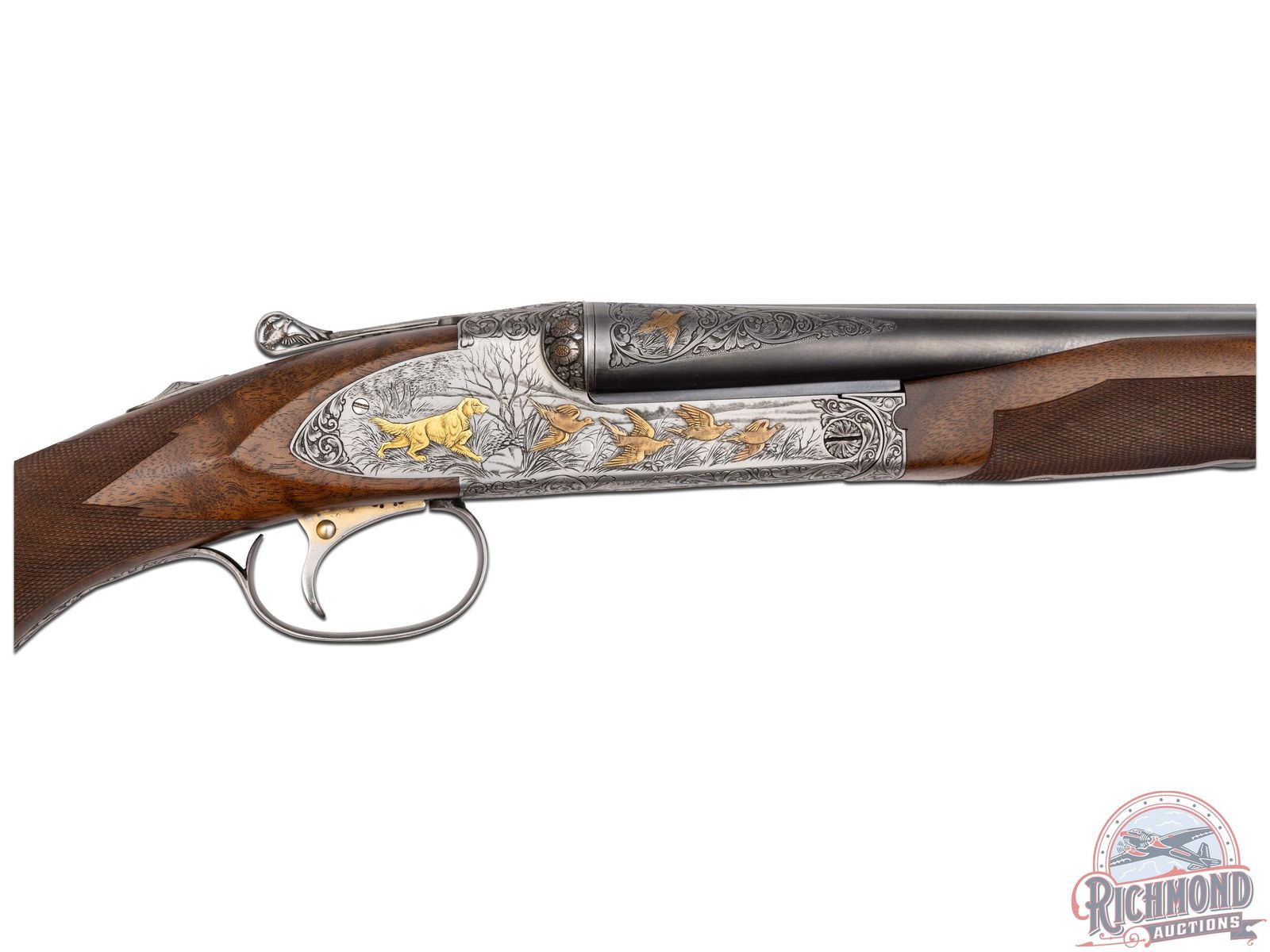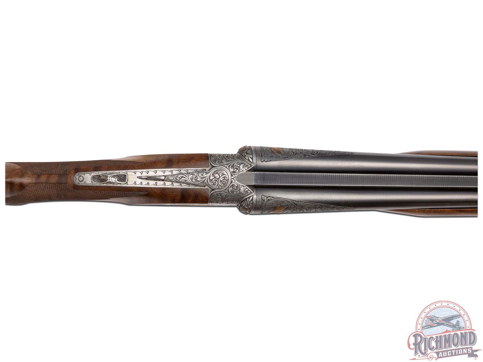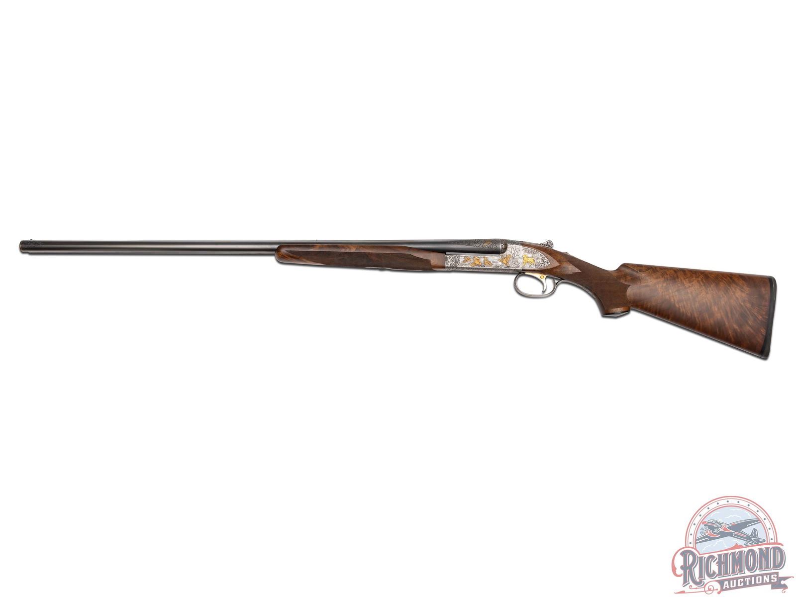 Made by Winchester Repeating Arms in 1949 and upgraded at an unknown date possibly by Frank Pachmayr. Cody Factory Research states this gun was made in 1949 as a Skeet Grade with dimensions similar to current dimensions. Fitted with matching 28" blued Winchester Proof Steel barrels with raised matted rib, twin bead sight, 2-3/4" chambers, ejectors, and Winchester Skeet 1 and Winchester Skeet 2 chokes. Barrels are floral engraved at breeches with quail scene with quail in gold. Muzzles are floral engraved with gold ring borders. Satin finished round action fitted with sideplates, gold washed Winchester single selective trigger and non-selective top tang safety. Action is extremely well executed with left side featuring a wooded background with gold inlaid setter flushing four gold quail. Right side features wooded scene with gold inlaid setter flushing four gold doves. Top of action has floral engraving with serial number and "SAFE" in gold with chiseled flowers on barrel lugs with gold washed centers. Bottom of receiver has floral pattern with six gold inlaid quail in fence row scene. Winchester "Skeet" marking is in gold along with "L" trigger selections. trigger guard has satin finish with floral and wooded scene with gold inlaid woodcock. Custom Feathercrotch walnut hard rubber finish fine line checkered pistol grip stock with Pachmayr hard rubber recoil pad and unmarked hard rubber grip. Matching walnut full coverage fine checkered beavertail forearm with floral engraved satin finished hardware with roller latch. Comes in custom fitted trunk type display case. LOP: 14". DAC: 1-1/2". DAH: 2-1/4". CALIBER: 20 GA. S/N: 22191. FFL STATUS: Curio & Relic.