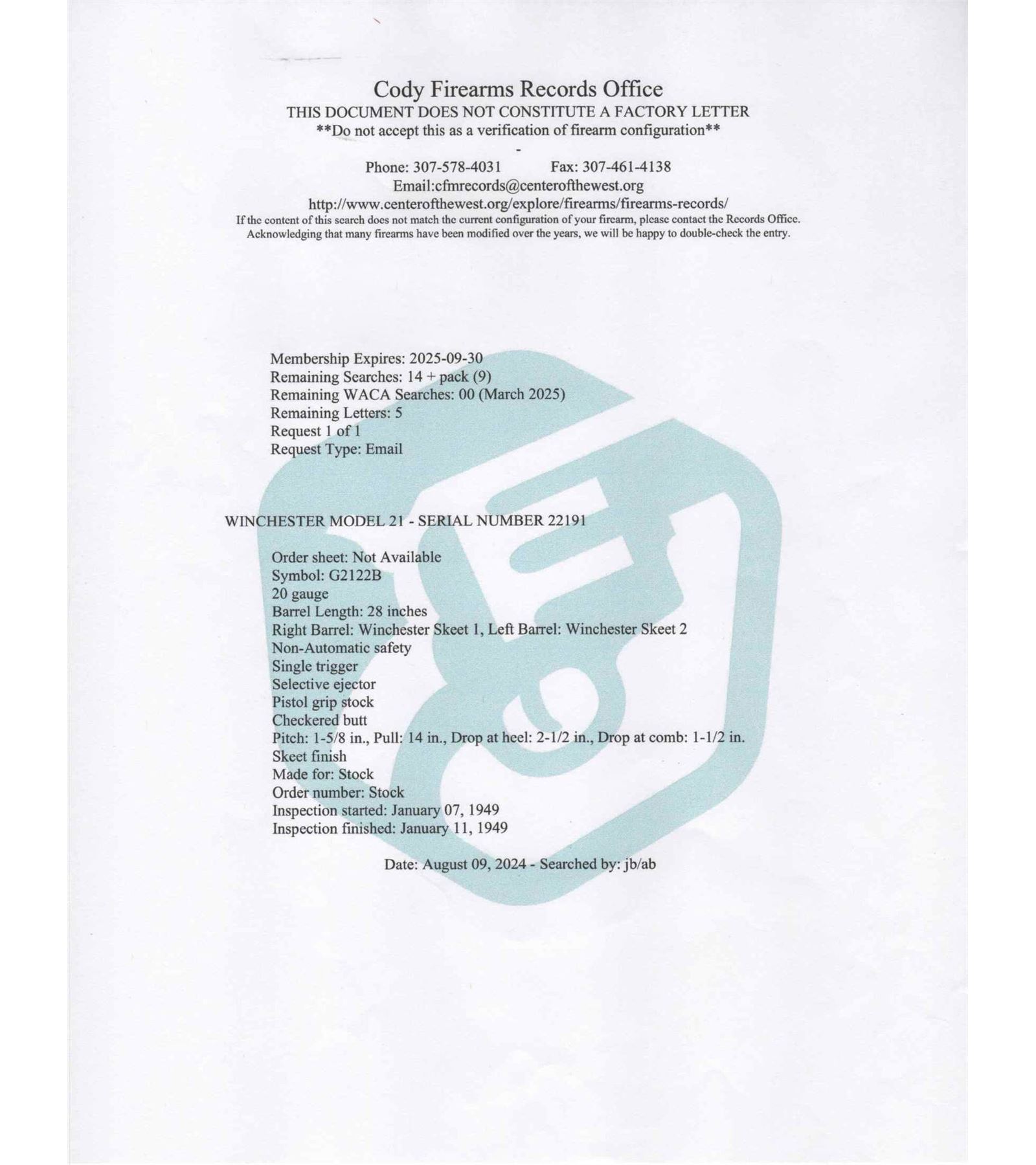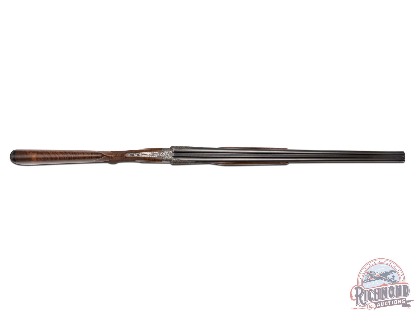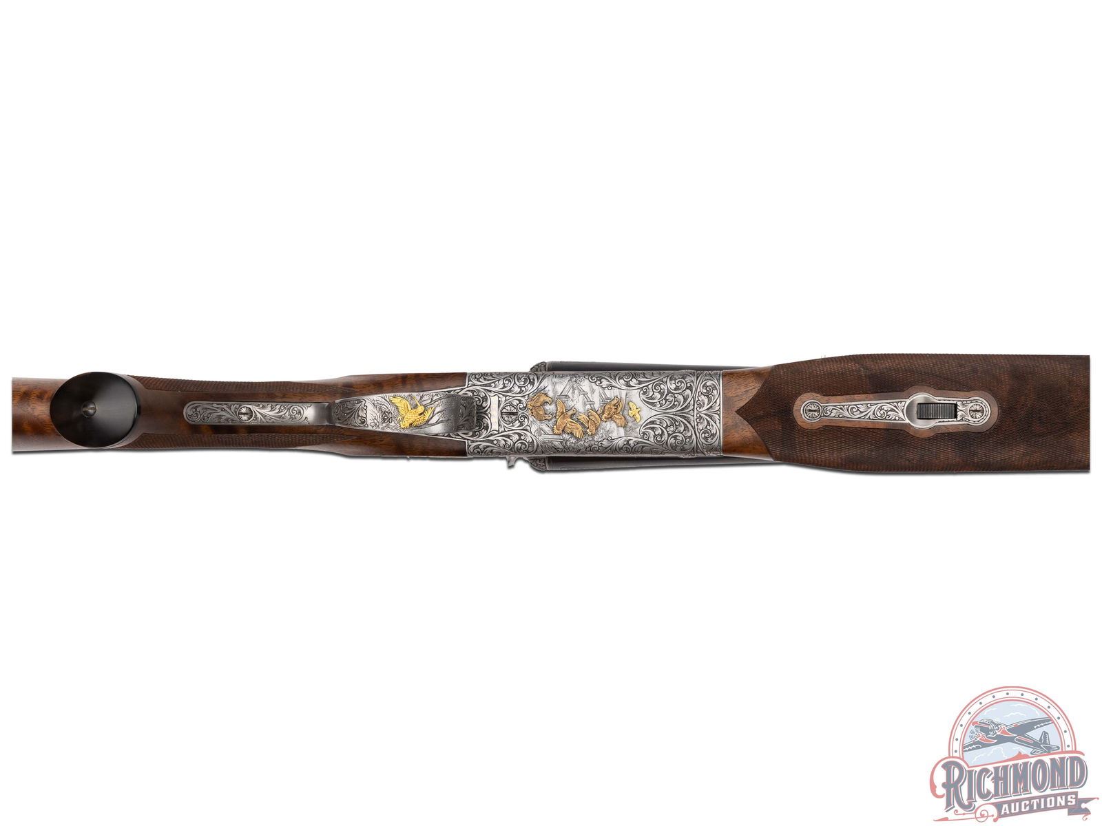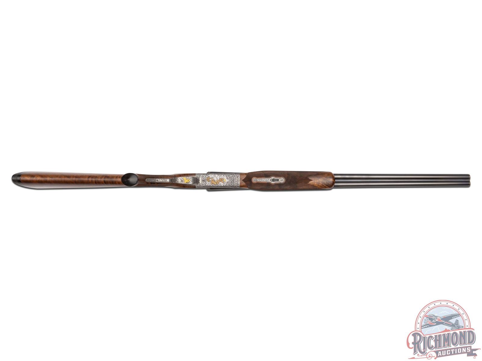 Made by Winchester Repeating Arms in 1949 and upgraded at an unknown date possibly by Frank Pachmayr. Cody Factory Research states this gun was made in 1949 as a Skeet Grade with dimensions similar to current dimensions. Fitted with matching 28" blued Winchester Proof Steel barrels with raised matted rib, twin bead sight, 2-3/4" chambers, ejectors, and Winchester Skeet 1 and Winchester Skeet 2 chokes. Barrels are floral engraved at breeches with quail scene with quail in gold. Muzzles are floral engraved with gold ring borders. Satin finished round action fitted with sideplates, gold washed Winchester single selective trigger and non-selective top tang safety. Action is extremely well executed with left side featuring a wooded background with gold inlaid setter flushing four gold quail. Right side features wooded scene with gold inlaid setter flushing four gold doves. Top of action has floral engraving with serial number and "SAFE" in gold with chiseled flowers on barrel lugs with gold washed centers. Bottom of receiver has floral pattern with six gold inlaid quail in fence row scene. Winchester "Skeet" marking is in gold along with "L" trigger selections. trigger guard has satin finish with floral and wooded scene with gold inlaid woodcock. Custom Feathercrotch walnut hard rubber finish fine line checkered pistol grip stock with Pachmayr hard rubber recoil pad and unmarked hard rubber grip. Matching walnut full coverage fine checkered beavertail forearm with floral engraved satin finished hardware with roller latch. Comes in custom fitted trunk type display case. LOP: 14". DAC: 1-1/2". DAH: 2-1/4". CALIBER: 20 GA. S/N: 22191. FFL STATUS: Curio & Relic.