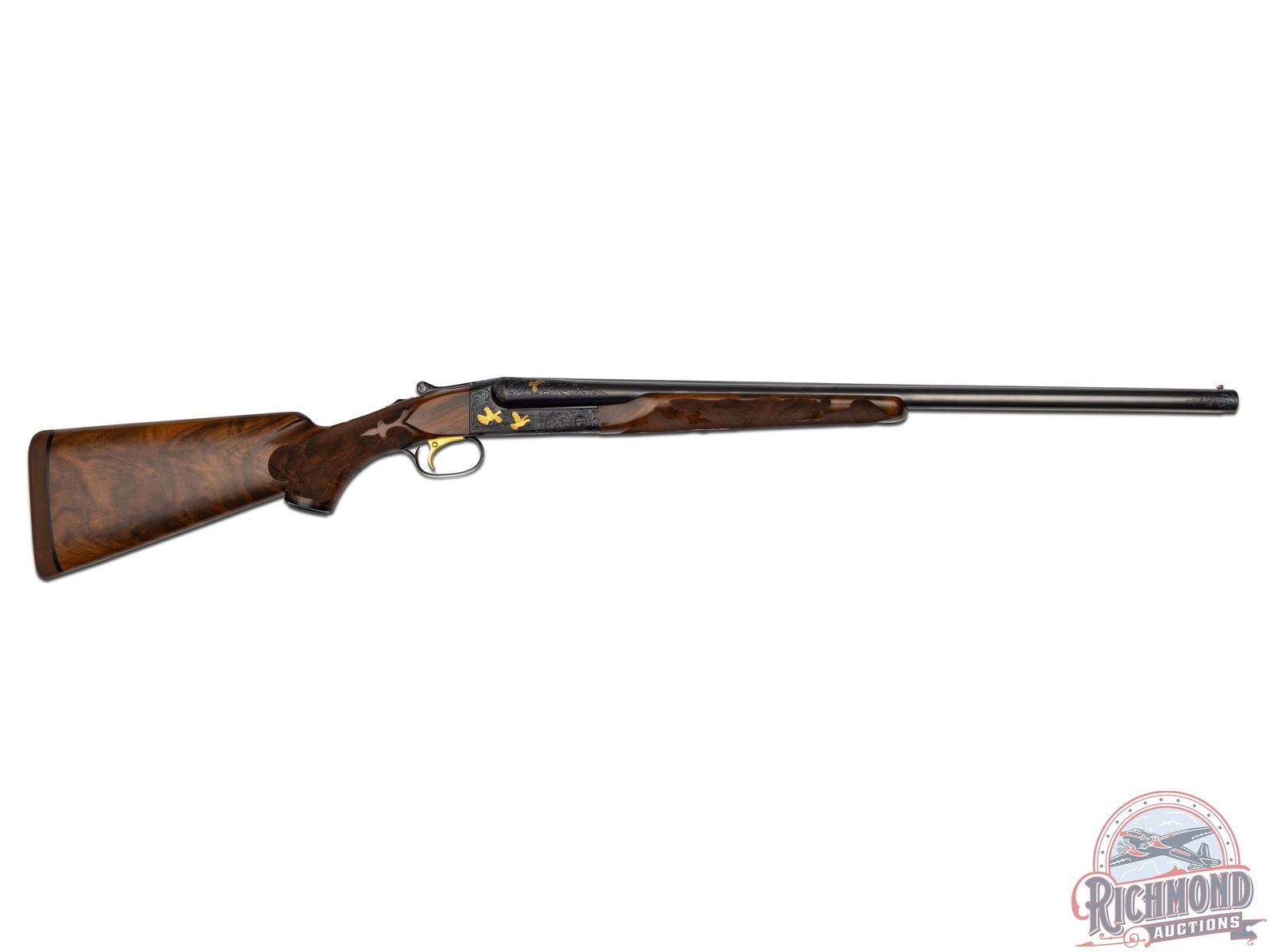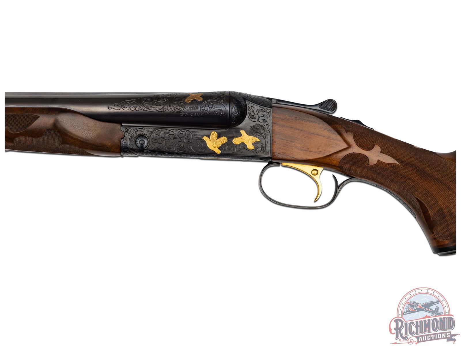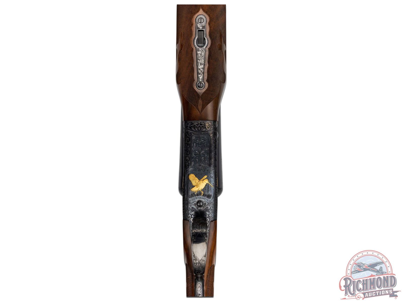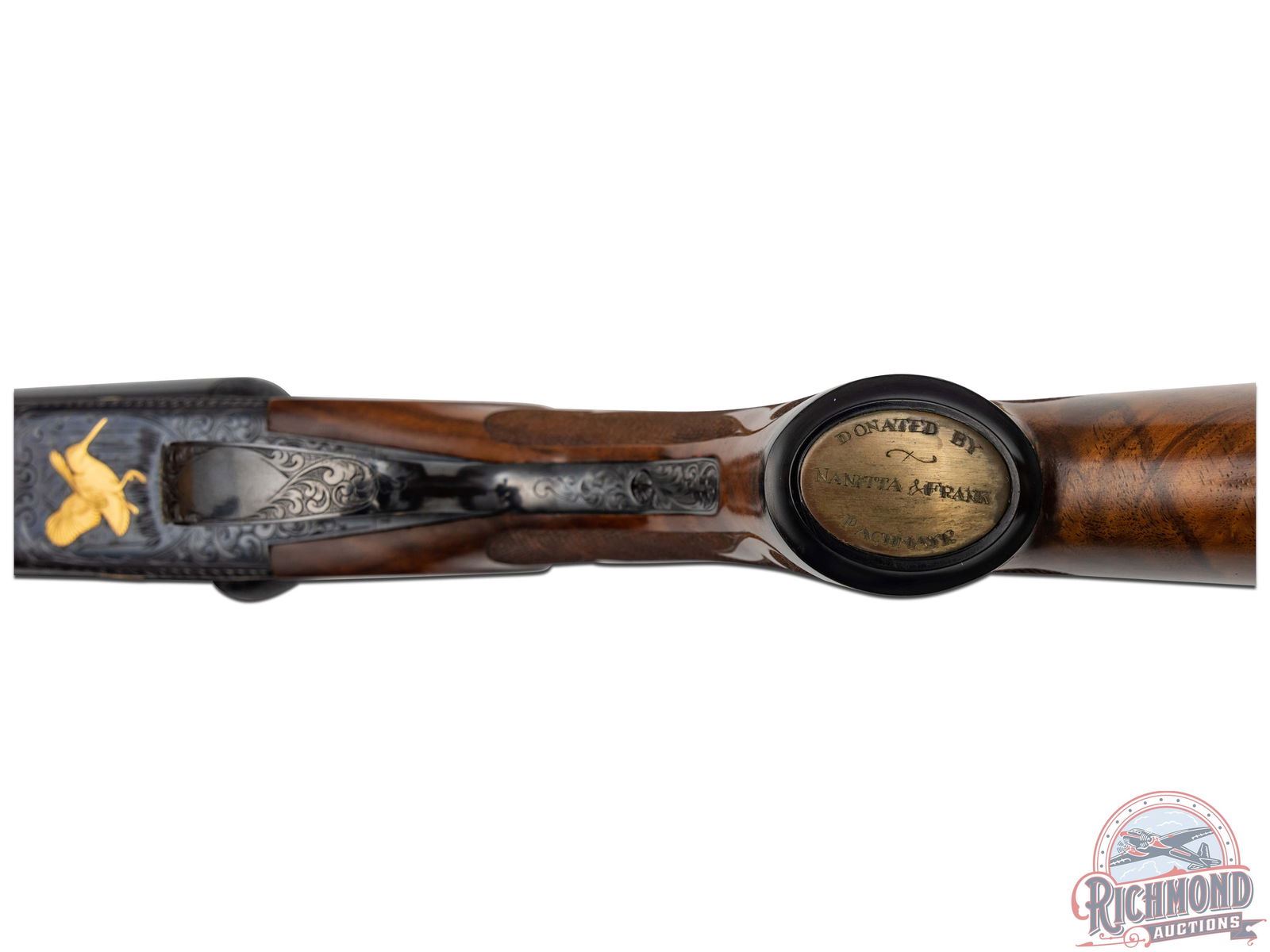 The Cody Firearms Records Office confirms original production by Winchester in 1940 for the H&D Folsom Arms Company. Later upgraded by Frank Pachmayr at unknown time for donation to Pachmayr supported organizations. Blued 26" Winchester proof steel barrels with matted rib, Lyman bead front sight, steel bead mid sight with ejectors, 2-3/4" chambers with WS-1 and WS-2 chokes in 12 Gauge. Barrels have deep relief floral engraving at muzzle and breech with gold banding. Left breech has gold quail in flight and "Pachmayr Custom" in gold. Right breech has a quail in flight in gold. Blued relief floral engraved receiver marked "TOURNAMENT" with left panel having two gold quails. Right panel has two gold grouse in flight. Floor plate has large woodcock in flight in gold. Action has original gold-plated Winchester single selective trigger and non automatic tang safety. Walnut feather crotch pistol grip stock with Fleur de Lis and flame checkering, Pachmayr "Old English" rubber recoil pad and Pachmayr hard rubber grip cap with silver plaque inscribed "DONATED BY NANITA AND FRANK PACHMAYR". Matching Fleur de Lis checkered walnut beavertail forearm with blued floral engraved roller latch and forearm iron. Includes a research letter from the Cody Firearms Records Office. LOP: 14-1/4". DAC: 1-1/4". DAH: 2". CALIBER: 12 GA. S/N: 13507. FFL STATUS: Curio & Relic.