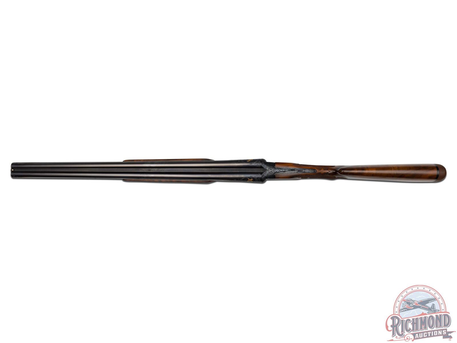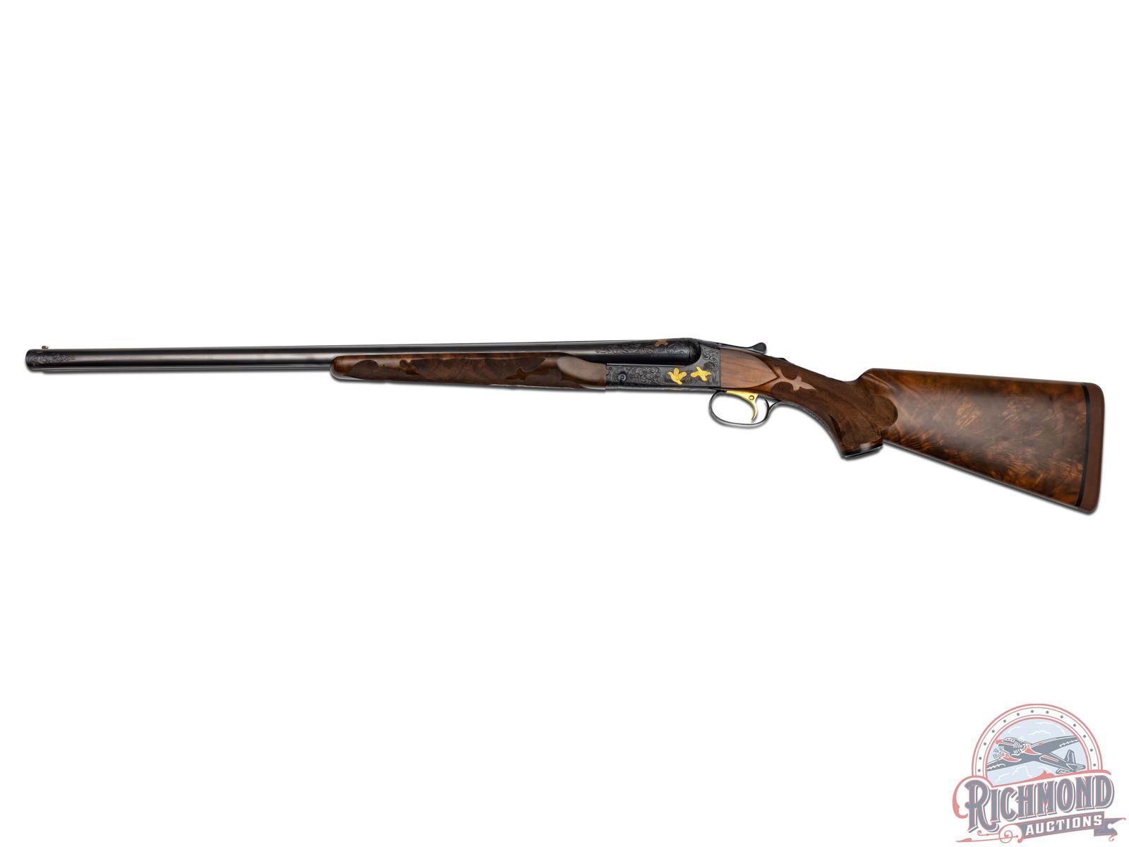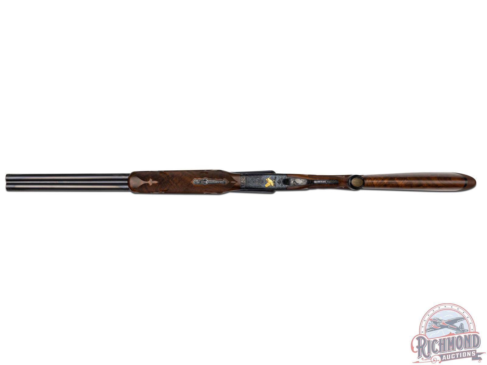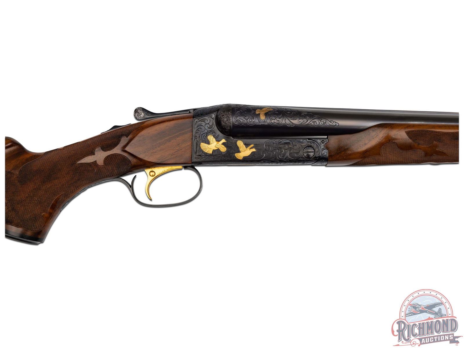 The Cody Firearms Records Office confirms original production by Winchester in 1940 for the H&D Folsom Arms Company. Later upgraded by Frank Pachmayr at unknown time for donation to Pachmayr supported organizations. Blued 26" Winchester proof steel barrels with matted rib, Lyman bead front sight, steel bead mid sight with ejectors, 2-3/4" chambers with WS-1 and WS-2 chokes in 12 Gauge. Barrels have deep relief floral engraving at muzzle and breech with gold banding. Left breech has gold quail in flight and "Pachmayr Custom" in gold. Right breech has a quail in flight in gold. Blued relief floral engraved receiver marked "TOURNAMENT" with left panel having two gold quails. Right panel has two gold grouse in flight. Floor plate has large woodcock in flight in gold. Action has original gold-plated Winchester single selective trigger and non automatic tang safety. Walnut feather crotch pistol grip stock with Fleur de Lis and flame checkering, Pachmayr "Old English" rubber recoil pad and Pachmayr hard rubber grip cap with silver plaque inscribed "DONATED BY NANITA AND FRANK PACHMAYR". Matching Fleur de Lis checkered walnut beavertail forearm with blued floral engraved roller latch and forearm iron. Includes a research letter from the Cody Firearms Records Office. LOP: 14-1/4". DAC: 1-1/4". DAH: 2". CALIBER: 12 GA. S/N: 13507. FFL STATUS: Curio & Relic.