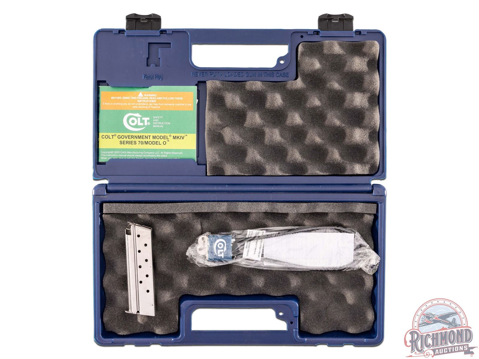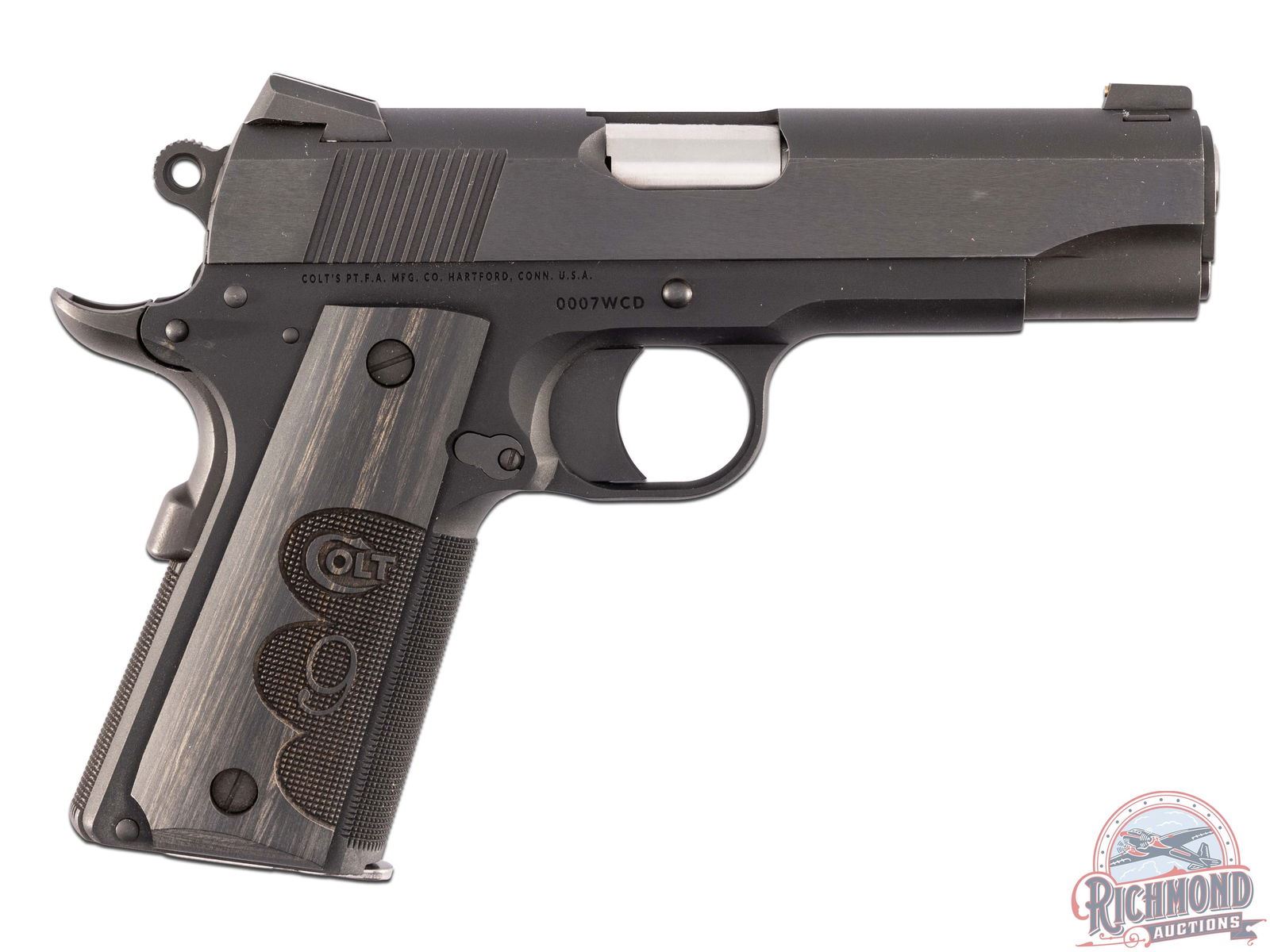 A Talo Exclusive manufactured in 2017 and designed by the famous gun writer, Wiley Clapp. This Colt 70 Series 1911 features a 4-1/4" barrel with Novak rear adjustable wide notch sight and blade with brass bead front sight. Black anodized finish with a polished blued slide. Manual thumb safety as well as a grip safety. Textured front and back grip straps and fitted with "Colt 9" engraved gray laminate wood grips. Comes in the original Colt factory hard case with (2) 9-round magazines, cable lock and factory paperwork. CALIBER: 9mm. S/N: 0007WCD. FFL STATUS: Modern.