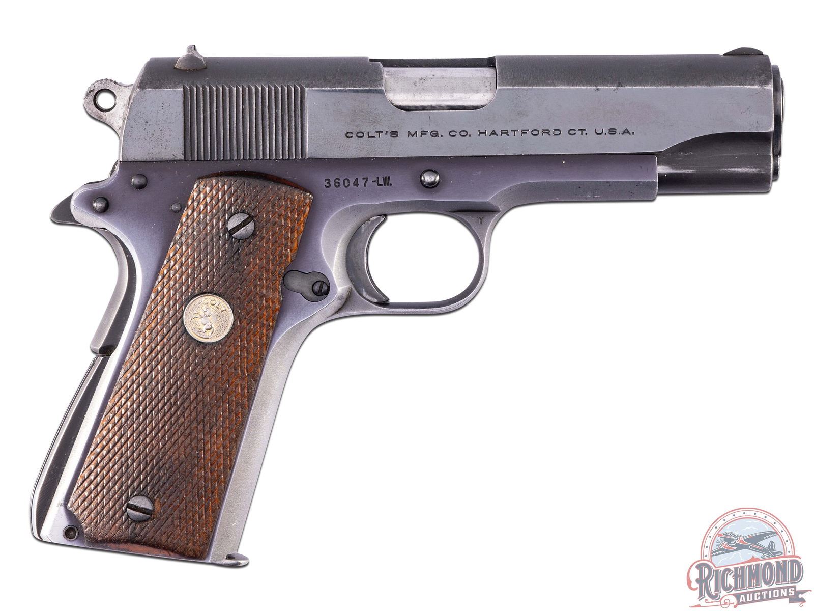 Manufactured in 1955, this is a highly sought after early production Lightweight Commander. Features a Colt factory stamped 4-1/4" barrel. High polished blued slide with iron sights and early stampings. Left side "COMMANDER MODEL / COLT / SUPER .38 AUTOMATIC / Rampant Colt". Right side is stamped with the single line address. "Coltalloy" aluminum frame giving it its Lightweight moniker. Blued finish on the sides of the frame with satin aluminum finish on the bottom and grips of the frame. Standard 1911 safety features, manual thumb and grip safety. Includes a Colt factory 9-round magazine. Fitted with factory Colt checkered walnut grip panels with gold tone Colt medallions. CALIBER: 38 Super. S/N: 36047-LW. FFL STATUS: Curio & Relic.