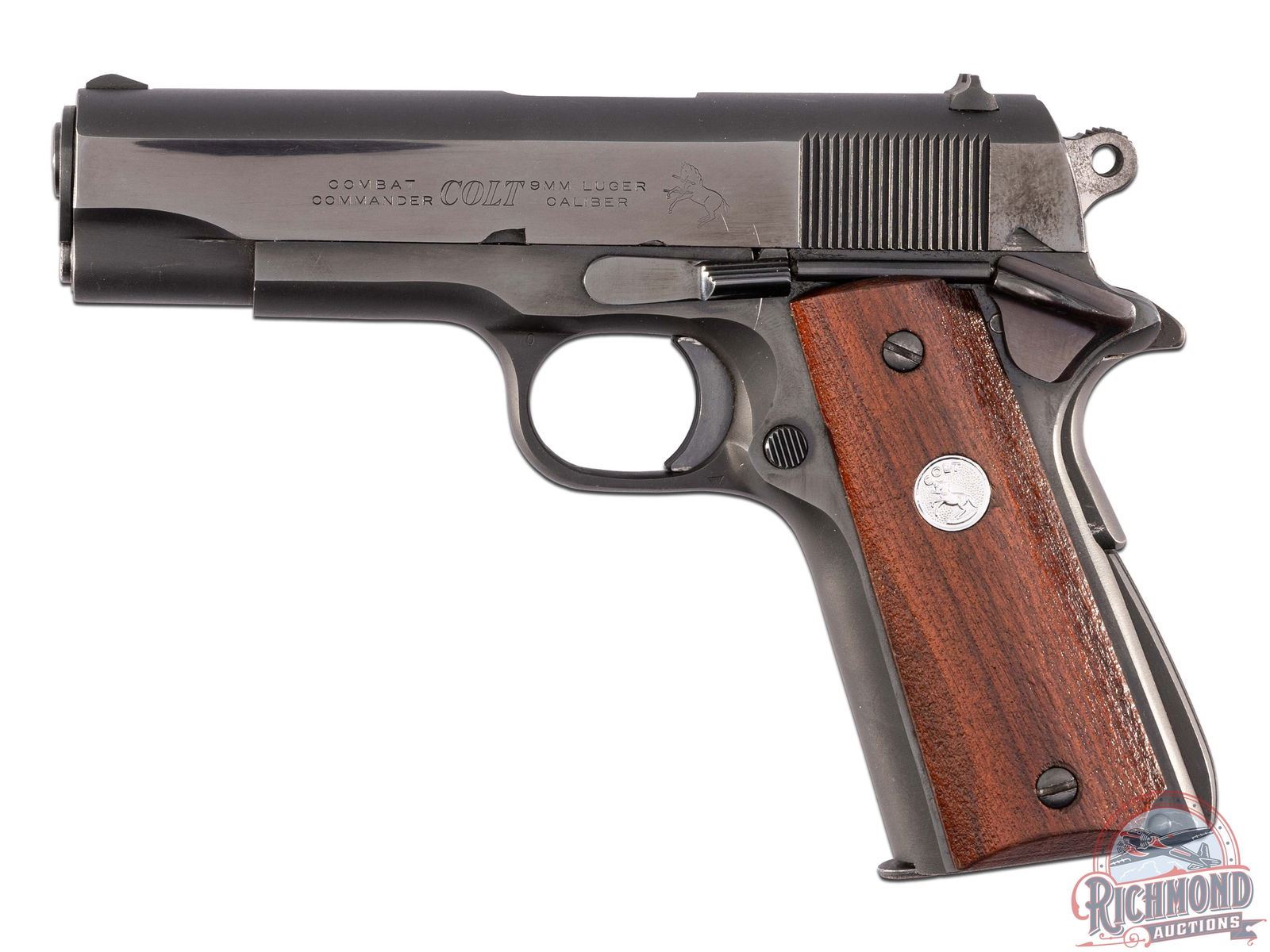 Manufactured in 1975. This nice Combat Commander features a 4-1/4" barrel and iron sights. Left side of slide is stamped "COMBAT COMMANDER / COLT / 9MM LUGER CALIBER" with the Rampant Colt. Right side of the slide is stamped "COLT'S COMBAT COMMANDER" with a single line Colt address on the frame above the serial number. Finished in a satin black throughout the frame and polished blue slide. Chambered for the popular 9mm Luger with a 9-round factory Colt magazine. Manual thumb safety and grip safety. Serrated trigger and back strap. Fitted with factory walnut grips with silver tone Colt medallion. CALIBER: 9mm. S/N: 70BS33861. FFL STATUS: Modern.