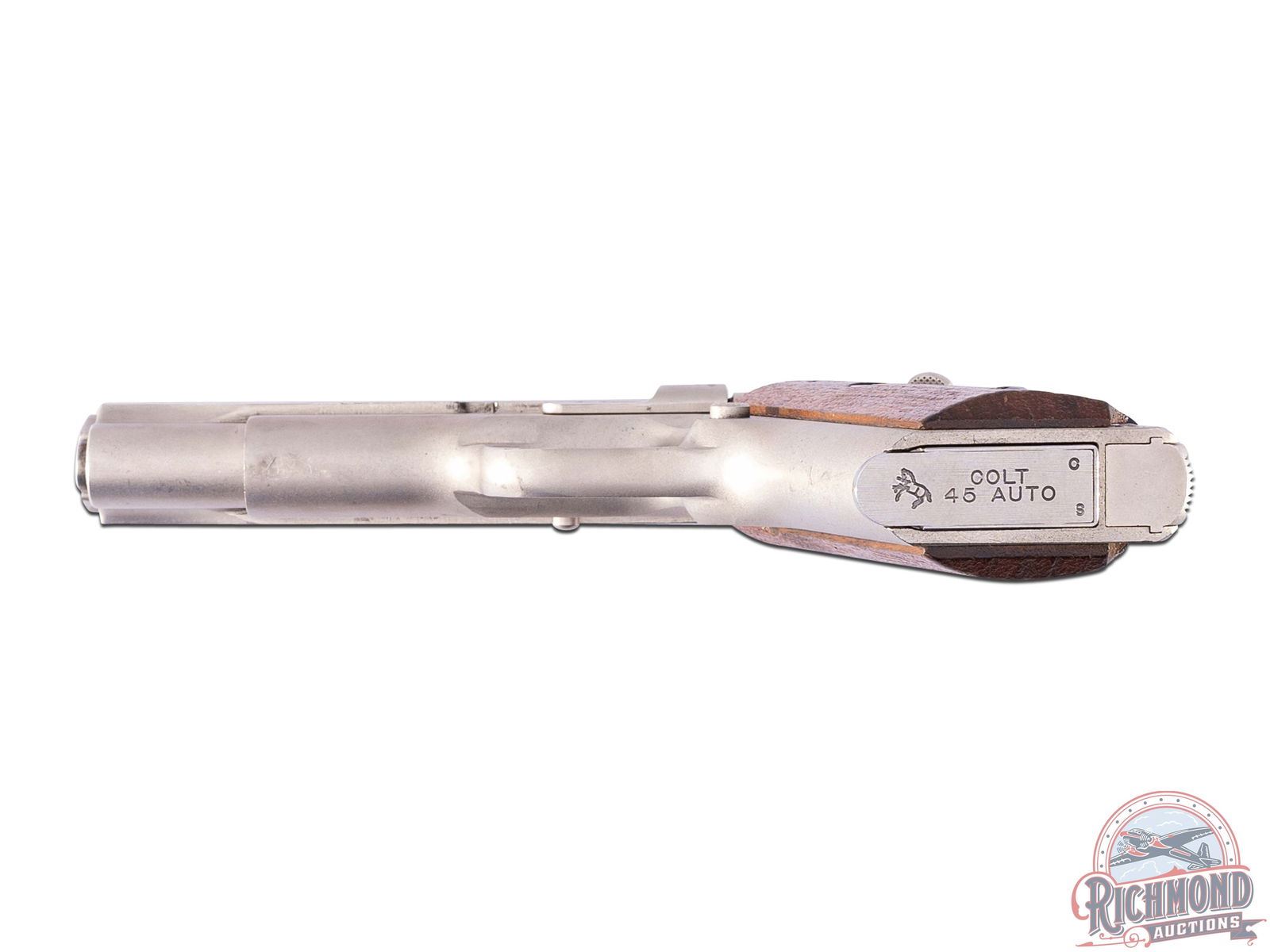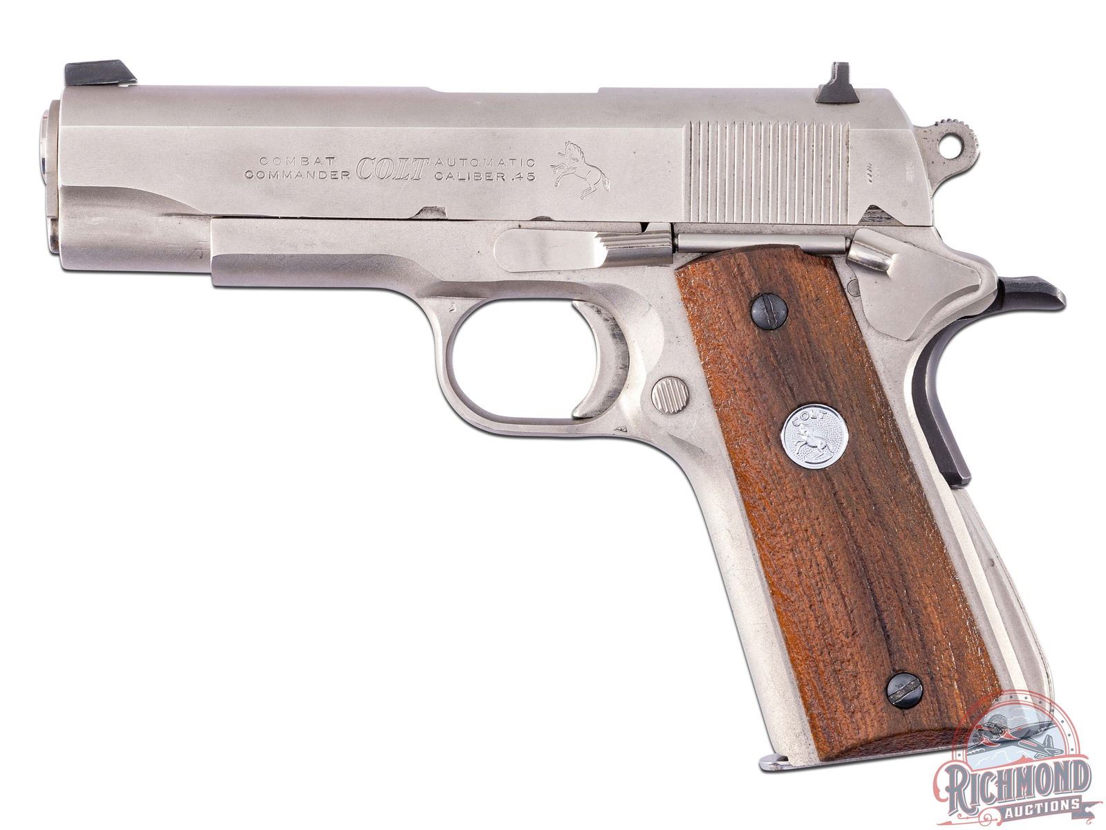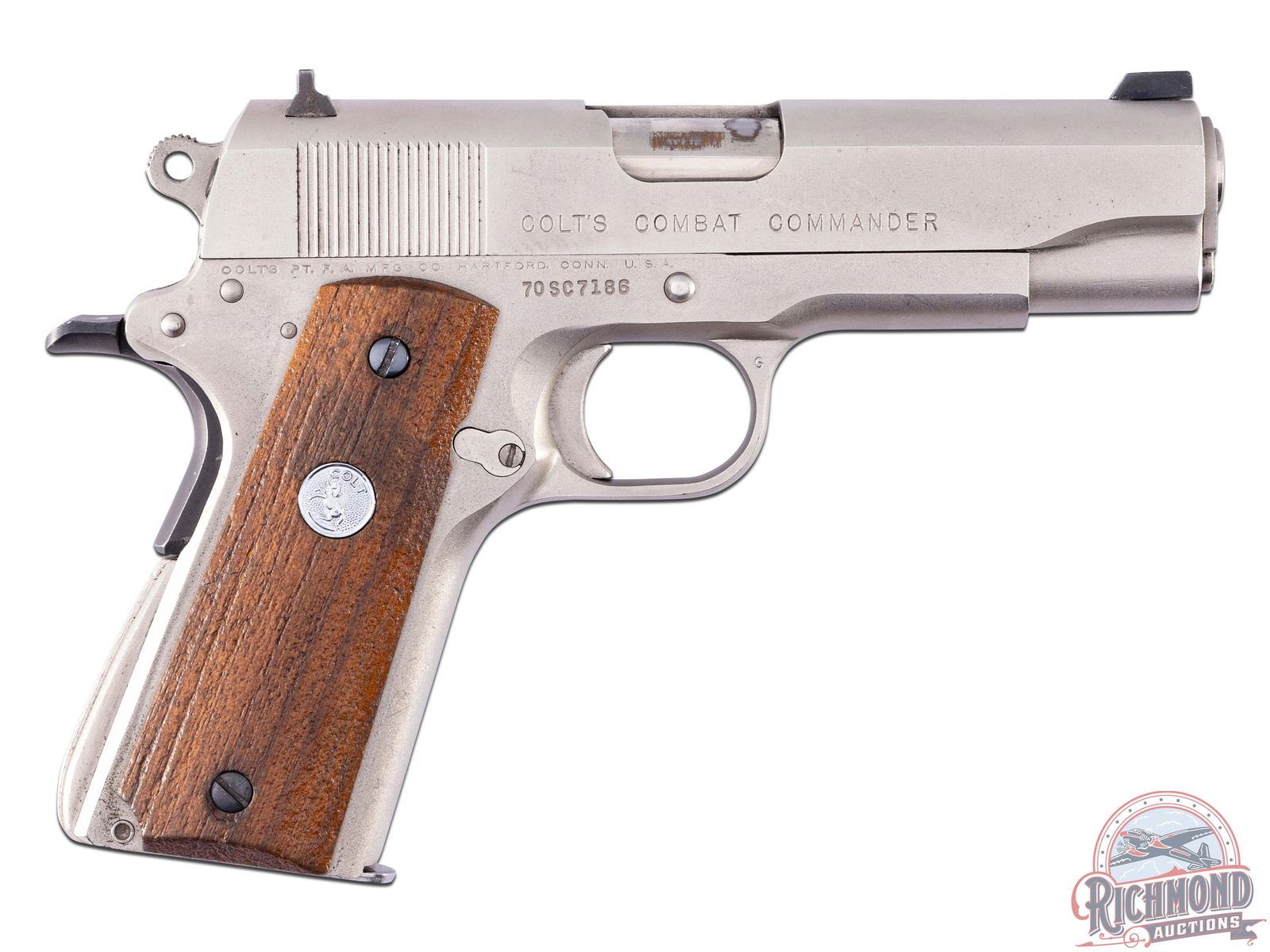 Manufactured in 1974. This Combat Commander features a 4-1/4" barrel 3-dot sights. Left side of slide is stamped "COMBAT COMMANDER / COLT / AUTOMATIC CALIBER 45" with the Rampant Colt. Right side of the slide is stamped "COLT'S COMBAT COMMANDER" with a single line Colt address on the frame above the serial number. Finished in a satin nickel throughout. Chambered for the powerful 45 ACP with a 7-round factory Colt magazine. Manual thumb safety and grip safety. Serrated trigger and back strap. Fitted with factory walnut grips with silver tone Colt medallions. CALIBER: 45 ACP. S/N: 70SC7186. FFL STATUS: Curio & Relic.