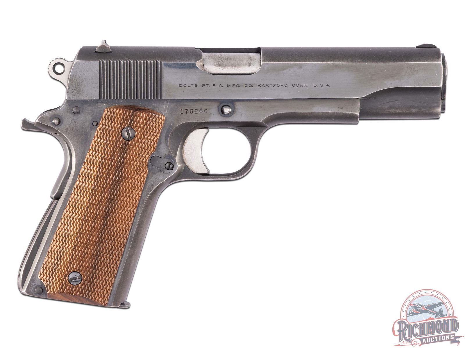 Manufactured in 1965. This Super 38 features a 5" factory barrel with period correct iron sights. Full size 1911 with a blued finish chambered for the .38 Super Auto cartridge. Left side of the slide is stamped "COLT / SUPER .38 / AUTOMATIC" with Rampant Colt logo. Manual thumb safety and grip safety. Fitted with checkered walnut grip panels. Includes Colt factory 8 round magazine. CALIBER: 38 Super. S/N: 176266. FFL STATUS: Curio & Relic.