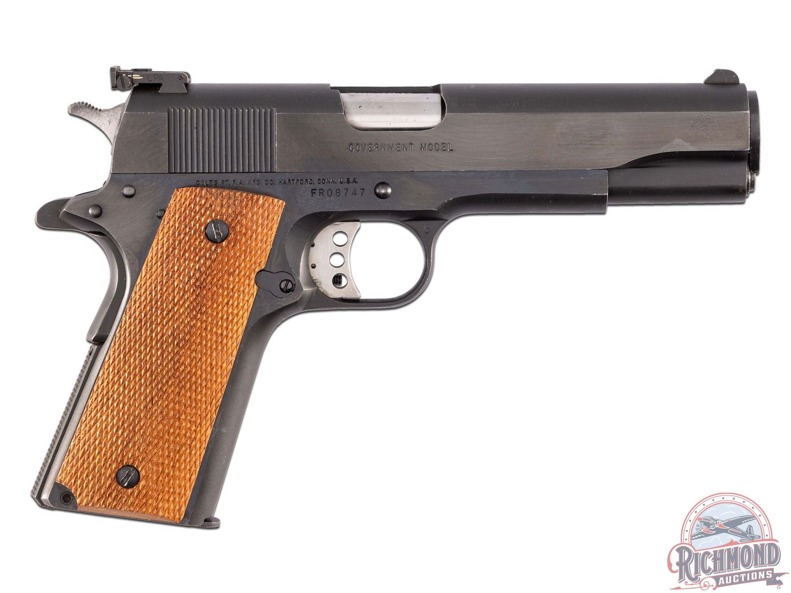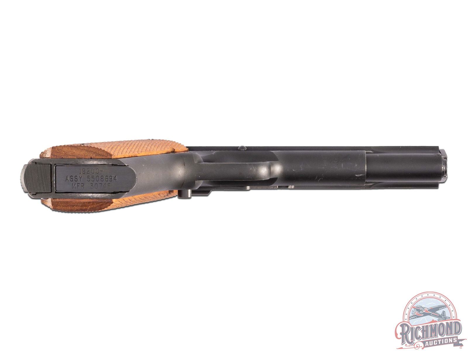 Manufactured in 1991. Features a 5" barrel with target style rear adjustable sight and white dot front sight. Blued two tone finish with a high polished slide. Skeletonized aluminum trigger with the Series 80 firing pin safety. Manual thumb safety and grip safety. Textured back strap for a steadier grip. Fitted with walnut checkered grip panels in a matte finish. Includes an 8 round magazine. CALIBER: 45 ACP. S/N: FR08747. FFL STATUS: Modern.