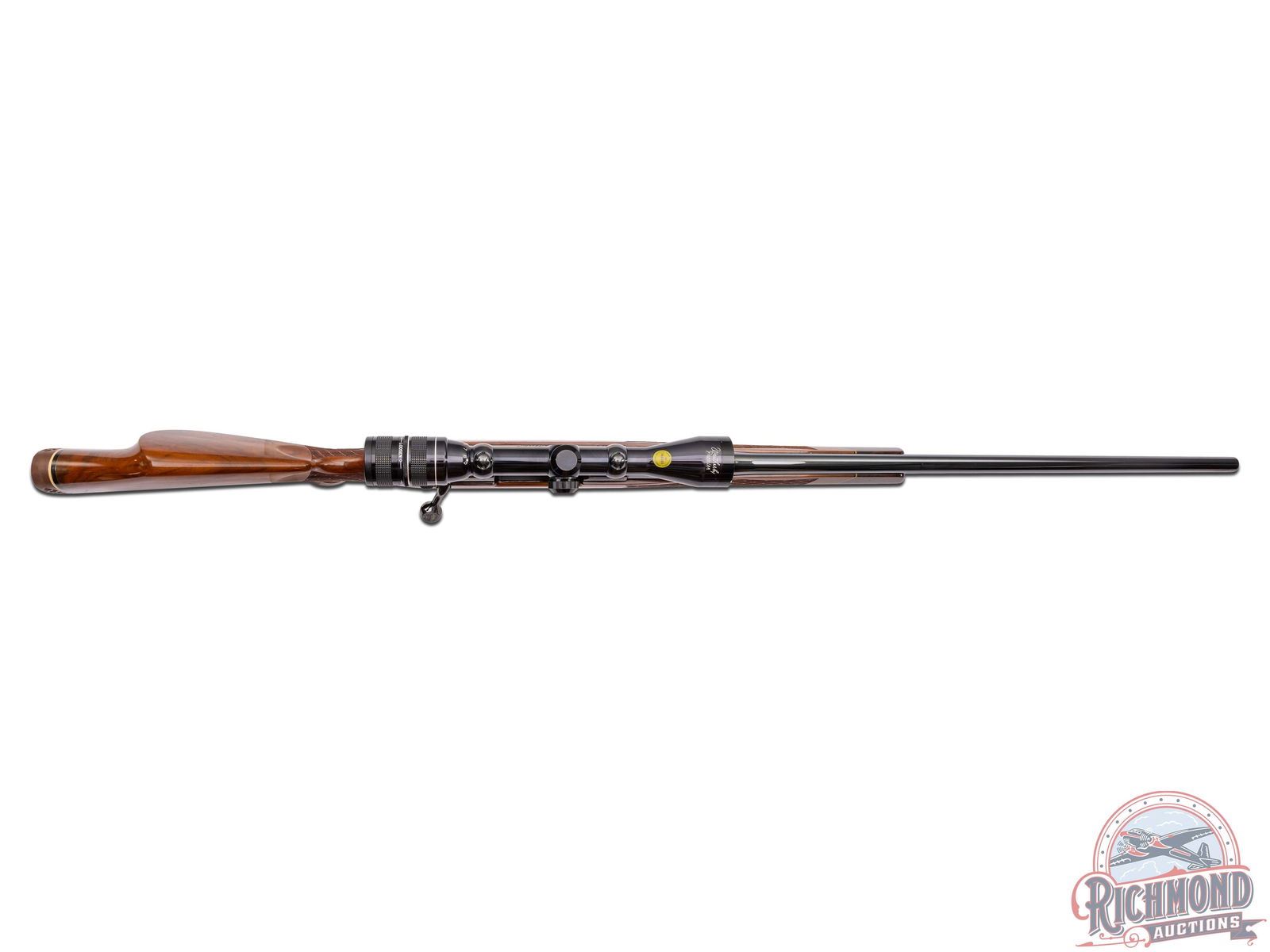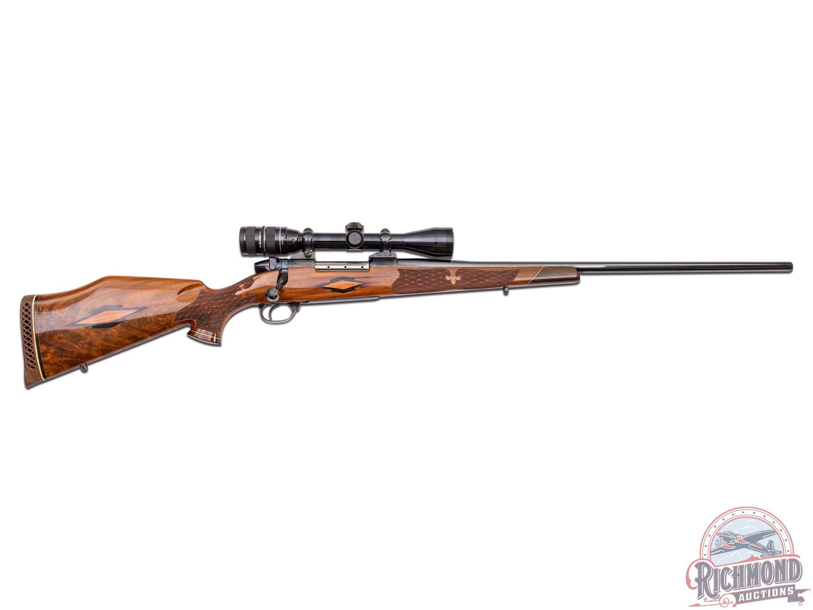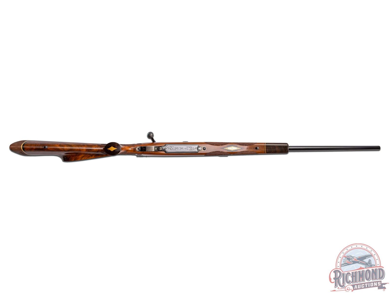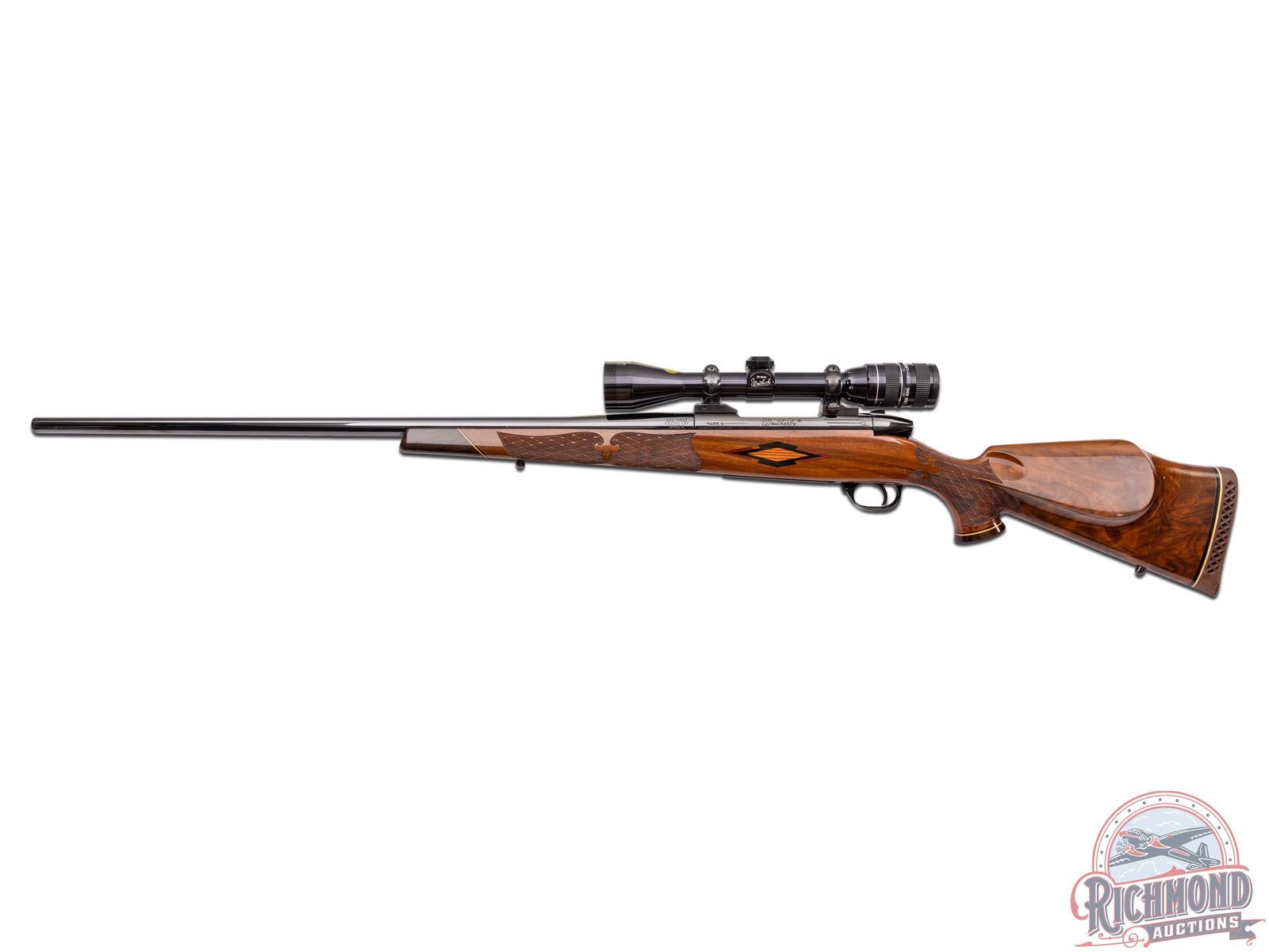 Custom made for Weatherby in Japan in 1986. Features a 26" blued sightless tapered barrel. Blued receiver equipped with a factory Weatherby 3X-9x40 scope mounted on Buehler scope rings. Blued hinged floorplate has custom engraved floral border surrounding script initials "VMK". Two position safety with jeweled bolt and follower and knurled bolt knob. Heavy grain factory Weatherby walnut Monte Carlo style stock with contrasting dark walnut forearm tip and pistol grip cap. Pistol grip features a white diamond inlay. Skip-line hand checkering with fleur-de-lis border. Bottom of foregrip and both sides of the receiver feature a diamond tri-wood inlay consisting of ebony, rosewood and birch. Bottom of the forearm inlay features a gold engraved inlaid vanity plate with the initials "VMK". Right side of the stock has a larger scale matching diamond tri-wood inlay. Factory sling studs. Fitted with a Weatherby brown ventilated recoil pad. LOP: 13-1/2". CALIBER: 378 WBY MAG. S/N: H142049. FFL STATUS: Modern.