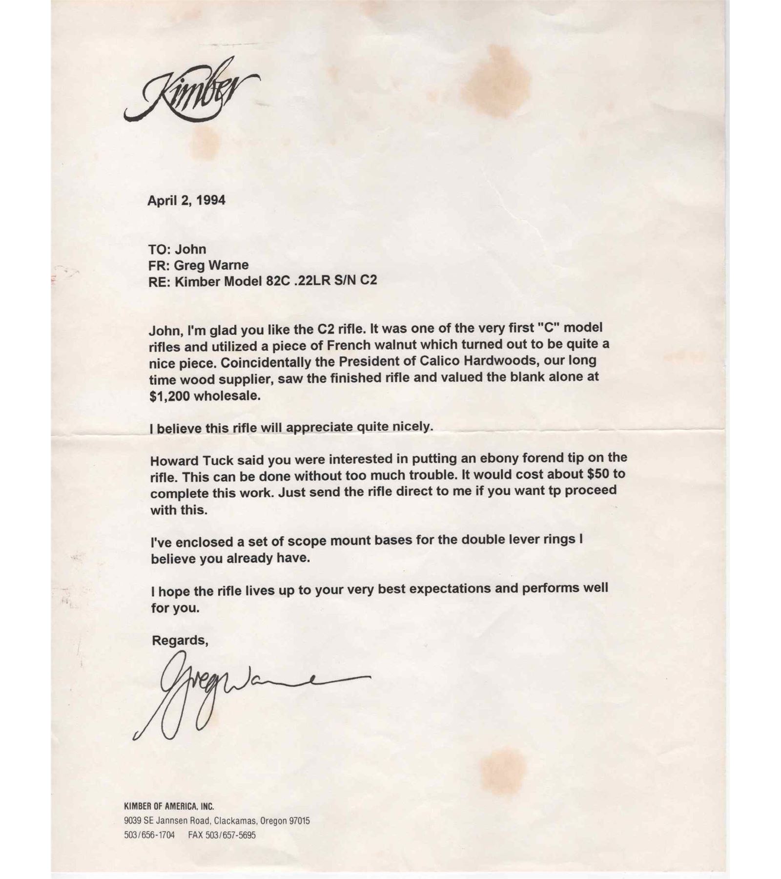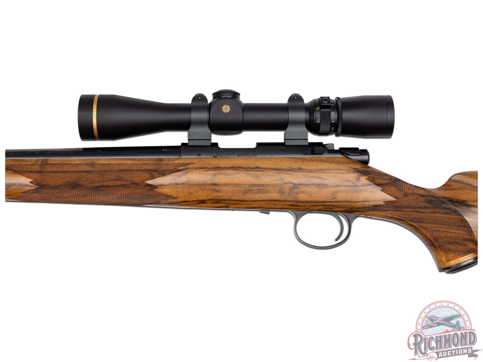 RARE serial #2 manufactured in 1993 or early 1994 after Greg Warne reopened the company. This classic rifle features a 22" blued tapered, sightless barrel. Barrel is stamped "KIMBER OF AMERICA INC CLACKAMAS, OREGON USA" and "22LR" near the action. Mauser style action is stamped "C2", "KIMBER MODEL 82". Equipped with a Leupold Vari-X III 2.5x8 scope. Includes factory 5-round detachable magazine. One piece Calico made French walnut stock with hand-checkered pistol grip and forearm. Blued pistol grip cap. Fitted with a factory black rubber recoil pad and swivel studs. Comes with the original box and shipping box. Personal letter signed by Greg Warne on Kimber letterhead, to original buyer is also included confirming wood stock configuration. LOP: 13-1/2". CALIBER: 22LR. S/N: C2. FFL STATUS: Modern.