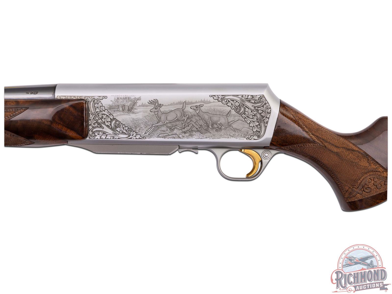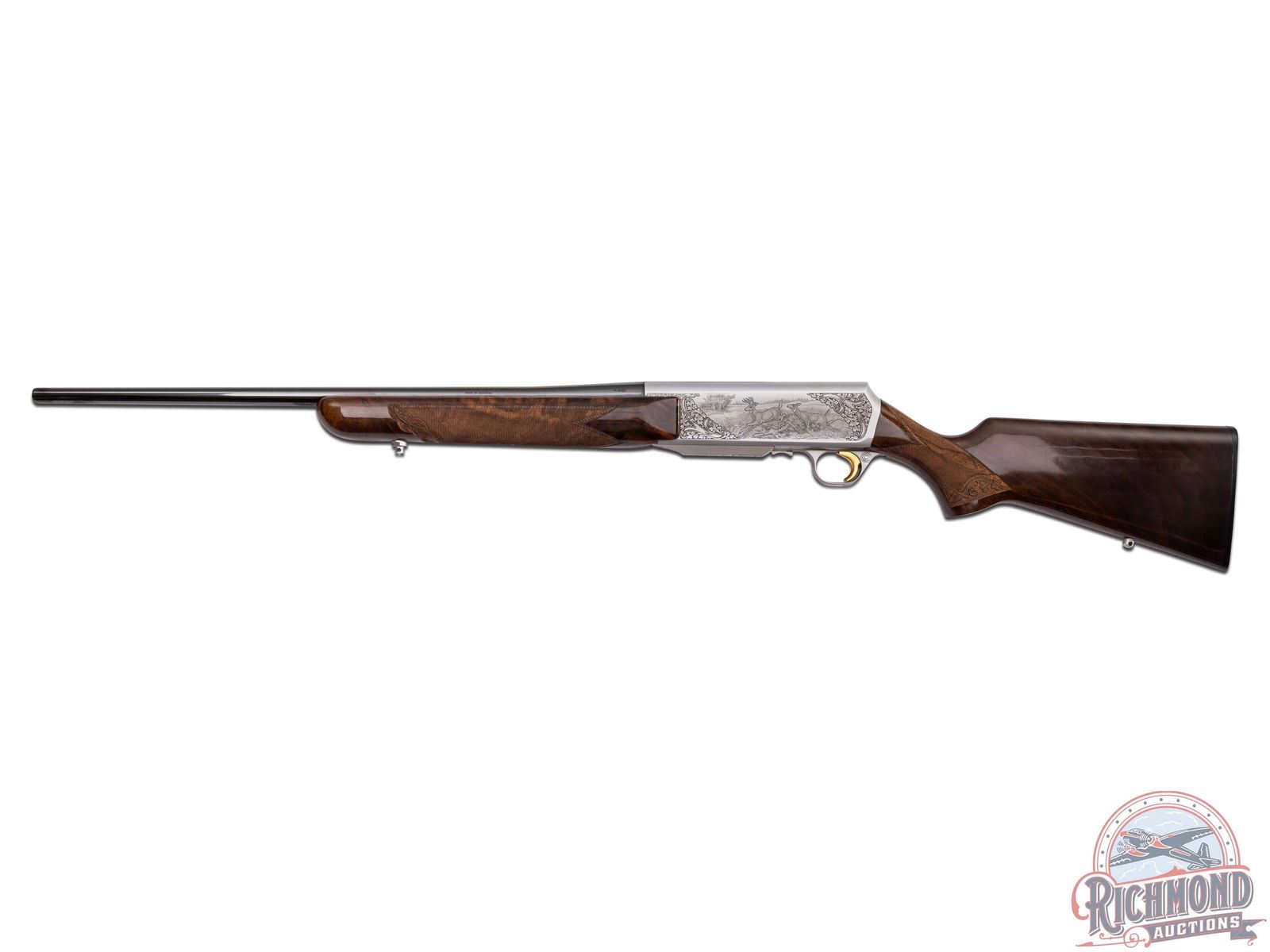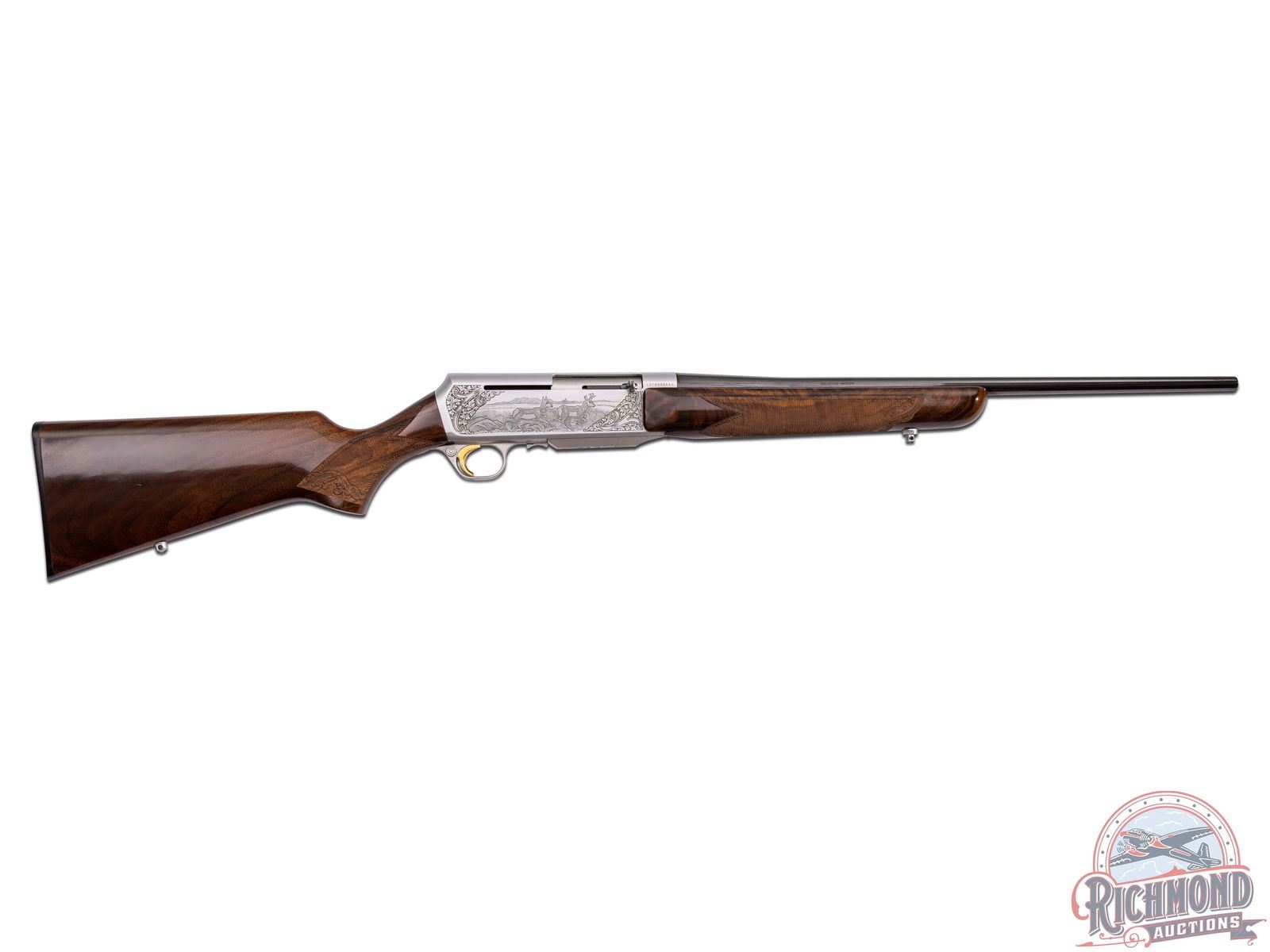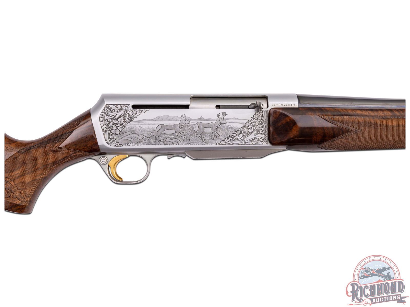 Made in Herstal, Belgium by Browning in 1980. 22" blued sightless round tapered barrel with Browning Utah and Montreal addresses on 270 Winchester caliber. Satin finish engraved receiver with antelope scene on right and deer scene on left and floral detachable magazine scene. Receiver is engraver signed on left with "J. Bague". Action is factory drilled and plugged with screws for scope mounting and has gold washed trigger and matching detachable magazine. Walnut checkered pistol grip stock with leaf and chain carved border with "Browning" hard rubber butt plate. Matching walnut checkered forearm with floral and chain carved border. Stock is fitted with satin finished quick detachable sling swivel studs. LOP: 13-5/8". DAC: 1-5/8". DAH: 2". CALIBER: 270 Winchester. S/N: 437PM02549. FFL STATUS: Modern.